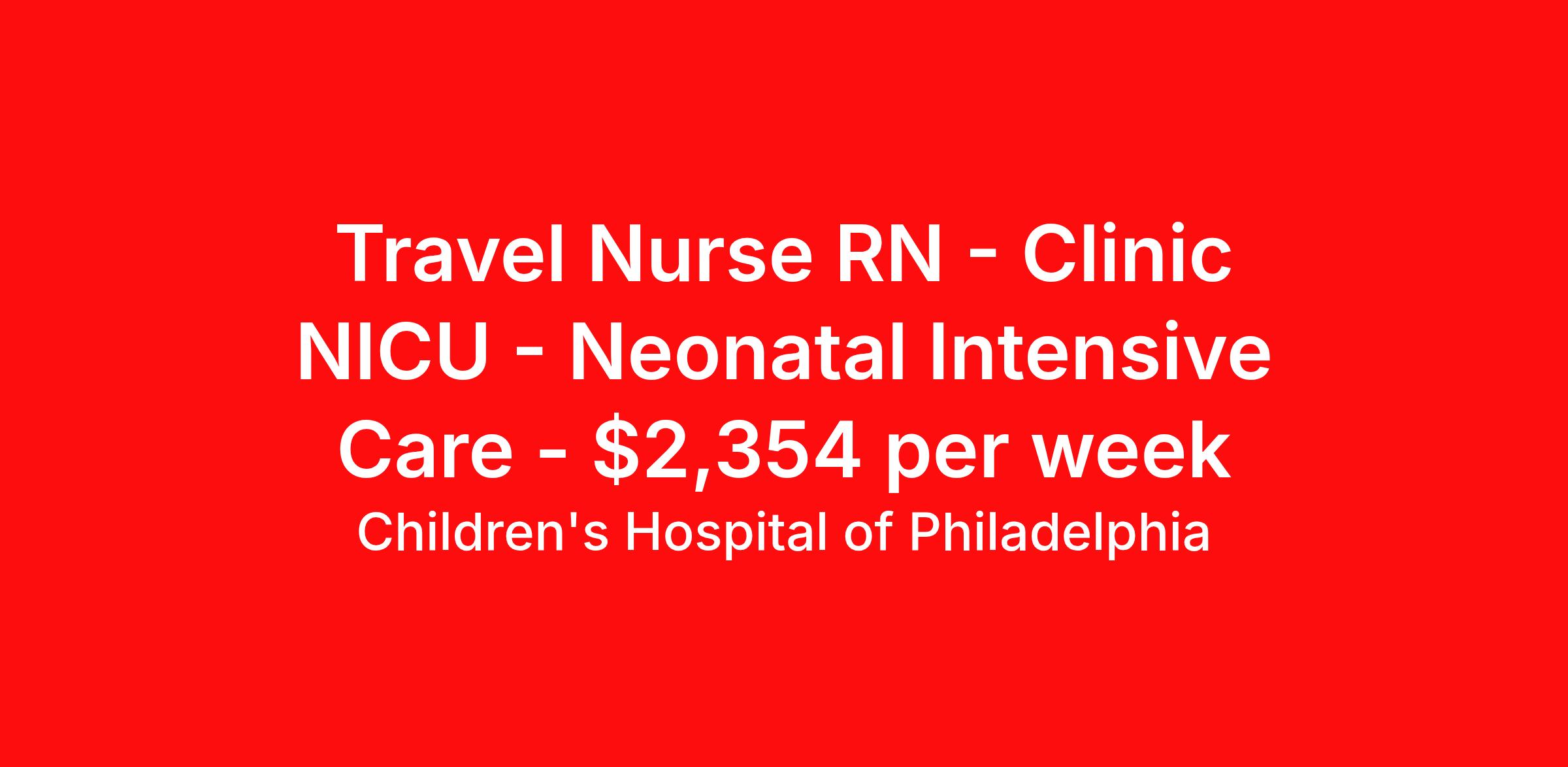 Children's Hospital of Philadelphia is seeking a travel nurse RN Clinic NICU - Neonatal Intensive Care for a travel nursing job in Philadelphia, Pennsylvania. Job Description & Requirements Specialty: NICU - Neonatal Intensive Care Discipline: RN Duration: 13 weeks 36 hours per week Shift: 12 hours, flexible Employment Type: Travel This contractor will be rotating between Main Campus and KOP depending on needs. Please make sure this is conveyed to the candidates. Please see full job description attached. The Clinical Nurse practices at the level of an advanced beginner to expert practitioner of professional nursing in accordance with, and guided by the CHOP Nursing Professional Practice Model. The nurse at this level demonstrates competence in caring for patients and families and progresses to caring for those with the most complex problems/highest acuity in the designated clinical area. Provides age/developmentally appropriate care. Care is delivered through RN leadership for patient care within the framework of family-centered care. The Clinical Nurse adheres to the organizational and nursing department mission, vision, and values. S/he practices in accordance with the ANA Code of Ethics; the ANA Standards of Clinical Nursing Practice; practice standards of applicable specialty nursing organizations; and CHOP developed standards of nursing practice. The professional nurse practices within the defined scope of practice designated by the Nurse Practice Acts of Pennsylvania and/or New Jersey, depending on the assigned work site. Clinical Practice • Follows the nursing process to deliver safe, compassionate, and culturally effective care. • Gathers and recognizes/synthesizes assessment data to determine the patient/family plan of care, pertinent data to be shared with care team, and tasks to be delegated. • Recognizes and/or seeks resources to recognize clinical changes that are indicative of patient deterioration; utilizes the CAT team when appropriate. • Collaborates with the patient, family and multidisciplinary team to coordinate all facets of patient care. • Develops, implements and/or revises the patient’s plan of care on admission and during the course of the hospitalization. Plans of care are outcomes focused and include goals as well as required interventions. Plans are developed in partnership with the patient, family, and the interdisciplinary careteam. • Care is coordinated across the continuum – understands and utilizes case management resources. • Consistently follows evidence based practice bundles and nursing standards/procedures to provide nursing care that eliminates preventable events of patient harm and promotes excellent patient outcomes. • Recognizes and addresses situations which present ethical dilemmas and/or moral distress. Takes steps to actively address the situation. Seeks resources as needed to resolve the situation. • Demonstrates competence in teaching patients/families and progresses to an expert educator of patients/families. • Evaluates and documents the care provided on each assigned shift. • Accountable for the rapid adoption and implementation of clinical practice changes into own practice. Additional Technical Requirements Computer CompetencyBasic use of a computer (mouse, keyboard, printer, USB ports). Basic use of Microsoft Office (Word processing, spreadsheets, presentations and Skype). Web browsing, intranet search, document access. Use of shared network file space. Basic use of patient facing technology (e.g. IV pumps, point of care devices, CR monitors). Navigation and use of clinical communication systems. Information LiteracyDetermines the nature and extent of clinical information needed and uses the appropriate technology to access it. Accesses needed information effectively and efficiently. Evaluates information and its sources critically and appropriately incorporates it into clinical practice. Evaluates outcomes of the use of information. Information Management LiteracyNavigation of the electronic health record system. Ability to locate and review specific patient data in various clinical information systems. Effectively uses clinical decision support tools. Understands policies and procedures, confidentiality, security, and privacy regulations regarding the use of clinical information systems. Ability to collect clinical data using quality improvement tools. Respiratory Fit Testing Required Licenses, Certifications, Registrations CPR Certification issued through an organization that requires a hands-on instructor lead psychomotor skills verification (ex.American Heart Association or Red Cross) Registered Nursing License or active Temporary Practice Permit in the Commonwealth of Pennsylvania or State of New Jersey, depending on the assigned work location. Multistate Compact License (including the state of PA) is accepted in lieu of the PA RN license. If practicing with an active temporary practice permit, obtains an RN license prior to the expiration of the practice permit. PALS certification required Required Education and Experience Required Education: Nursing Diploma Required Experience: At least one (1) year of RN experience in specialty unit and pediatrics. Preferred Education, Experience & Cert/Licenses Preferred Education: BSN Preferred Licenses/certificates/registrations: Active membership in a professional nursing organization. RightSourcing (a part of Magnit) expected pay package may vary and/or include certain benefits like: Stipends (for clinical traveler workers only), Medical, Dental, Vision, 401K QUALIFICATION/LICENSURE Work Authorization : US Citizen Preferred years of experience : 1 years Travel required : No travel required Shift timings : VARIED Children's Hospital of Philadelphia Job ID 37065236. Pay package is based on 12 hour shifts and 36 hours per week (subject to confirmation) with tax-free stipend amount to be determined. Posted job title: Clinical Nurse-NICU-PICU-Float