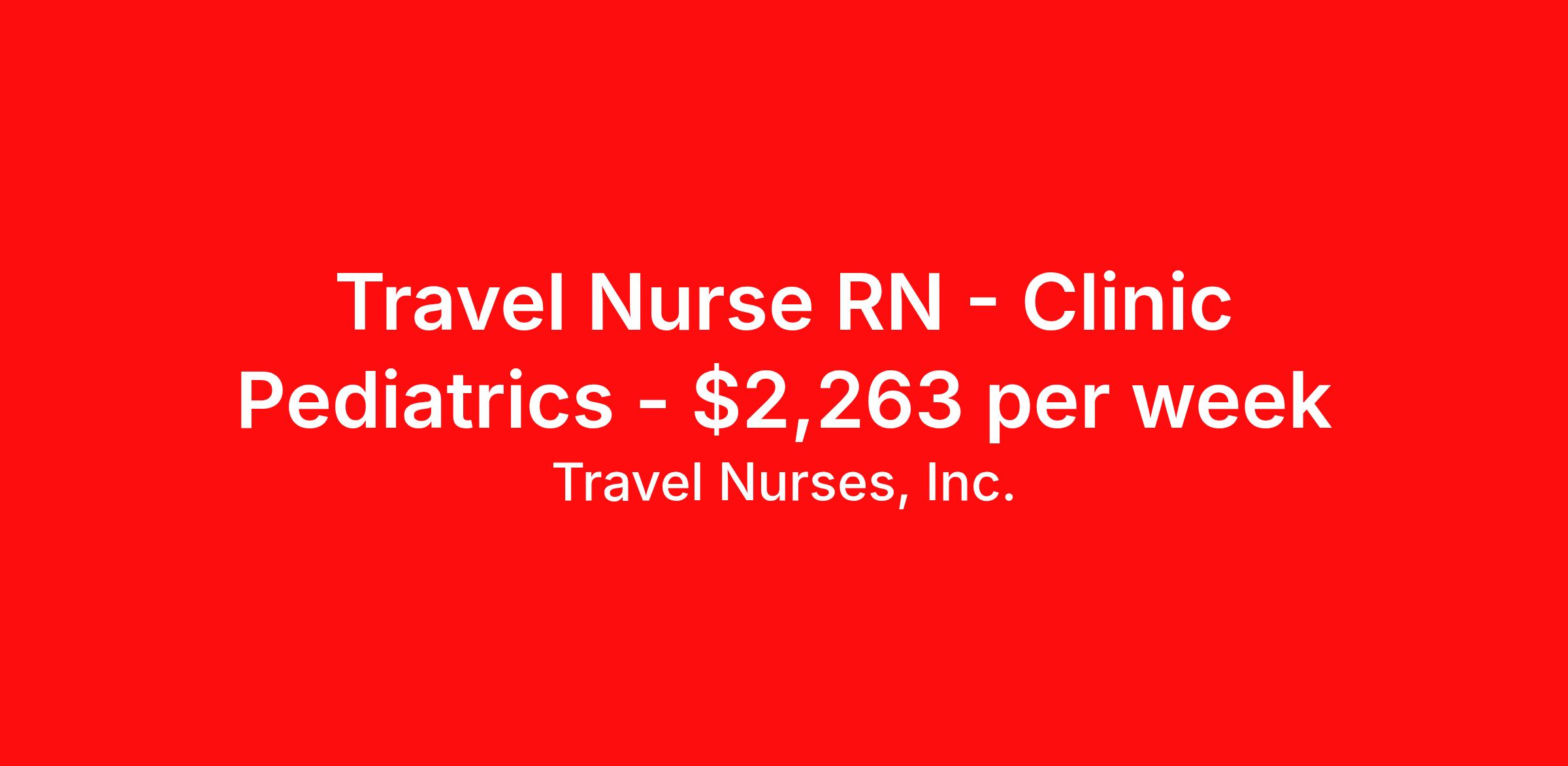 Travel Nurses, Inc. is seeking a travel nurse RN Clinic Pediatrics for a travel nursing job in Glenwood Springs, Colorado. Job Description & Requirements Specialty: Pediatrics Discipline: RN Start Date: 05/05/2026 Duration: 13 weeks 38 hours per week Shift: 12 hours Employment Type: Travel Travel Nurses, Inc. Job ID 306777. Pay package is based on 12 hour shifts and 38 hours per week (subject to confirmation) with tax-free stipend amount to be determined. Posted job title: CO-Clinic RN Pediatrics About Travel Nurses, Inc. Travel Nurses, Inc. is a leading healthcare staffing agency that provides healthcare professionals with opportunities to work across the country. Founded by nurses in 1988, TNI has more than 30 years of experience in the industry. The agency initially focused on staffing operating room settings in the MidSouth. However, this quickly evolved to encompass all nursing specialties and allied health fields nationwide. At the heart of our mission is a profound respect for nurses, whom we consider the cornerstone of healthcare. This acknowledgment extends beyond the nursing profession alone. Travel Nurses, Inc. now proudly embraces a wide array of healthcare professionals, recognizing their crucial roles in our collective mission. Travel Nurses, Inc. is dedicated to providing comprehensive support and opportunities that will help facilitate complete career mobility in the healthcare field. Our commitment to transparency ensures that all professionals, not just nurses, can confidently accept any assignment without financial uncertainties. We prioritize our professionals’ well-being with comprehensive benefits packages, including day-one healthcare coverage, competitive salaries, bonuses and incentives. This underscores our unwavering commitment to offering the best possible rewards and support for all the professionals we serve. Benefits Weekly pay Continuing Education 401k retirement plan Wellness and fitness programs Mileage reimbursement Referral bonus Employee assistance programs Medical benefits Dental benefits Vision benefits Benefits start day 1 License and certification reimbursement Life insurance Retention bonus