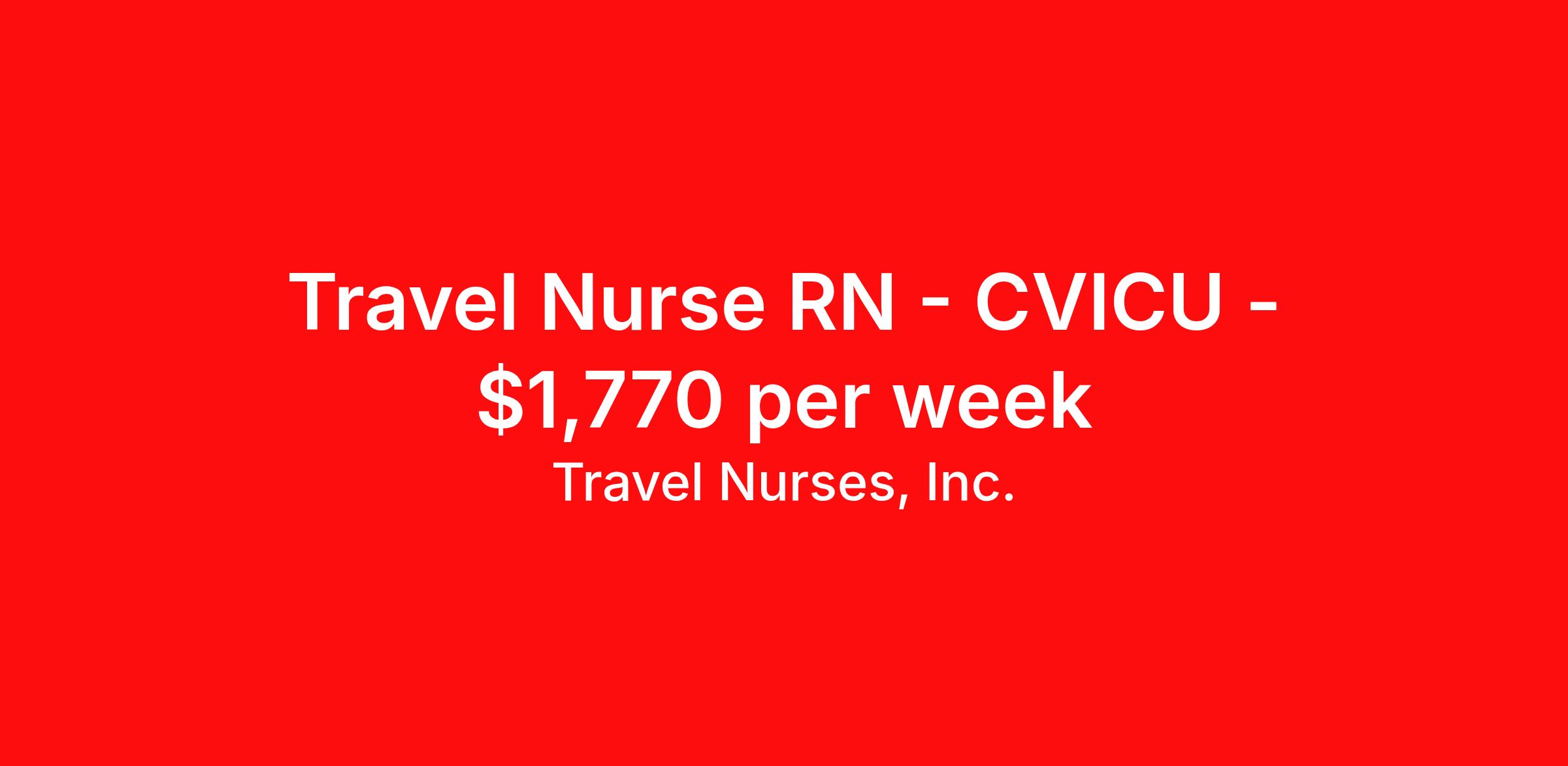 Travel Nurses, Inc. is seeking a travel nurse RN CVICU for a travel nursing job in Merriam, Kansas. Job Description & Requirements Specialty: CVICU Discipline: RN Start Date: ASAP Duration: 13 weeks 36 hours per week Shift: 12 hours Employment Type: Travel Travel Nurses, Inc. Job ID 302816. Pay package is based on 12 hour shifts and 36 hours per week (subject to confirmation) with tax-free stipend amount to be determined. Posted job title: Cardiovascular ICU (CVICU)/OHRU-RN-Travel About Travel Nurses, Inc. Travel Nurses, Inc. is a leading healthcare staffing agency that provides healthcare professionals with opportunities to work across the country. Founded by nurses in 1988, TNI has more than 30 years of experience in the industry. The agency initially focused on staffing operating room settings in the MidSouth. However, this quickly evolved to encompass all nursing specialties and allied health fields nationwide. At the heart of our mission is a profound respect for nurses, whom we consider the cornerstone of healthcare. This acknowledgment extends beyond the nursing profession alone. Travel Nurses, Inc. now proudly embraces a wide array of healthcare professionals, recognizing their crucial roles in our collective mission. Travel Nurses, Inc. is dedicated to providing comprehensive support and opportunities that will help facilitate complete career mobility in the healthcare field. Our commitment to transparency ensures that all professionals, not just nurses, can confidently accept any assignment without financial uncertainties. We prioritize our professionals’ well-being with comprehensive benefits packages, including day-one healthcare coverage, competitive salaries, bonuses and incentives. This underscores our unwavering commitment to offering the best possible rewards and support for all the professionals we serve. Benefits Weekly pay Continuing Education 401k retirement plan Wellness and fitness programs Mileage reimbursement Referral bonus Employee assistance programs Medical benefits Dental benefits Vision benefits Benefits start day 1 License and certification reimbursement Life insurance Retention bonus