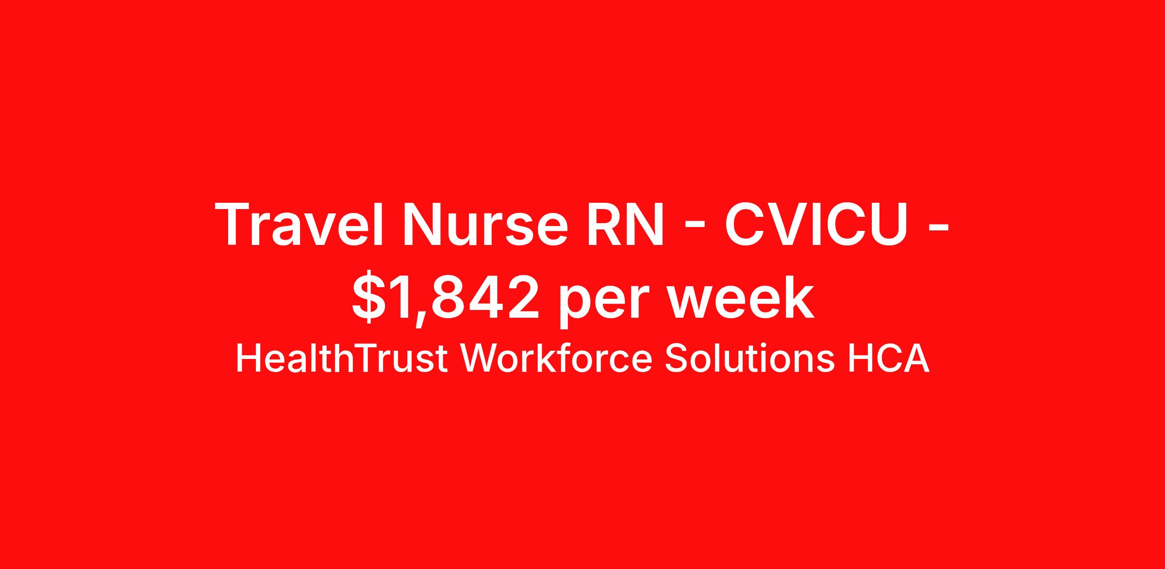 HealthTrust Workforce Solutions HCA is seeking a travel nurse RN CVICU for a travel nursing job in Fort Worth, Texas. Job Description & Requirements Specialty: CVICU Discipline: RN Start Date: 04/20/2026 Duration: 13 weeks 36 hours per week Shift: 12 hours, nights Employment Type: Travel About HealthTrust Workforce Solutions HCA At HealthTrust Workforce Solutions, healthcare is not just about the four walls of a facility but about the people who provide and receive care. Our focus is on empowering healthcare professionals to deliver exceptional patient experiences by providing them with the necessary skills, tools, and support. We partner with healthcare facilities nationwide to ensure that the right professionals are in the right roles. We prioritize our clinicians by giving them a voice and access to opportunities to fulfill their mission of improving lives by providing quality patient care. We are committed to our core values of Trust, Innovation, Adaptability, Courage, and Accountability. We are dedicated to positively impacting the healthcare industry by providing first-priority access to more than 200,000 jobs nationwide to our healthcare professionals. Join us and be part of the HealthTrust family, where you can make a difference every day. We embrace our changing environment, and we maintain a culture that has a rich tradition of transforming itself to meet the challenges of the future. MISSION STATEMENT While putting great people in the right roles is essential, our mission is far greater. We want our clinicians to be part of the HealthTrust family, where healthcare professionals have a voice and are empowered with the right tools and opportunities to fulfill their personal mission of improving lives. Plus, as a preferred partner to thousands of top-performing hospitals, we provide our healthcare professionals with first-priority access to more than 200,000 jobs nationwide. Benefits Dental benefits Vision benefits Referral bonus Continuing Education Life insurance