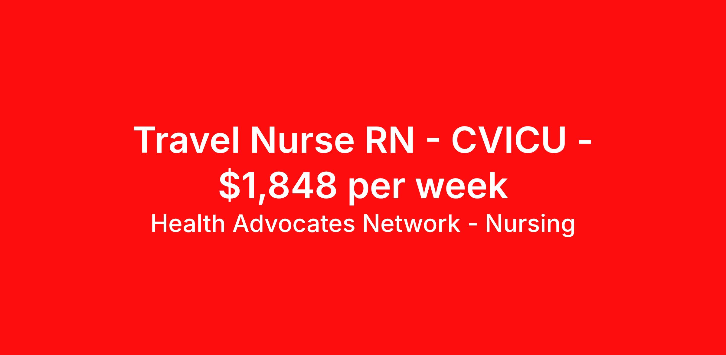 Health Advocates Network - Nursing is seeking a travel nurse RN CVICU for a travel nursing job in Austin, Texas. Job Description & Requirements Specialty: CVICU Discipline: RN Start Date: 04/12/2026 Duration: 12 weeks 36 hours per week Shift: 12 hours, nights Employment Type: Travel HANStaff Job ID 522425. Pay package is based on 12 hour shifts and 36 hours per week (subject to confirmation) with tax-free stipend amount to be determined. Posted job title: RN - CVICU About Health Advocates Network - Nursing Health Advocates Network was founded on the basis of a shared aspiration, to improve the way healthcare staffing is done. We are a company established and led by nurses. Our flexible approach enables us to develop solutions customized to your specific needs. From short- and long-term travel contracts to local and per diem assignments and more, we are here to get you to your next adventure! By solving challenges, providing the best placements, and advocating for you, we stand to help you thrive and pave the path forward in your career. Click on the videos below to learn more about our values!