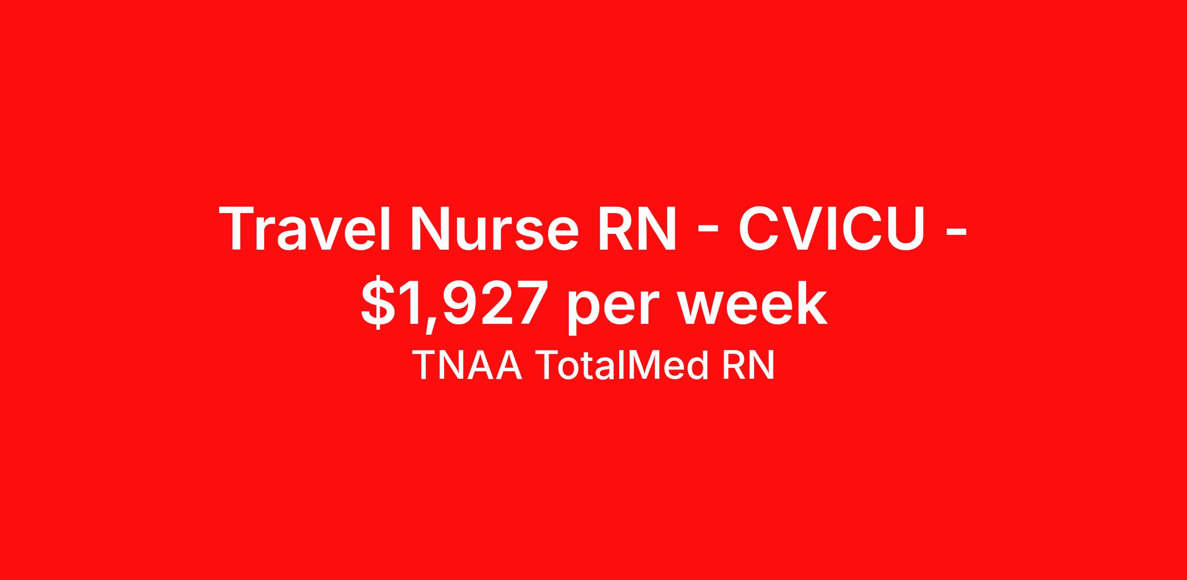 TNAA TotalMed RN is seeking a travel nurse RN CVICU for a travel nursing job in Tampa, Florida. Job Description & Requirements Specialty: CVICU Discipline: RN Start Date: 04/13/2026 Duration: 13 weeks 36 hours per week Shift: 12 hours, nights Employment Type: Travel We're looking for Cardiovascular Intensive Care Unit RNs for an immediate travel nurse opening in Tampa, FL. The right RN should have 1-2 years' recent acute care experience. Read below for more requirements. As a CVICU Travel Nurse, you will work with a diverse team of caregivers to administer care to patients following specialized procedures including open-heart surgery and heart transplants. Cardiovascular Intensive Care Unit RNs should have experience and skill caring for patients in a fast-paced, urgent and critical care environment. As a CVICU Travel Nurse, you should be prepared to perform the following tasks: Provide critical care to patients with potentially life-threatening heart conditions. Prepare and administer prescribed medications. Take samples for diagnostic tests; order, interpret and evaluate diagnostic tests. Apply hemodynamic, phlebotomy and IV protocols. Be called in for emergencies to provide CPR and operate defibrillators hospital-wide. Educate patients and family members on how to manage recovery at home. CVICU Travel Nurses should be able to stand and walk for long periods of time, as well as bend, lean and stoop without difficulty. RNs should be able to easily lift 20 pounds. Moving or lifting of patients may require lifting of up to 50 pounds at times. Because of the fast-paced environment, Cardiovascular Intensive Care Unit RNs must possess good skills for coping with stress and be able to relate to people of all ages and backgrounds. Requirements*: BLS, ACLS, NIH, 1 Year * Additional certifications may be required before beginning an assignment. TotalMed Travel Job ID 1395471. Pay package is based on 12 hour shifts and 36 hours per week (subject to confirmation) with tax-free stipend amount to be determined. Posted job title: Cardiovascular Intensive Care Unit - CVICU RN - Travel Nurse About TNAA TotalMed RN TotalMed is a Top Ten, travel nursing and healthcare staffing agency with the mission of igniting purpose in healthcare. The organization staffs nurses, therapists, pharmacists, and other clinicians of all specialties in all 50 states. They offer local and travel jobs and match caregivers with the right organization to assist both facilities and patients. As an organization, they focus on putting highly-skilled staff into facilities to ensure adequate staffing for a better patient experience. TotalMed specializes in recruiting and placing healthcare professionals in travel, PRN, and permanent positions across the country in Nursing and Allied Health. Throughout 2020, the organization filled roles at even the most short-staffed facilities during the most challenging time in healthcare. By matching the right travel healthcare professional with the right organization, TotalMed continues to offer a lifeline to facilities and their patients. Benefits Weekly pay Guaranteed Hours Continuing Education 401k retirement plan Sick pay Wellness and fitness programs Referral bonus Employee assistance programs Medical benefits Dental benefits Vision benefits Benefits start day 1