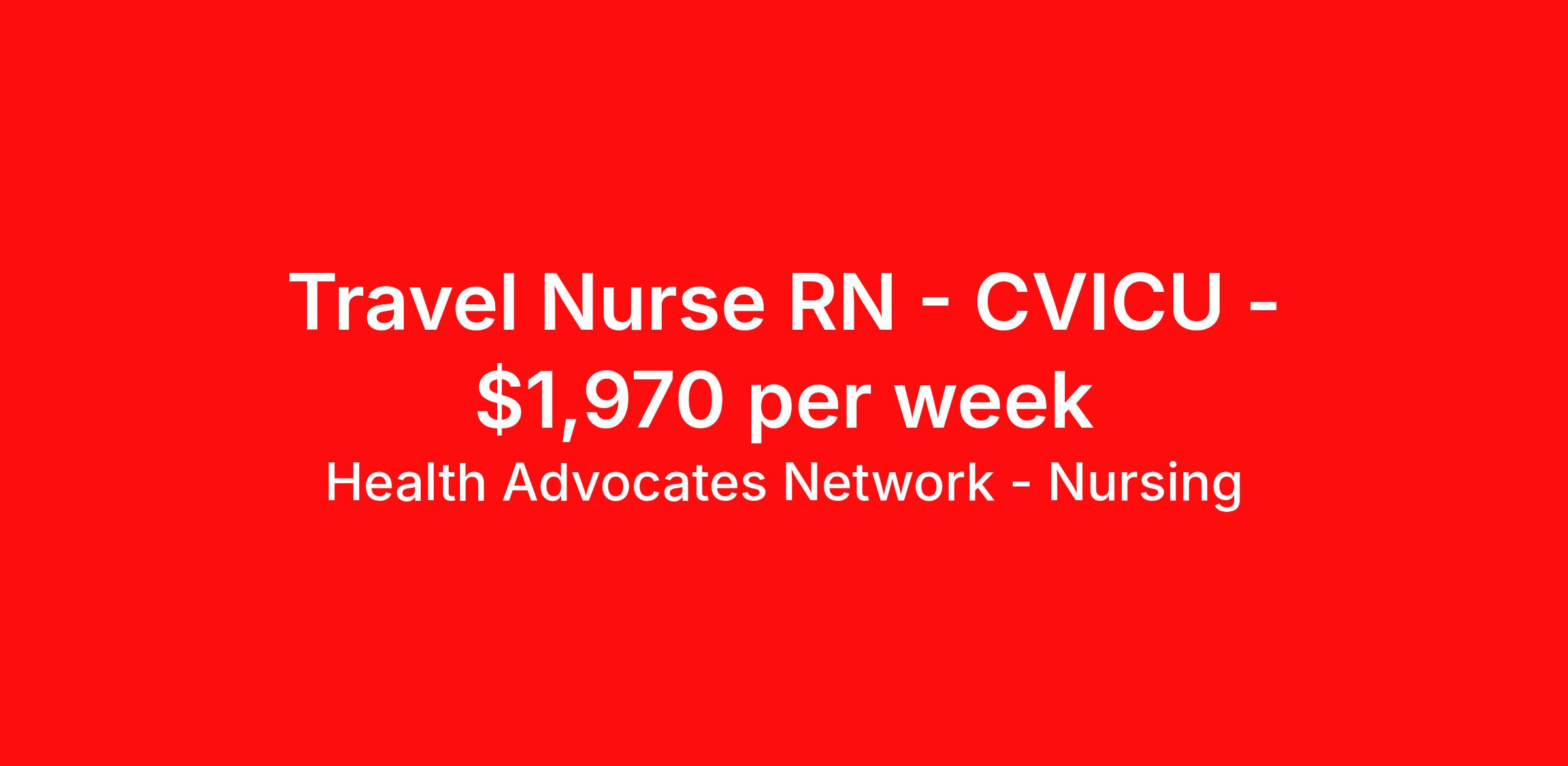 Health Advocates Network - Nursing is seeking a travel nurse RN CVICU for a travel nursing job in Evansville, Indiana. Job Description & Requirements Specialty: CVICU Discipline: RN Start Date: 04/13/2026 Duration: 12 weeks 36 hours per week Shift: 12 hours, nights Employment Type: Travel HANStaff Job ID 523060. Pay package is based on 12 hour shifts and 36 hours per week (subject to confirmation) with tax-free stipend amount to be determined. Posted job title: RN - CVICU About Health Advocates Network - Nursing Health Advocates Network was founded on the basis of a shared aspiration, to improve the way healthcare staffing is done. We are a company established and led by nurses. Our flexible approach enables us to develop solutions customized to your specific needs. From short- and long-term travel contracts to local and per diem assignments and more, we are here to get you to your next adventure! By solving challenges, providing the best placements, and advocating for you, we stand to help you thrive and pave the path forward in your career. Click on the videos below to learn more about our values!