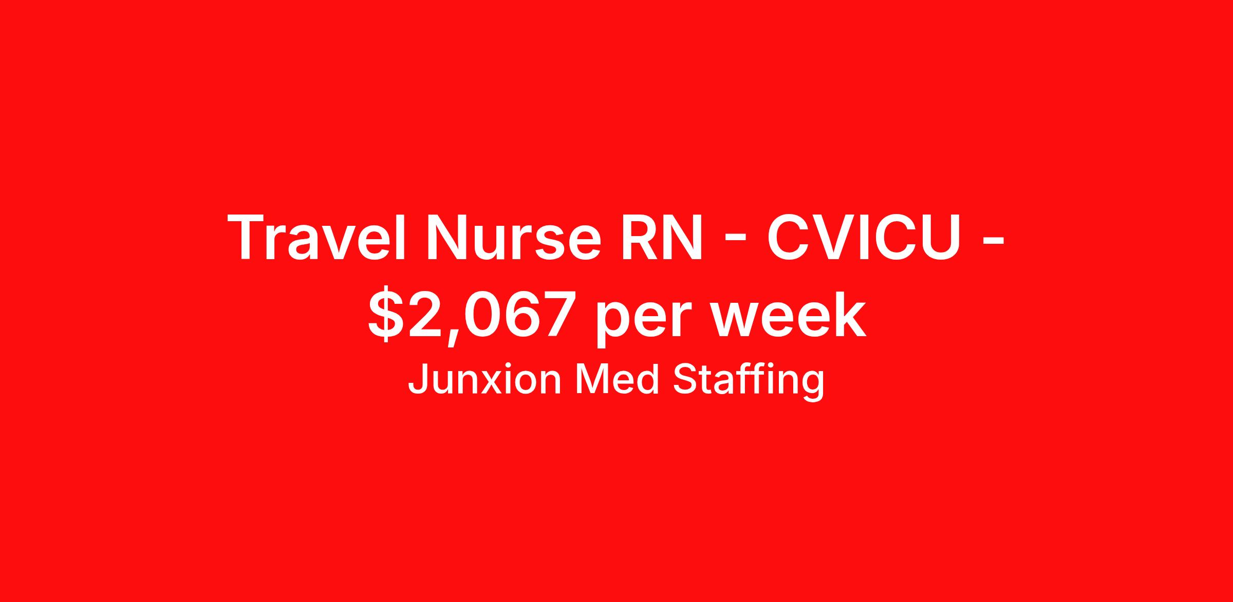 Junxion Med Staffing is seeking a travel nurse RN CVICU for a travel nursing job in Santa Fe, New Mexico. Job Description & Requirements Specialty: CVICU Discipline: RN Start Date: ASAP Duration: 13 weeks 36 hours per week Shift: 12 hours, nights Employment Type: Travel Summary: Junxion Med Staffing is looking for a CVICU RN to take an assignment in Santa Fe, New Mexico. This assignment lasts 13 WEEKS and is scheduled to start on March 9, 2026. If you don't like the start date, pay, or shift, then let’s talk. Give us a call opt 1 Job Details: Shift: 12H Nights Total Weekly Hours: 36 Certifications: BLS, Current New Mexico RN license or current Compact state license, BLS Certification from AHA, ACLS Certification from AHA, TNCC Trauma Level: Benefits: Day 1 Insurance Additional bonus potential for every contract Additional vacation incentives Medical insurance with no more than $175 monthly premium for employee Employee Assistance Program (EAP) Referral bonus up to $1,000 401K and access to financial advisors for financial wellness and education A dedicated recruiter and support team that will help you every step of the way to sure you start on time and have an exceptional experience An agency ran by a traveler for travelers Click here for licensing requirements About the Company: Junxion Med Staffing is an award-winning healthcare staffing company with a mission to provide quality healthcare to our communities. Apply today to speak with a recruiter! Awards: RNVIP- Top 10 Travel Nursing Agencies of 2024 BluePipes – The Best Travel Nursing Companies 2023 *Estimated weekly pay includes projected hourly wages and weekly meal and lodging per diems for eligible clinicians based on nationally published GSA rates. Actual weekly pay and per diems may differ from the amount shown and may be subject to change during an assignment. For all employees and employee applicants, Junxion Med Staffing is an Equal Employment Opportunity ("EEO") Employer, including Disability/Vets, and welcomes all to apply. Junxion Med Staffing Job ID 1359867. Pay package is based on 12 hour shifts and 36 hours per week (subject to confirmation) with tax-free stipend amount to be determined. About Junxion Med Staffing Junxion Med Staffing was founded by a former healthcare traveler who understands the challenges healthcare professionals face - because we’ve been there. We specialize in placing travel nurses, allied health professionals, physicians, physician assistants, and nurse practitioners in both short-term and permanent roles across a wide range of specialties. Whether you're looking for a travel contract or a long-term fit, we work to ensure the right match between each healthcare professional and facility. At Junxion, we keep it simple: ● Transparent communication. No surprises, no hidden details, just honest conversations so you always know what to expect. ● Dedicated support. From job search to contract negotiations and throughout your assignment, you’ll have a recruiter who’s with you every step of the way. ● Competitive pay and benefits. We advocate for you to be fairly compensated and supported in your goals. ● A focus on your success. When healthcare professionals feel valued and empowered, patient care improves and that’s what it’s all about. You’re not just a number here. You’re part of a team that actually cares. Let’s find your next great opportunity together. Benefits Weekly pay Referral bonus Dental benefits Vision benefits 401k retirement plan Medical benefits Mileage reimbursement