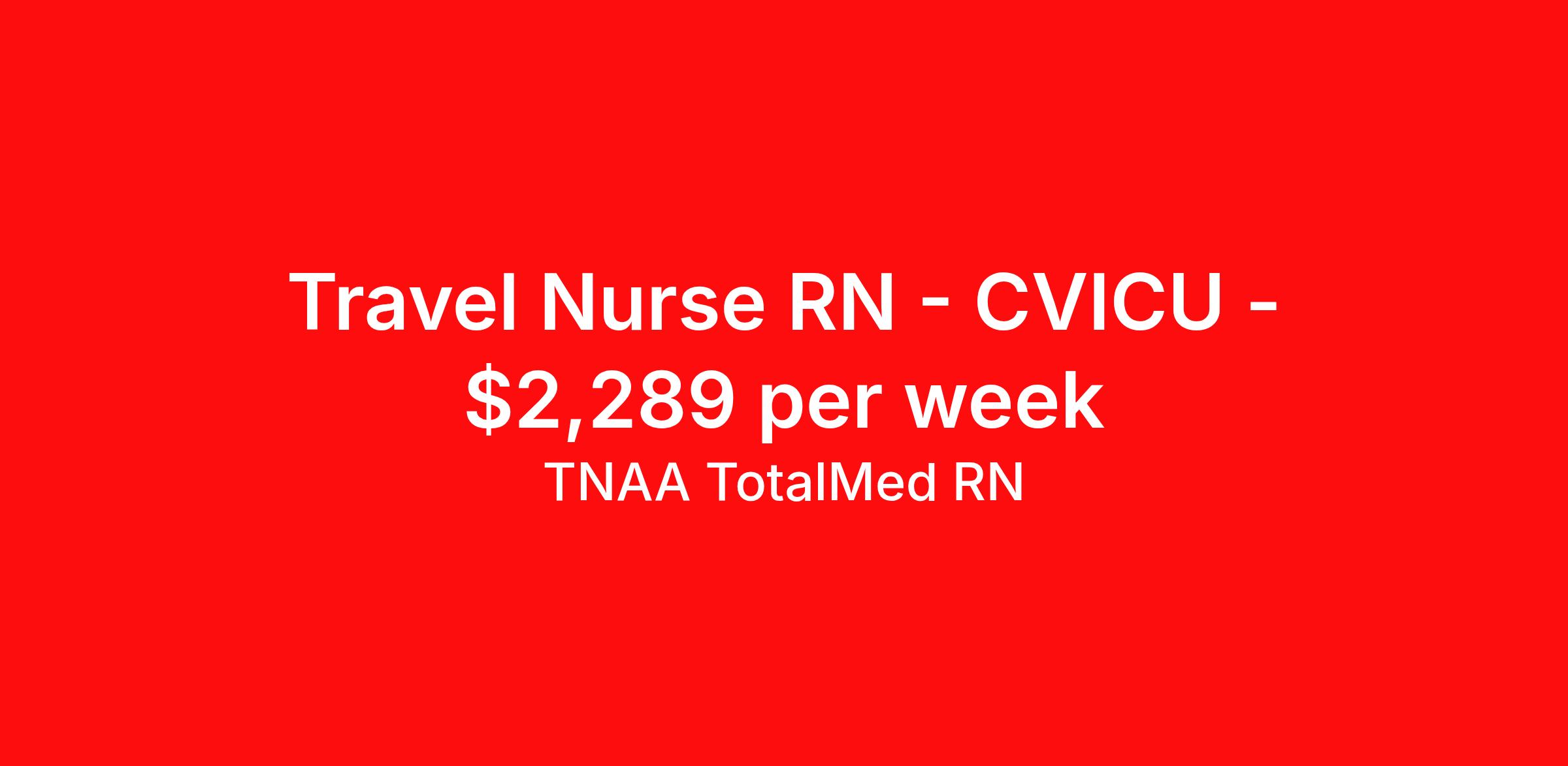 TNAA TotalMed RN is seeking a travel nurse RN CVICU for a travel nursing job in Hartford, Connecticut. Job Description & Requirements Specialty: CVICU Discipline: RN Start Date: 04/13/2026 Duration: 13 weeks 36 hours per week Shift: 12 hours, nights Employment Type: Travel We're looking for Cardiovascular Intensive Care Unit RNs for an immediate travel nurse opening in Hartford, CT. The right RN should have 1-2 years' recent acute care experience. Read below for more requirements. As a CVICU Travel Nurse, you will work with a diverse team of caregivers to administer care to patients following specialized procedures including open-heart surgery and heart transplants. Cardiovascular Intensive Care Unit RNs should have experience and skill caring for patients in a fast-paced, urgent and critical care environment. As a CVICU Travel Nurse, you should be prepared to perform the following tasks: Provide critical care to patients with potentially life-threatening heart conditions. Prepare and administer prescribed medications. Take samples for diagnostic tests; order, interpret and evaluate diagnostic tests. Apply hemodynamic, phlebotomy and IV protocols. Be called in for emergencies to provide CPR and operate defibrillators hospital-wide. Educate patients and family members on how to manage recovery at home. CVICU Travel Nurses should be able to stand and walk for long periods of time, as well as bend, lean and stoop without difficulty. RNs should be able to easily lift 20 pounds. Moving or lifting of patients may require lifting of up to 50 pounds at times. Because of the fast-paced environment, Cardiovascular Intensive Care Unit RNs must possess good skills for coping with stress and be able to relate to people of all ages and backgrounds. Requirements*: ACLS, BLS, NIH, 2 Years * Additional certifications may be required before beginning an assignment. TotalMed Travel Job ID 1396531. Pay package is based on 12 hour shifts and 36 hours per week (subject to confirmation) with tax-free stipend amount to be determined. Posted job title: Cardiovascular Intensive Care Unit - CVICU RN - Travel Nurse About TNAA TotalMed RN TotalMed is a Top Ten, travel nursing and healthcare staffing agency with the mission of igniting purpose in healthcare. The organization staffs nurses, therapists, pharmacists, and other clinicians of all specialties in all 50 states. They offer local and travel jobs and match caregivers with the right organization to assist both facilities and patients. As an organization, they focus on putting highly-skilled staff into facilities to ensure adequate staffing for a better patient experience. TotalMed specializes in recruiting and placing healthcare professionals in travel, PRN, and permanent positions across the country in Nursing and Allied Health. Throughout 2020, the organization filled roles at even the most short-staffed facilities during the most challenging time in healthcare. By matching the right travel healthcare professional with the right organization, TotalMed continues to offer a lifeline to facilities and their patients. Benefits Weekly pay Guaranteed Hours Continuing Education 401k retirement plan Sick pay Wellness and fitness programs Referral bonus Employee assistance programs Medical benefits Dental benefits Vision benefits Benefits start day 1