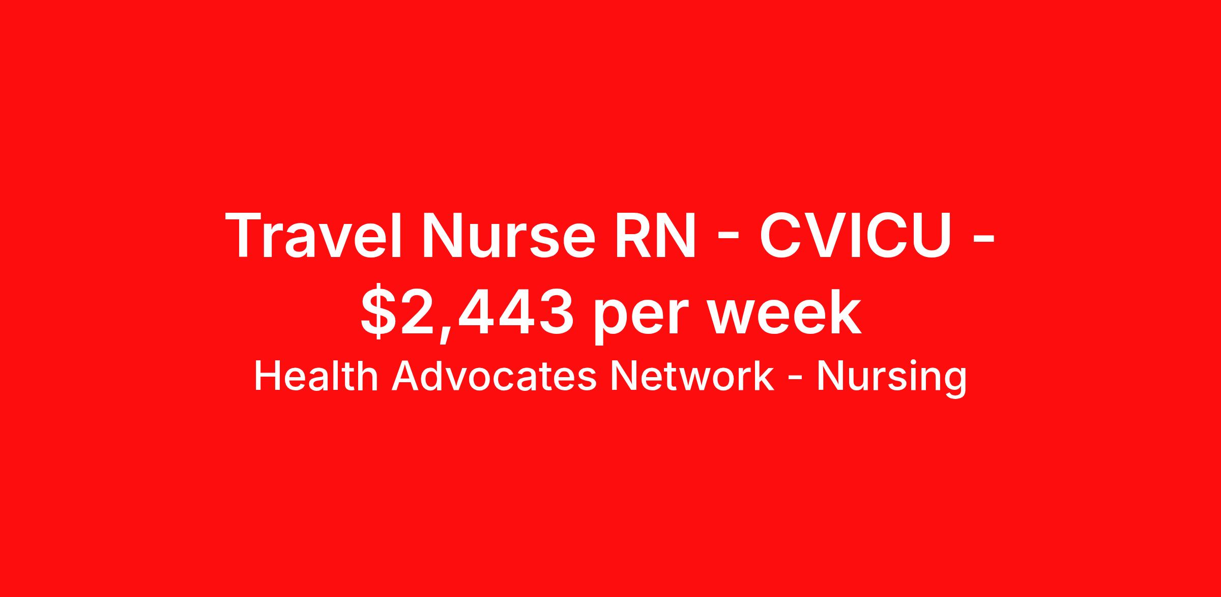 Health Advocates Network - Nursing is seeking a travel nurse RN CVICU for a travel nursing job in Great Falls, Montana. Job Description & Requirements Specialty: CVICU Discipline: RN Start Date: ASAP Duration: 13 weeks 36 hours per week Shift: 12 hours, nights Employment Type: Travel RN – CVICU Registered Nurse - Health Advocates Network is urgently hiring CVICU RNs with at least 2 years of recent experience! Travel packages up to $2443 weekly Shift: 12 hour NIGHT shifts available 13 week contracts available IMMEDIATE STARTS! Specialty: CVICU Registered Nurse (RN) Requirements: Active MT or compact State Registered Nurse License Valid BLS,ACLS Graduate of an Accredited School of Nursing Additional certifications may be required Benefits We Offer: Competitive pay rates, Referral Bonus, Medical, Dental and Vision. Travel reimbursement and per diem allowances, Employee discounts, educational opportunities, and more! To apply for this job now or to find out more about other opportunities with Health Advocates Network, Inc. reply to this posting, contact us at or call/text XXX-XXX-XXXX. We can provide you unparalleled access to exciting career opportunities. Health Advocates Network, Inc . is an equal opportunity employer. All qualified applicants shall receive consideration for employment without regard to any legally protected basis protected by applicable federal or state law except where a bona fide occupational qualification applies. Refer a Registered Nurse for a $1000.00 bonus opportunity! HANStaff Job ID 512387. Pay package is based on 12 hour shifts and 36 hours per week (subject to confirmation) with tax-free stipend amount to be determined. Posted job title: RN - CVICU About Health Advocates Network - Nursing Health Advocates Network was founded on the basis of a shared aspiration, to improve the way healthcare staffing is done. We are a company established and led by nurses. Our flexible approach enables us to develop solutions customized to your specific needs. From short- and long-term travel contracts to local and per diem assignments and more, we are here to get you to your next adventure! By solving challenges, providing the best placements, and advocating for you, we stand to help you thrive and pave the path forward in your career. Click on the videos below to learn more about our values!