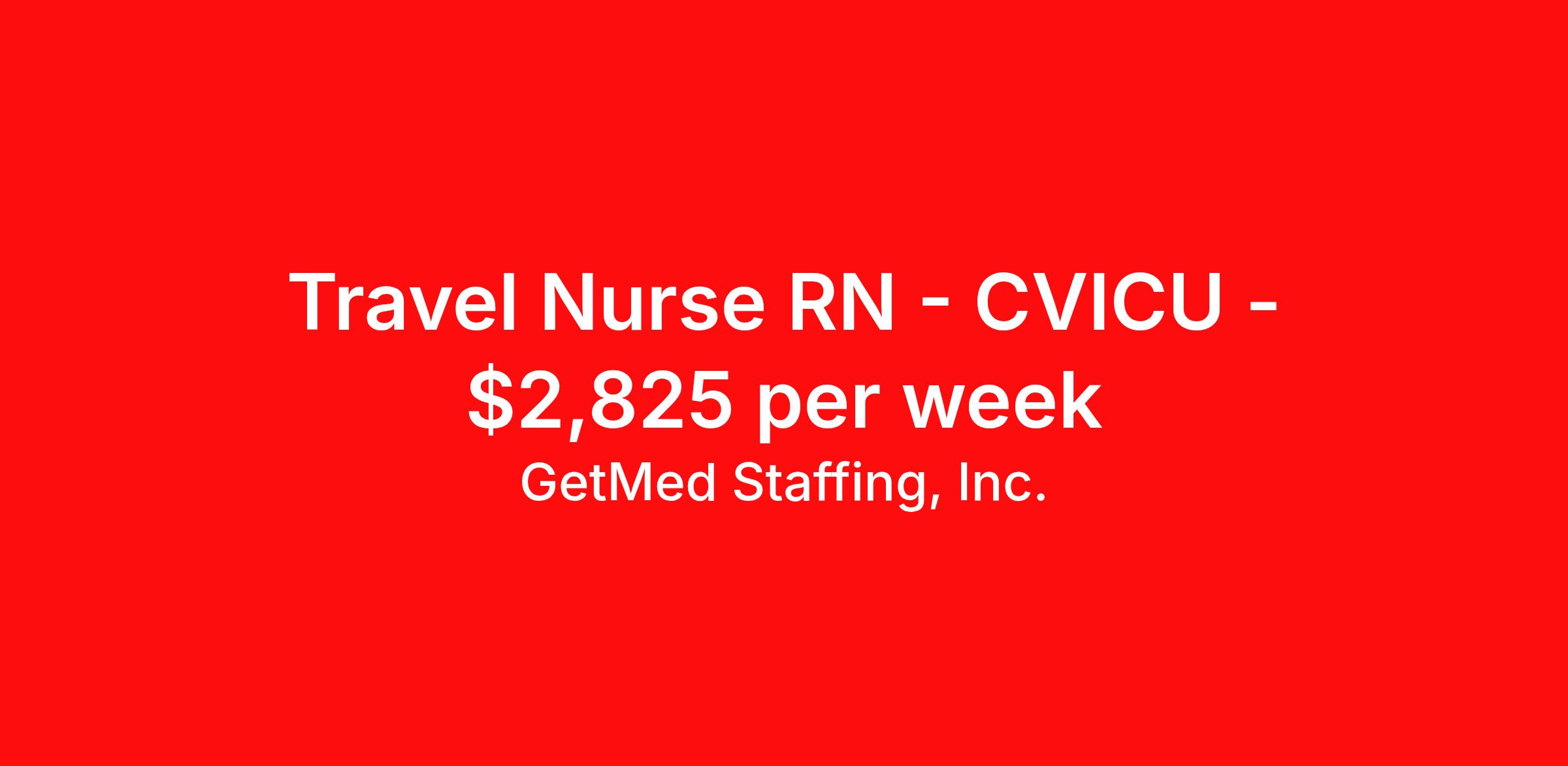GetMed Staffing, Inc. is seeking a travel nurse RN CVICU for a travel nursing job in Kansas City, Kansas. Job Description & Requirements Specialty: CVICU Discipline: RN Start Date: 03/29/2026 Duration: 13 weeks 40 hours per week Shift: 10 hours, days Employment Type: Travel GetMed Staffing is searching for a strong CVICU RN to assist our traveler-friendly client. A minimum of 1-2 years of experience is required. Traveling with GetMed Staffing offers the unique opportunity to gain diverse experiences, both personally and professionally. Gain experience that matters. GetMed Staffing, Inc. Job ID 35971057. Pay package is based on 10 hour shifts and 40.0 hours per week (subject to confirmation) with tax-free stipend amount to be determined. Posted job title: RN:CVICU,07:00:00-17:00:00 About GetMed Staffing, Inc. We are a diversity owned company, specializing in healthcare recruiting services. We truly understand how important a healthcare travelers' relationship is with their recruiter, as well as our relationship is with our healthcare facilities. We recognize that the needs of our healthcare travelers can vary, and therefore we provide the personalized touch necessary to ensure a successful travel assignment each and every time. Our healthcare facilities and clients benefit from us putting our healthcare travelers first. GetMed Staffing is excited to be a leader within the industry by focusing on providing healthcare travelers with more choices and possibilities as they plan for their next healthcare travel assignment. Benefits Life insurance Medical benefits Dental benefits Vision benefits 401k retirement plan