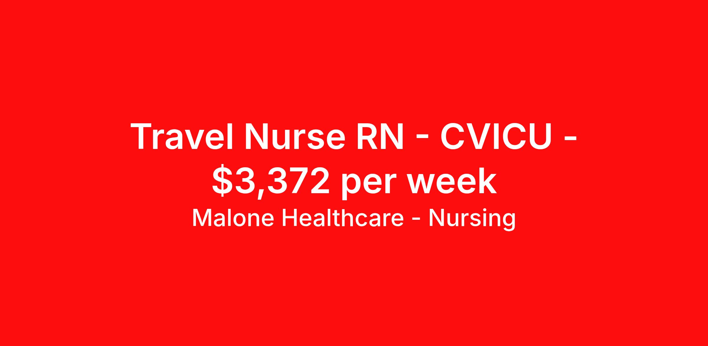 Malone Healthcare - Nursing is seeking a travel nurse RN CVICU for a travel nursing job in Hazard, Kentucky. Job Description & Requirements Specialty: CVICU Discipline: RN Start Date: 04/06/2026 Duration: 13 weeks 48 hours per week Shift: 12 hours, days Employment Type: Travel First week you have to work 36 hours, and the second week will be 48 hours. and must have previous travel experience About Malone Healthcare - Nursing With a commitment to providing a higher standard of service and experience in patient care, Malone Healthcare places expert nurses and allied health professionals in rewarding careers throughout the United States. As a leading healthcare staffing agency, Malone’s focus on compliance and integrity translates to a seamless experience for our team members and partner facilities. When you work with Malone Healthcare, you can rely on over 50 years of proven experience placing exceptional professionals in quality healthcare settings. Benefits Weekly pay Holiday Pay Guaranteed Hours Continuing Education 401k retirement plan Pet insurance Referral bonus Medical benefits Dental benefits Vision benefits License and certification reimbursement Life insurance