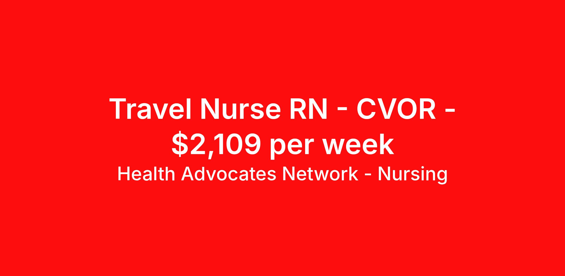 Health Advocates Network - Nursing is seeking a travel nurse RN CVOR for a travel nursing job in Snellville, Georgia. Job Description & Requirements Specialty: CVOR Discipline: RN Start Date: 03/30/2026 Duration: 14 weeks 40 hours per week Shift: 10 hours, days Employment Type: Travel RN – CVOR Registered Nurse - Health Advocates Network is urgently hiring CVOR RNs with at least 2 years of recent experience! Travel packages up to $2,109 weekly 10 hour DAY shifts available 13 week contracts available IMMEDIATE STARTS! Specialty: CVOR Registered Nurse (RN) Requirements: Active GA State or Compact Registered Nurse License if applicable ACLS, BLS Graduate of an Accredited School of Nursing Additional certifications may be required Benefits We Offer: Competitive pay rates, Referral Bonus, Medical, Dental and Vision. Travel reimbursement and per diem allowances, Employee discounts, educational opportunities, and more! To apply for this job now or to find out more about other opportunities with Health Advocates Network, Inc. reply to this posting, contact us at or call/text . We can provide you unparalleled access to exciting career opportunities. Health Advocates Network, Inc . is an equal opportunity employer. All qualified applicants shall receive consideration for employment without regard to any legally protected basis protected by applicable federal or state law except where a bona fide occupational qualification applies. Refer a Registered Nurse for a $1,000.00 bonus opportunity! HANStaff Job ID 523465. Pay package is based on 10 hour shifts and 40 hours per week (subject to confirmation) with tax-free stipend amount to be determined. Posted job title: RN - CVOR About Health Advocates Network - Nursing Health Advocates Network was founded on the basis of a shared aspiration, to improve the way healthcare staffing is done. We are a company established and led by nurses. Our flexible approach enables us to develop solutions customized to your specific needs. From short- and long-term travel contracts to local and per diem assignments and more, we are here to get you to your next adventure! By solving challenges, providing the best placements, and advocating for you, we stand to help you thrive and pave the path forward in your career. Click on the videos below to learn more about our values!