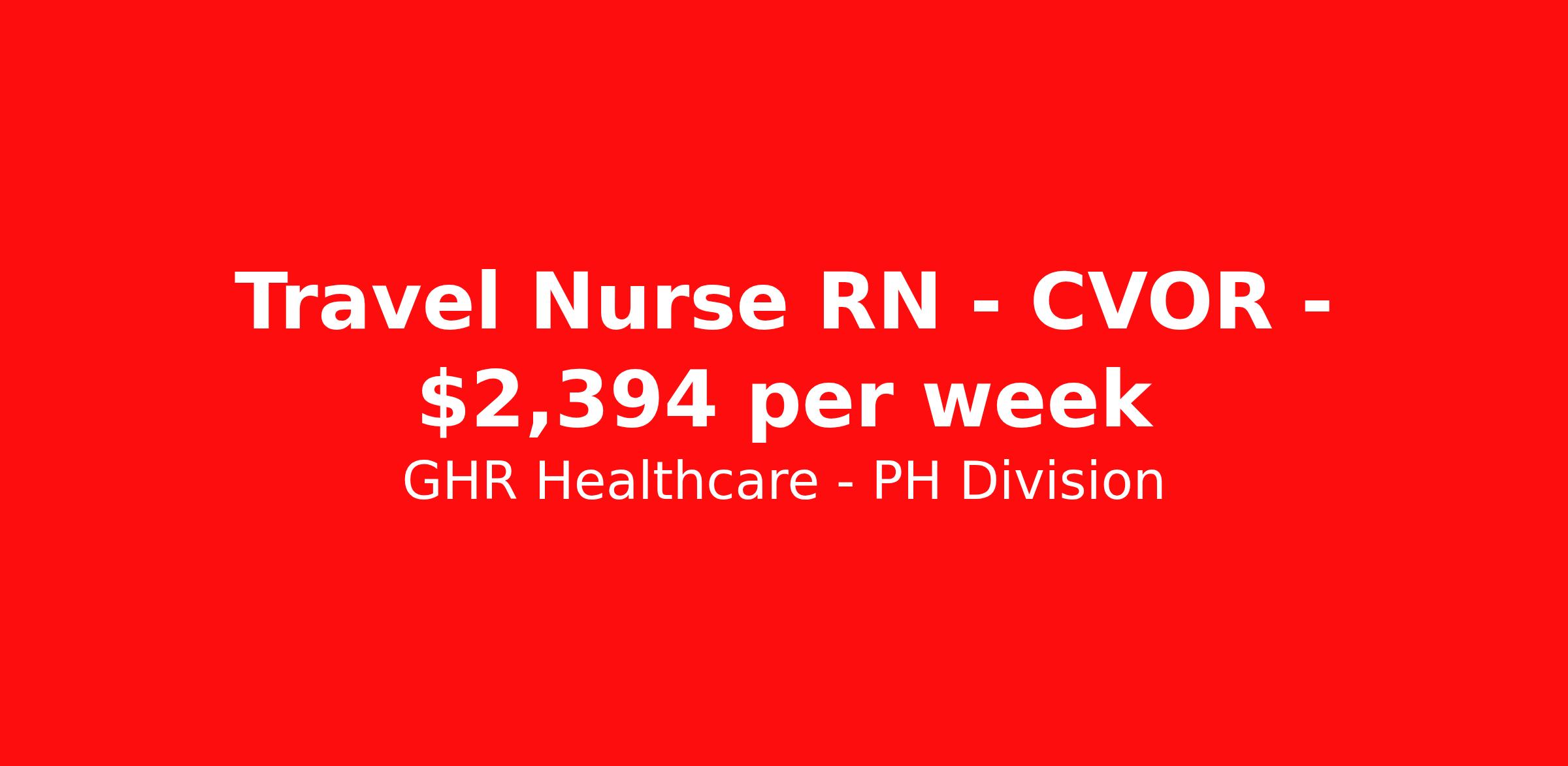 GHR Healthcare - PH Division is seeking a travel nurse RN CVOR for a travel nursing job in Kingwood, Texas. Job Description & Requirements Specialty: CVOR Discipline: RN Start Date: 04/06/2026 Duration: 13 weeks 40 hours per week Shift: 8 hours Employment Type: Travel CVOR Registered Nurse (Travel RN) – Kingwood, TX (77339) Travel RN opportunity: CVOR Registered Nurse in Kingwood, TX — 13-week assignment supporting open heart and cardiothoracic surgery. Ideal for experienced Cardiovascular Operating Room (CVOR) RNs and cardiac surgery travel nurses in the Houston area. Location & Quick Details Job Title: CVOR Registered Nurse / Cardiovascular Operating Room RN (Travel) Location: Kingwood, TX 77339 — near the greater Houston area (Texas travel nursing) Assignment Type: Travel Nurse / Travel RN (13 weeks) Setting: Operating Room (CVOR) — cardiothoracic & open heart service line Start Date: April 6, 2026 End Date: July 6, 2026 Shift: 7:00 AM – 3:00 PM (8-hour days); 40 hours/week On-Call: Required after 3 PM and on weekends Patient Ratio: 1:1 Scrub Color: Navy Blue Estimated Weekly Salary Range: $2,200 - $2,310 per week Required Qualifications (CVOR RN / Travel Nurse) Active RN license (Texas or Compact RN license accepted) BLS and ACLS certifications required Minimum 1 year recent CVOR RN experience; experience in open heart and cardiothoracic cases required Familiarity with standard OR equipment and Meditech EMR preferred Dependable, flexible, and able to participate in on-call rotation Preferred / Additional Skills Previous travel nurse experience (CVOR travel RN or OR travel nurse) Experience with CABG, valve replacements, ECMO, Impella, EVH Strong teamwork and communication skills in high-acuity surgical settings Responsibilities — Cardiovascular Operating Room RN Provide direct perioperative patient care in the Cardiovascular Operating Room, maintaining a sterile and safe environment Assist with cardiothoracic procedures including CABG (with/without EVH), valve replacements, pericardial windows, Impella placement, and ECMO cases Collaborate with a multidisciplinary surgical team of RNs, surgeons, anesthesiologists, and surgical techs Float to other OR service lines as needed (Trauma, General, Gyn, Uro, Ortho, Neuro, Plastics) Participate in on-call rotation for after-hours and weekend coverage Document patient care and operative details accurately in Meditech EMR Why Join This Travel Nursing Opportunity Work in a state-of-the-art CVOR with a dedicated cardiothoracic team Gain high-acuity experience in open heart and advanced cardiac procedures Explore Kingwood and the greater Houston area while on assignment (Texas nursing jobs) Ready to apply? Join our healthcare team today — Apply now for this CVOR Registered Nurse (Travel RN) opportunity in Kingwood, TX (77339). For questions about this travel nurse position or to submit your CV, contact our recruiting team. Benefits 401K with Matching, Healthcare, Dental and Vision Equal Opportunity We are an equal opportunity employer and value diversity across our organization. We do not discriminate on the basis of race, religion, color, national origin, gender, sexual orientation, age, marital status, veteran status, or disability status. Planet Healthcare Job ID 465166. Pay package is based on 8 hour shifts and 40 hours per week (subject to confirmation) with tax-free stipend amount to be determined. Posted job title: CVOR About GHR Healthcare - PH Division For over 30 years, GHR Healthcare has been the bridge between healthcare professionals and the facilities that need them nationwide. We're committed to uncovering your ideal fit, supported by GHR's dedication to competitive compensation, transparent communication, and a devoted team that genuinely cares about your career journey. You can trust us to stand by your side as your advocate, confidante, and partner in advancing your career. At GHR, care and consideration are at the heart of everything we do. Visit ghrhealthcare.com to learn more.