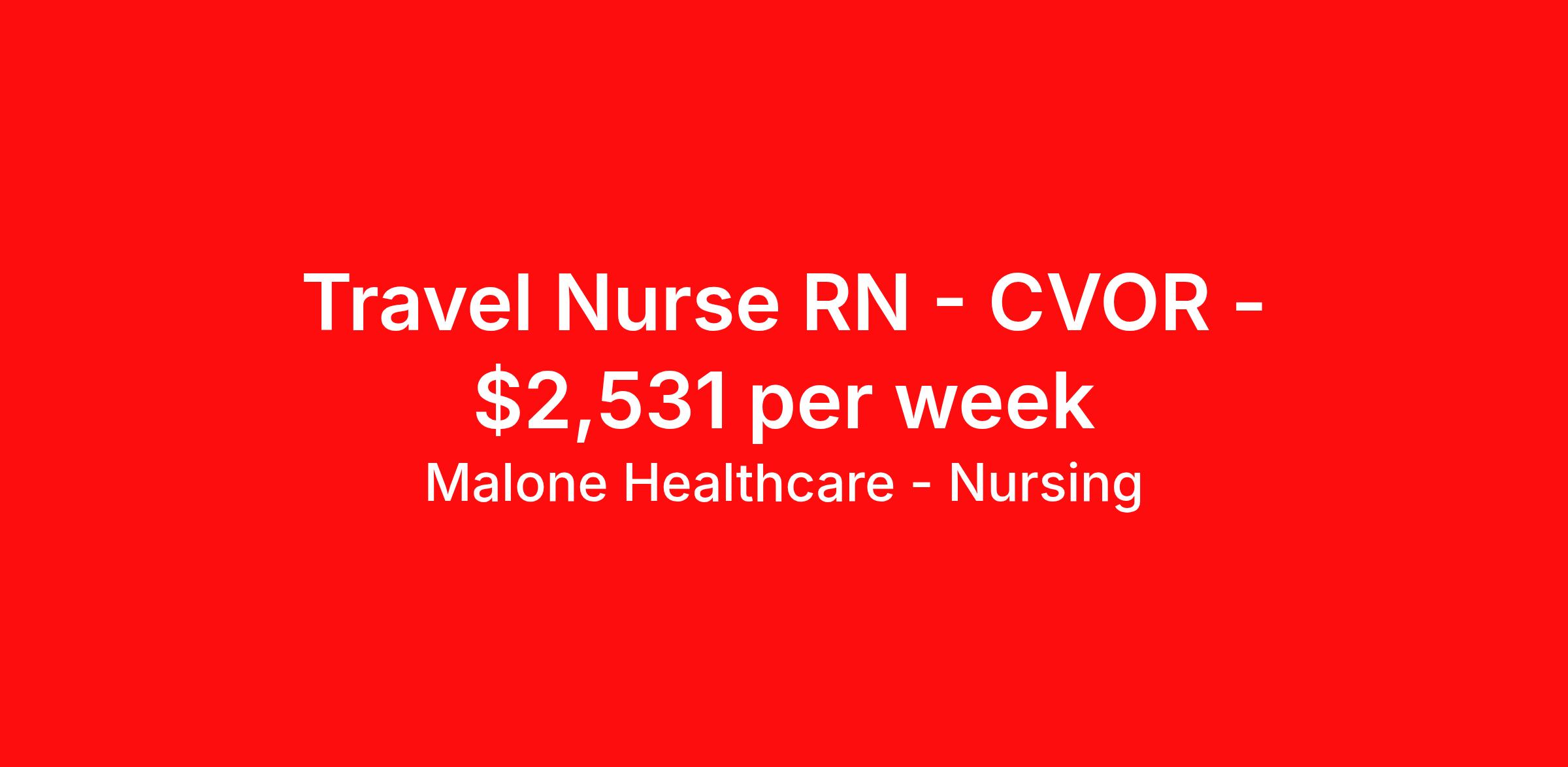Malone Healthcare - Nursing is seeking a travel nurse RN CVOR for a travel nursing job in Indianapolis, Indiana. Job Description & Requirements Specialty: CVOR Discipline: RN Start Date: 04/06/2026 Duration: 13 weeks 40 hours per week Shift: 10 hours, days Employment Type: Travel JOB DETAILS Unit Profiles: The purpose of a unit profile is to help provide an exceptional understanding of the unit. Profiles will include location, number of beds, patient rations, and other unique details to assist recruiting professional in effectively and efficiently identifying highly qualified staff. Below you will find a data collection tool to help you identify essential data needed to complete your profile. Position Template Floor/Unit: Cardiovascular Operating Room Replacement Position (Y/N): N Name of Candidate Replacing: Location Address: Indianapolis, Indiana 46237 Position Information: • Position Role (RN, Tech, LPN, PT, etc.): RN • Specialty: Cardiovascular Surgery • Number of Contractors Being Requested: 1 • Shift Hours (Specific days of week with shift details): Days, M-F, 600-1630 • Weekly Guaranteed Hours: 40 • Weekend Shift Hours: • Call Requirements (Specific days of week with shift details): Sun.-Sat. overnight through the weeks, Number of days varies • Required Certifications (i.e. BLS, ACLS, NRP, ARRT, AWHONN, etc.): BLS and ACLS • Years of Experience: 2 years • Float Requirements: n/a Unit Information: • Number of Beds: • Patient Ratios: • Equipment: • EMR: EPIC Hiring Profile: • Must Have Skills/Experience: 2 years Must have Cardiac and Vascular Surgery Experience • Preferred Skillset/Experience: • Type of Patients on Unit: cardiac vascular care patients • Personality Fit: Dress Code: About Malone Healthcare - Nursing With a commitment to providing a higher standard of service and experience in patient care, Malone Healthcare places expert nurses and allied health professionals in rewarding careers throughout the United States. As a leading healthcare staffing agency, Malone’s focus on compliance and integrity translates to a seamless experience for our team members and partner facilities. When you work with Malone Healthcare, you can rely on over 50 years of proven experience placing exceptional professionals in quality healthcare settings. Benefits Weekly pay Holiday Pay Guaranteed Hours Continuing Education 401k retirement plan Pet insurance Referral bonus Medical benefits Dental benefits Vision benefits License and certification reimbursement Life insurance