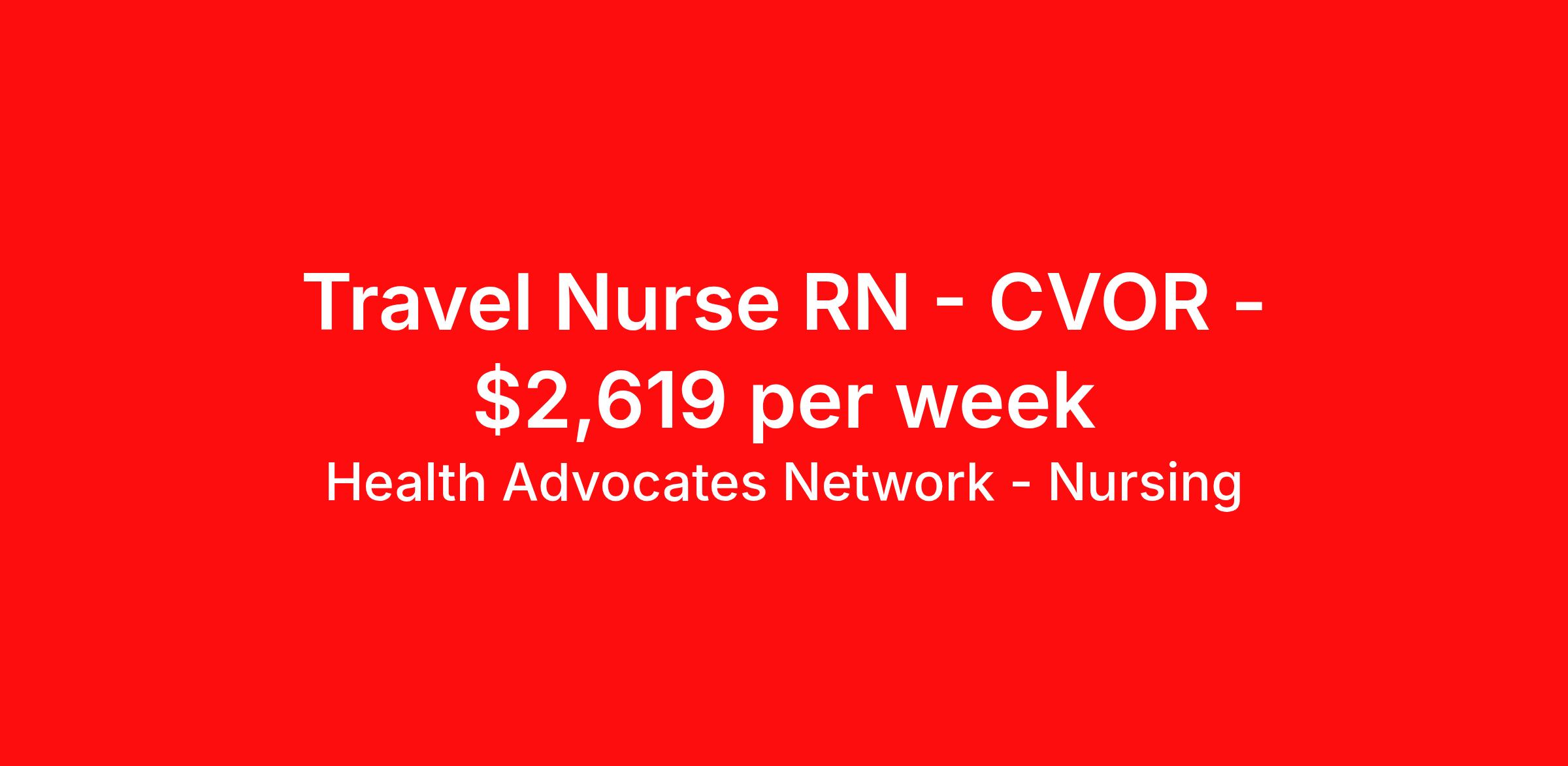 Health Advocates Network - Nursing is seeking a travel nurse RN CVOR for a travel nursing job in Birmingham, Alabama. Job Description & Requirements Specialty: CVOR Discipline: RN Start Date: ASAP Duration: 13 weeks 40 hours per week Shift: 8 hours, days Employment Type: Travel RN – CVOR Registered Nurse - Health Advocates Network is urgently hiring CVOR RNs with at least 2 years of recent experience! Travel packages up to $2,619 weekly 8 hour DAY shifts available 13 week contracts available IMMEDIATE STARTS! Specialty: CVOR Registered Nurse (RN) Requirements: Active AL State or Compact Registered Nurse License if applicable Valid BLS Graduate of an Accredited School of Nursing Additional certifications may be required Benefits We Offer: Competitive pay rates, Referral Bonus, Medical, Dental and Vision. Travel reimbursement and per diem allowances, Employee discounts, educational opportunities, and more! To apply for this job now or to find out more about other opportunities with Health Advocates Network, Inc. reply to this posting, contact us at or call/text . We can provide you unparalleled access to exciting career opportunities. Health Advocates Network, Inc . is an equal opportunity employer. All qualified applicants shall receive consideration for employment without regard to any legally protected basis protected by applicable federal or state law except where a bona fide occupational qualification applies. Refer a Registered Nurse for a $1,000.00 bonus opportunity! HANStaff Job ID 514119. Pay package is based on 8 hour shifts and 40 hours per week (subject to confirmation) with tax-free stipend amount to be determined. Posted job title: RN - CVOR About Health Advocates Network - Nursing Health Advocates Network was founded on the basis of a shared aspiration, to improve the way healthcare staffing is done. We are a company established and led by nurses. Our flexible approach enables us to develop solutions customized to your specific needs. From short- and long-term travel contracts to local and per diem assignments and more, we are here to get you to your next adventure! By solving challenges, providing the best placements, and advocating for you, we stand to help you thrive and pave the path forward in your career. Click on the videos below to learn more about our values!
