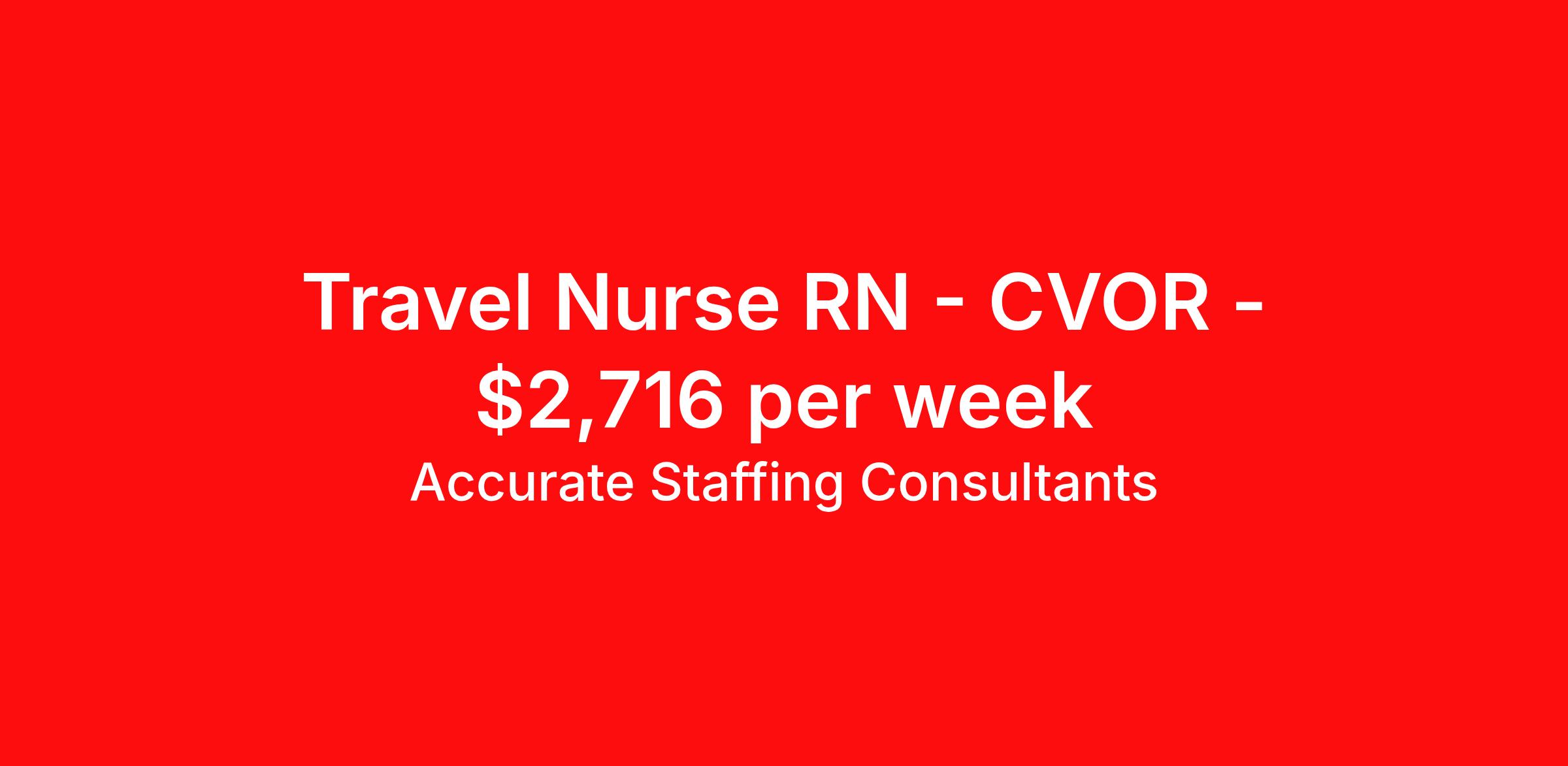 Accurate Staffing Consultants is seeking a travel nurse RN CVOR for a travel nursing job in Greenville, South Carolina. Job Description & Requirements Specialty: CVOR Discipline: RN Start Date: 04/06/2026 Duration: 13 weeks 40 hours per week Shift: 10 hours, days Employment Type: Travel AccurateStaffing Job ID 4164. Pay package is based on 10 hour shifts and 40 hours per week (subject to confirmation) with tax-free stipend amount to be determined. Posted job title: RN - CVOR