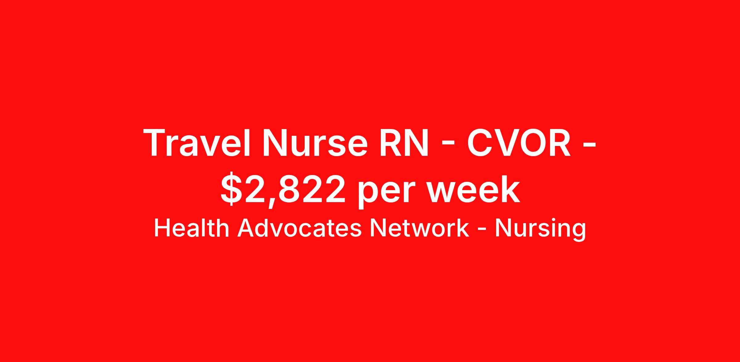 Health Advocates Network - Nursing is seeking a travel nurse RN CVOR for a travel nursing job in Baltimore, Maryland. Job Description & Requirements Specialty: CVOR Discipline: RN Start Date: 04/14/2026 Duration: 13 weeks 40 hours per week Shift: 10 hours, days Employment Type: Travel RN – CVOR Registered Nurse - Health Advocates Network is urgently hiring CVOR RNs with at least 2 years of recent experience! Travel packages up to $2,822 weekly 10hour DAY shifts available 13 week contracts available IMMEDIATE STARTS! Specialty: CVOR Registered Nurse (RN) Requirements: Active MD State or Compact Registered Nurse License if applicable BLS required ACLS preferred CVOR experience required Open-heart surgery experience required Must be able to scrub Graduate of an Accredited School of Nursing Additional certifications may be required Benefits We Offer: Competitive pay rates, Referral Bonus, Medical, Dental and Vision. Travel reimbursement and per diem allowances, Employee discounts, educational opportunities, and more! To apply for this job now or to find out more about other opportunities with Health Advocates Network, Inc. reply to this posting, contact us at or call/text . We can provide you unparalleled access to exciting career opportunities. Health Advocates Network, Inc . is an equal opportunity employer. All qualified applicants shall receive consideration for employment without regard to any legally protected basis protected by applicable federal or state law except where a bona fide occupational qualification applies. Refer a Registered Nurse for a $1,000.00 bonus opportunity! HANStaff Job ID 518615. Pay package is based on 10 hour shifts and 40 hours per week (subject to confirmation) with tax-free stipend amount to be determined. Posted job title: RN - CVOR About Health Advocates Network - Nursing Health Advocates Network was founded on the basis of a shared aspiration, to improve the way healthcare staffing is done. We are a company established and led by nurses. Our flexible approach enables us to develop solutions customized to your specific needs. From short- and long-term travel contracts to local and per diem assignments and more, we are here to get you to your next adventure! By solving challenges, providing the best placements, and advocating for you, we stand to help you thrive and pave the path forward in your career. Click on the videos below to learn more about our values!