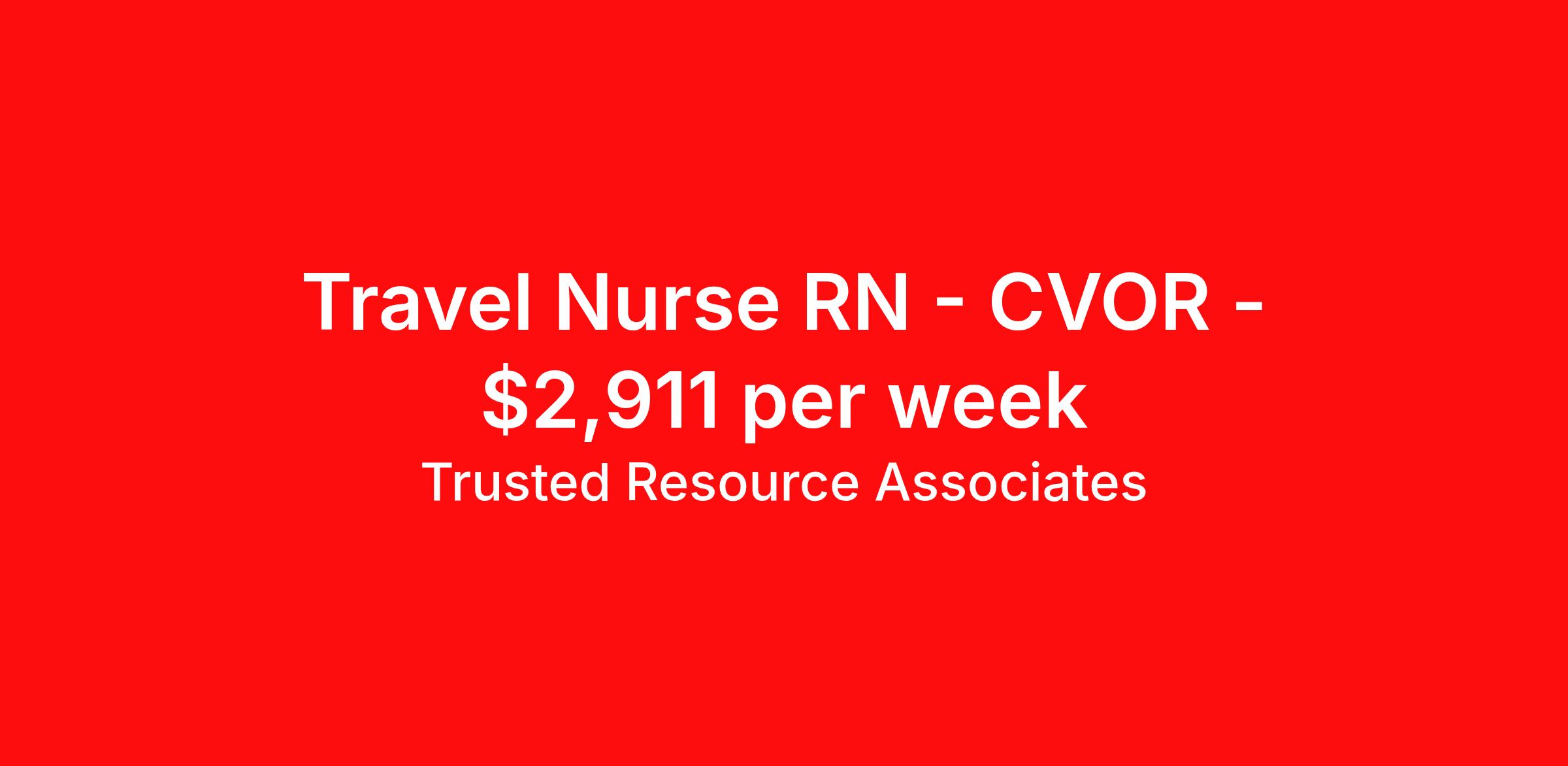 Trusted Resource Associates (TRA) is seeking a travel nurse RN CVOR for a travel nursing job in Delray Beach, Florida. Job Description & Requirements Specialty: CVOR Discipline: RN Start Date: 04/01/2026 Duration: 13 weeks 36 hours per week Shift: 12 hours, days Employment Type: Travel TRA RN CVOR TRA is Tenet's in-house nationwide contingent pool for Nursing and Allied travel and local contracts. Receive a greater level of Contract security compared to with an outside agency. BENEFITS - Guaranteed hours for Travel Contracts - Preferred Booking Agreement for Local Contracts - Weekly Pay - Holiday Pay - Contract Security compared to a contract with an outside agency Minimum education Graduate of an accredited School of nursing Minimum Experience Must have 2 years of Acute Care nursing experience with a minimum one year current in this discipline. Required Certification/Licensure - Must be currently licensed, certified or registered to practice profession as required by law, regulation in state of practice or policy. Must meet all certification requirements for each nursing specialty supported - American Heart Association - CPR-Basic Life Support - Other credentialing items, such as a skills checklist and health related documents, which will be specified by your Recruiter. Our Hire Process - We do qualify our clinicians to meet or exceed the minimum requirements of a travel or local assignment. If you are qualified, we may direct-hire you, reducing the time we can get you to work! When you reach out to a TRA Recruiter for more details, ensure your Vivian profile includes your most updated resume! Trusted Resource Associates (TRA) Job ID 583747. Pay package is based on 12 hour shifts and 36 hours per week (subject to confirmation) with tax-free stipend amount to be determined. Benefits 401k retirement plan Weekly pay Holiday Pay Referral bonus