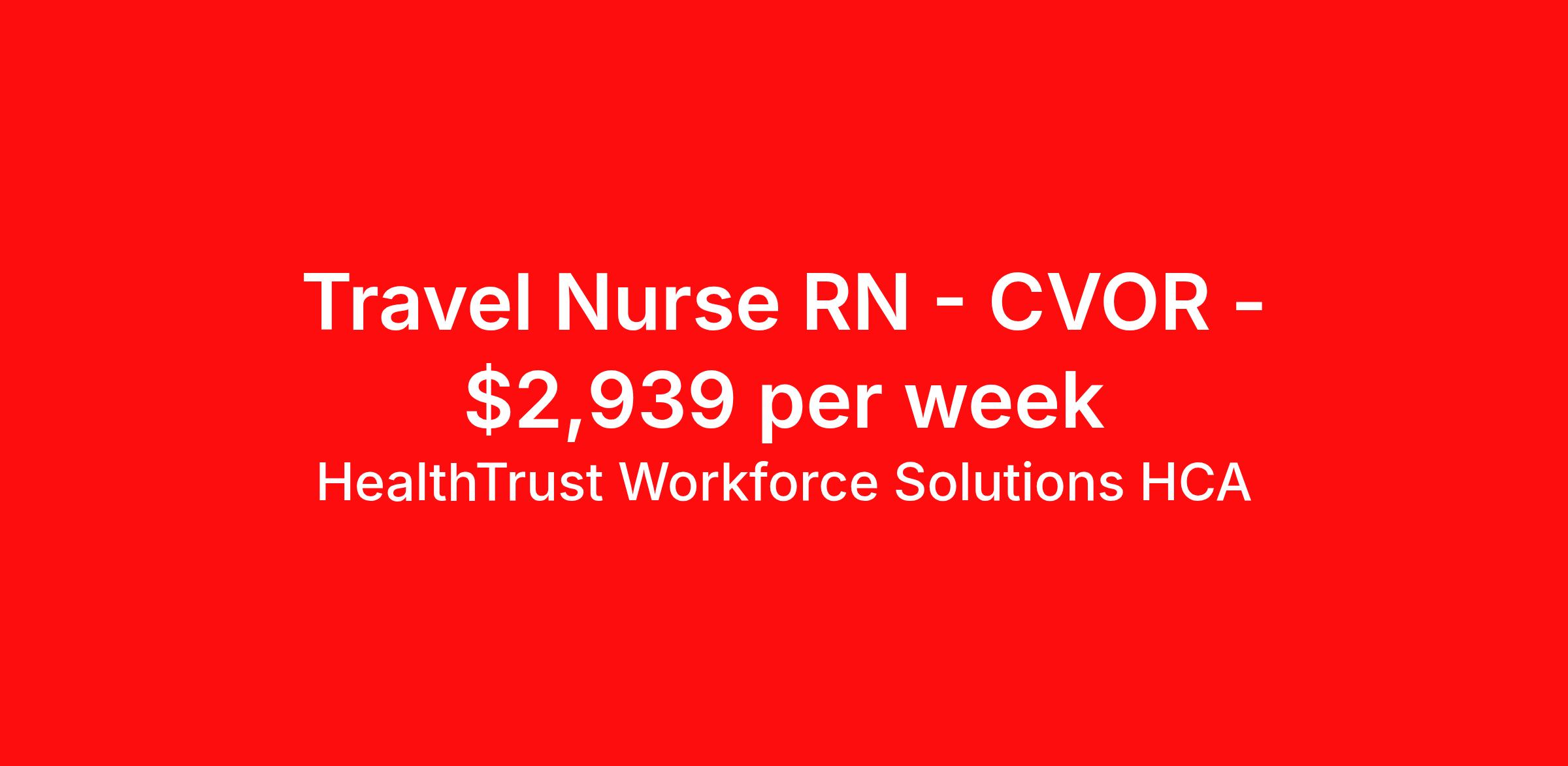 HealthTrust Workforce Solutions HCA is seeking a travel nurse RN CVOR for a travel nursing job in Richmond, Virginia. Job Description & Requirements Specialty: CVOR Discipline: RN Start Date: 04/06/2026 Duration: 13 weeks 40 hours per week Shift: 10 hours, days Employment Type: Travel Hospital: CHIPPENHAM HOSPITAL Location: Levinson Heart Hospital-CVOR Address:7101 Jahnke Road, Richmond VA 23225 Unit: CVOR-4th floor Building: General Information Unit Specifics: · Number of Beds : · Patient Ratios : · Unit staffing description- (unit secretaries and tech availability) : · Type of equipment : · Documentation system: · Scheduling requirements: · Floating policy: · Patient Experience requirements: Hospital Specifics- · Certifications: Hiring profile Requested Skill Set: CVOR ORT : proficient in scrubbing cardiac cases requiring bypass, and related procedures in the mediastinum, thoracic surgery cases, (daVinci assisted), as well as open thoracotomy, VATS, procedures initiating ECMO, and pericardial window. Ability to take call; unit hours of operation are: 0630-1500. Call starts at 1500, (when assigned). Weekend call is Friday, Saturday, Sunday, (when assigned). Must have : Advanced skills needed: Procedures performed on unit: Variety of cardiac cases from CABG to valve replacement, repair of aortic dissections, TAVR’s, Thoracic surgery, (daVinci assisted lobectomy, wedge resections, mediastinal lymph node biopsy, , ECMO. Certifications Required: BLS Dress Code : (Required uniform) · Scrubs: hospital provided Jayden Williamson | Healthcare Recruiter | HealthTrust Workforce Solutions | e: About HealthTrust Workforce Solutions HCA At HealthTrust Workforce Solutions, healthcare is not just about the four walls of a facility but about the people who provide and receive care. Our focus is on empowering healthcare professionals to deliver exceptional patient experiences by providing them with the necessary skills, tools, and support. We partner with healthcare facilities nationwide to ensure that the right professionals are in the right roles. We prioritize our clinicians by giving them a voice and access to opportunities to fulfill their mission of improving lives by providing quality patient care. We are committed to our core values of Trust, Innovation, Adaptability, Courage, and Accountability. We are dedicated to positively impacting the healthcare industry by providing first-priority access to more than 200,000 jobs nationwide to our healthcare professionals. Join us and be part of the HealthTrust family, where you can make a difference every day. We embrace our changing environment, and we maintain a culture that has a rich tradition of transforming itself to meet the challenges of the future. MISSION STATEMENT While putting great people in the right roles is essential, our mission is far greater. We want our clinicians to be part of the HealthTrust family, where healthcare professionals have a voice and are empowered with the right tools and opportunities to fulfill their personal mission of improving lives. Plus, as a preferred partner to thousands of top-performing hospitals, we provide our healthcare professionals with first-priority access to more than 200,000 jobs nationwide. Benefits Dental benefits Vision benefits Referral bonus Continuing Education Life insurance