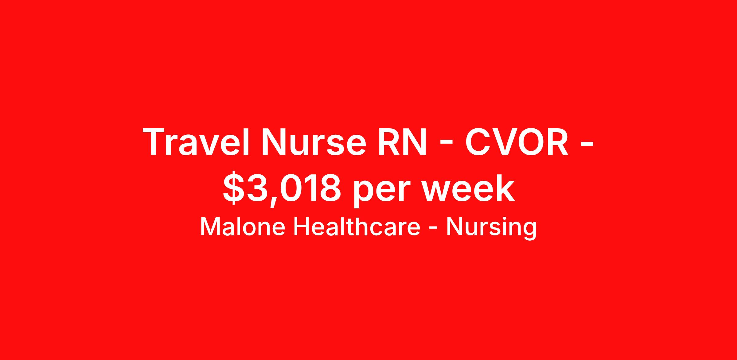 Malone Healthcare - Nursing is seeking a travel nurse RN CVOR for a travel nursing job in Wausau, Wisconsin. Job Description & Requirements Specialty: CVOR Discipline: RN Start Date: 03/30/2026 Duration: 13 weeks 40 hours per week Shift: 8 hours, days, nights, flexible, rotating Employment Type: Travel About Malone Healthcare - Nursing With a commitment to providing a higher standard of service and experience in patient care, Malone Healthcare places expert nurses and allied health professionals in rewarding careers throughout the United States. As a leading healthcare staffing agency, Malone’s focus on compliance and integrity translates to a seamless experience for our team members and partner facilities. When you work with Malone Healthcare, you can rely on over 50 years of proven experience placing exceptional professionals in quality healthcare settings. Benefits Weekly pay Holiday Pay Guaranteed Hours Continuing Education 401k retirement plan Pet insurance Referral bonus Medical benefits Dental benefits Vision benefits License and certification reimbursement Life insurance