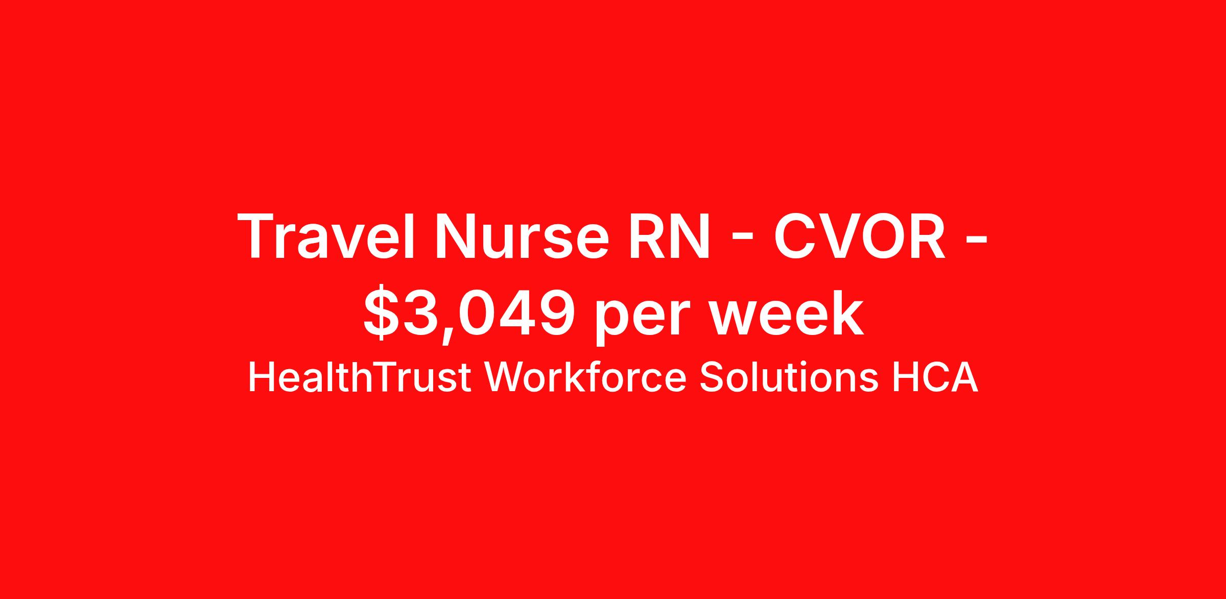 HealthTrust Workforce Solutions HCA is seeking a travel nurse RN CVOR for a travel nursing job in Richmond, Virginia. Job Description & Requirements Specialty: CVOR Discipline: RN Start Date: 04/20/2026 Duration: 13 weeks 40 hours per week Shift: 10 hours, days Employment Type: Travel Start dates and weekly hours are flexible, and we have many more opportunities throughout the country. If you are interested in this position or would like to hear about other open positions we have, please respond to this proposal or apply to this post! This position is open to local contracts too. About HealthTrust Workforce Solutions HCA At HealthTrust Workforce Solutions, healthcare is not just about the four walls of a facility but about the people who provide and receive care. Our focus is on empowering healthcare professionals to deliver exceptional patient experiences by providing them with the necessary skills, tools, and support. We partner with healthcare facilities nationwide to ensure that the right professionals are in the right roles. We prioritize our clinicians by giving them a voice and access to opportunities to fulfill their mission of improving lives by providing quality patient care. We are committed to our core values of Trust, Innovation, Adaptability, Courage, and Accountability. We are dedicated to positively impacting the healthcare industry by providing first-priority access to more than 200,000 jobs nationwide to our healthcare professionals. Join us and be part of the HealthTrust family, where you can make a difference every day. We embrace our changing environment, and we maintain a culture that has a rich tradition of transforming itself to meet the challenges of the future. MISSION STATEMENT While putting great people in the right roles is essential, our mission is far greater. We want our clinicians to be part of the HealthTrust family, where healthcare professionals have a voice and are empowered with the right tools and opportunities to fulfill their personal mission of improving lives. Plus, as a preferred partner to thousands of top-performing hospitals, we provide our healthcare professionals with first-priority access to more than 200,000 jobs nationwide. Benefits Dental benefits Vision benefits Referral bonus Continuing Education Life insurance