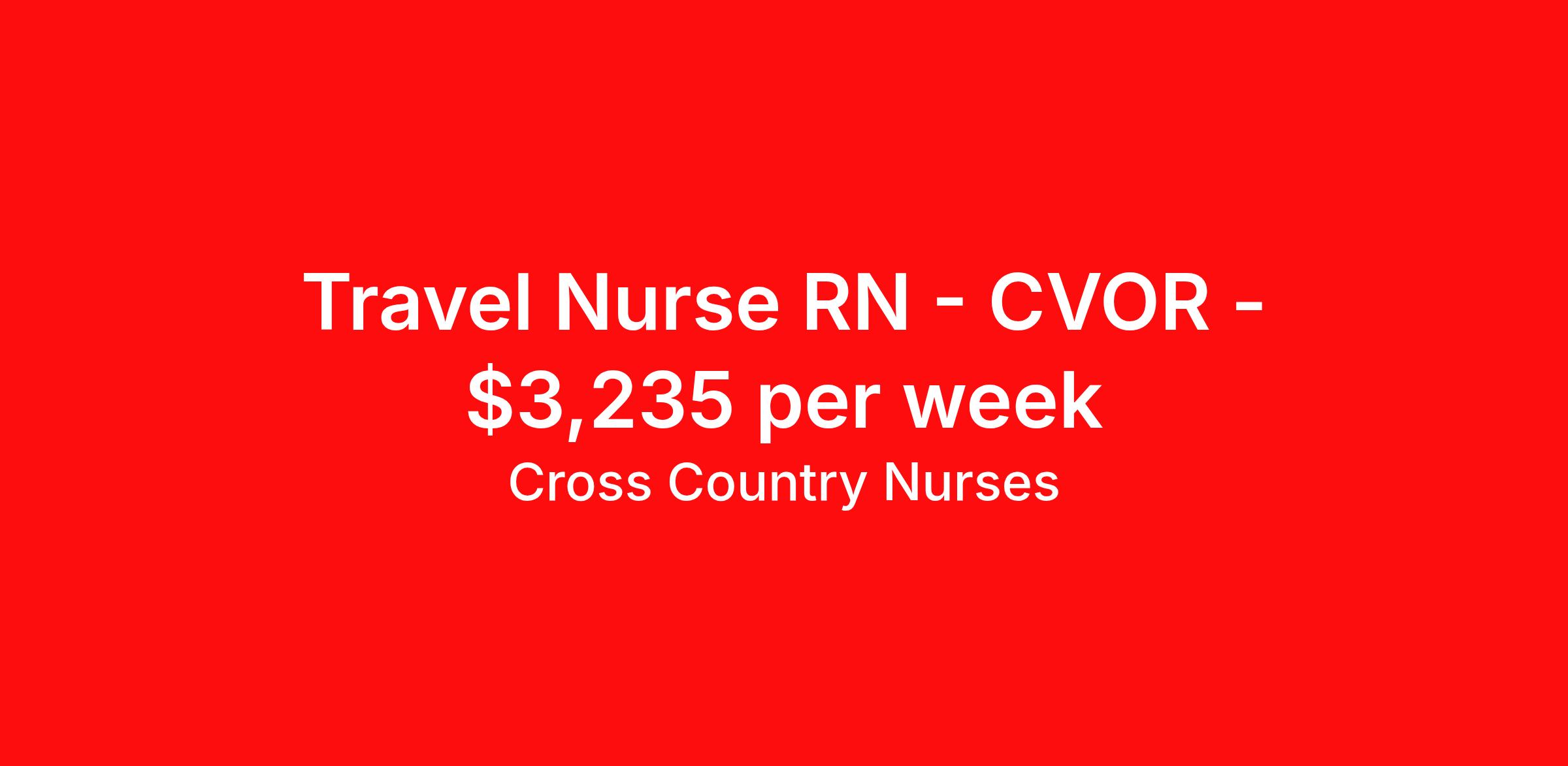 Cross Country Nurses is seeking a travel nurse RN CVOR for a travel nursing job in Stanford, California. Job Description & Requirements Specialty: CVOR Discipline: RN Start Date: 04/06/2026 Duration: 26 weeks 36 hours per week Shift: 12 hours, days Employment Type: Travel Job Description As an operating room open heart nurse (RN OR-OH), you will manage the care of patients before, during, and after open-heart surgery. Working primarily within the operating suite, you will be responsible for preparing the patient, handling and preparing operating instruments and equipment, monitoring patient status, and assisting with open-heart surgeries. You'll also provide pre- and post-op education and moral support to patients and their families. Minimum Requirements At least 1 year of recent acute care experience in specialty Active RN license Benefits The benefits of taking a travel nursing job with Cross Country include: Private housing or generous housing allowance Comprehensive health insurance with prescription coverage Dependent health insurance with prescription coverage Competitive salaries Referral bonuses Travel reimbursement 401(k) retirement plan Direct deposit/free checking Unlimited free CE credits Posted Date: 2026-03-03 Cross Country Job ID 1219424. Pay package is based on 12 hour shifts and 36 hours per week (subject to confirmation) with tax-free stipend amount to be determined. Posted job title: Registered Nurse / Operating Room Open Heart About Cross Country Nurses You care for others — we’re here to care for you. At Cross Country, we know travel nursing is about more than just the job. It’s about building a career that supports your lifestyle, your values, and your impact. We offer competitive pay, full benefits, and 24/7 support from a team that truly understands what it means to be on the front lines. Wherever your journey takes you, we’re with you every step of the way. Let’s build your best life — one assignment at a time. Benefits 401k retirement plan Referral bonus