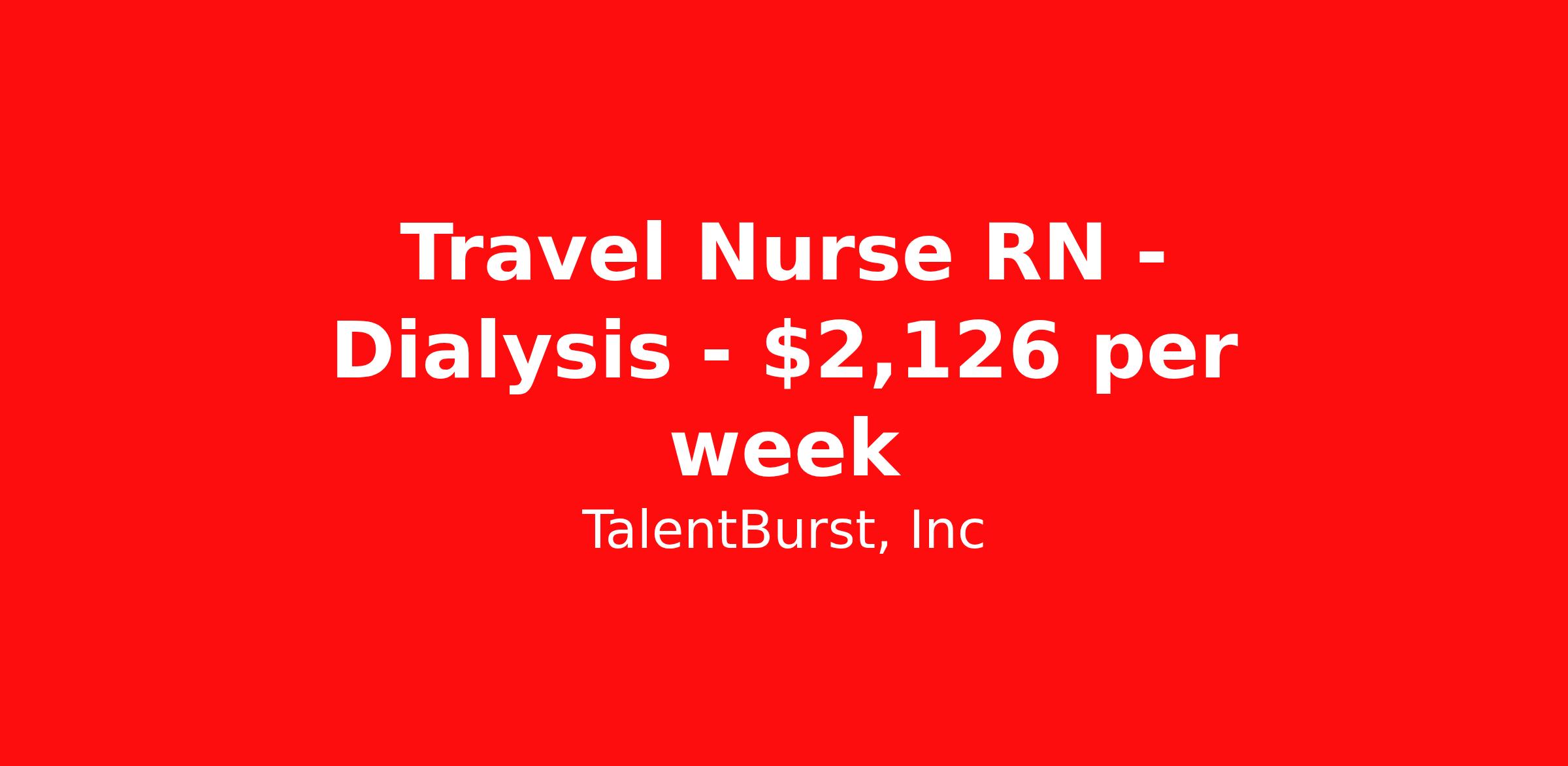 TalentBurst, Inc is seeking a travel nurse RN Dialysis for a travel nursing job in Joplin, Missouri. Job Description & Requirements Specialty: Dialysis Discipline: RN Duration: 13 weeks 40 hours per week Shift: 8 hours, days Employment Type: Travel Dialysis Chronic Care Registered Nurse Title: Dialysis Chronic Care Registered Nurse (RN) 12 months or more of Recent Dialysis experience required PURPOSE AND SCOPE: This position is accountable and responsible for the provision and coordination of clinically competent care including assessment, planning, intervention and evaluation for an assigned group of patients. This may include delegation of appropriate tasks to direct patient care staff including but not limited to RNs, LVN/LPNs and Patient Care Technicians. As a member of the End Stage Kidney Disease (ESKD) health care team, this position participates in decision-making, teaching, leadership functions, and quality improvement activities that enhance patient care outcomes and facility operations. PRINCIPAL DUTIES AND RESPONSIBILITIES: All duties and responsibilities are expected to be performed in accordance with Client policy, procedures, standards of nursing practice, state and federal regulations. Performs all essential functions under the direction of the Supervisor and with guidance from the Clinical Educator, Preceptor or in collaboration with other Registered Nurses. Performs ongoing, systematic collection and analysis of patient data pre – during – post hemodialysis treatment for assigned patients and documents in the patient medical record, makes adjustments or modifications to treatment plan as indicated and notifies Team Leader, Charge Nurse, Supervisor or Physician as needed. Assesses, collaborates, and documents patient/family's basic learning needs to provide initial and ongoing education to patients and family. Directs and provides, in collaboration with direct and ancillary patient care staff, all aspects of the daily provision of safe and effective delivery of hemodialysis therapy to assigned patients. Administers medications as prescribed or in accordance with approved algorithm(s), and documents appropriate medical justification and effectiveness. Initiates or assists with emergency response measures. Serves as a resource for health care team, participates in staff training and orientation of new staff as assigned. Ensures correct laboratory collection, processing and shipping procedures are performed and reschedules missed or insufficient laboratory collections. Identifies expected outcomes, documents and updates the nursing assessment and plan of care for assigned patients through collaboration with the Interdisciplinary Team. Ensures patient awareness related to transplant and treatment modality options. Performs all other duties as assigned by Supervisor. PHYSICAL DEMANDS AND WORKING CONDITIONS: The physical demands and work environment characteristics described here are representative of those an employee encounters while performing the essential functions of this job. The position provides direct patient care that regularly involves heavy lifting, moving of patients and assisting with ambulation. Equipment aids and/or coworkers may provide assistance. This position requires frequent, prolonged periods of standing and the employee must be able to bend over. The employee may occasionally be required to move, with assistance, machines and equipment of up to 200 lbs., and may lift chemical and water solutions of up to 30 lbs. as high as 5 feet. The work environment is characteristic of a health care facility with air temperature control and moderate noise levels. May be exposed to infectious and contagious diseases/materials. Day to day work includes desk work, computer work, interaction with patients, facility/hospital staff and physicians. The position may require travel to training sites or other facilities. May be asked to provide essential functions of this position in other locations with the same physical demands and working conditions as described above. Candidates are required to take the Ishihara's Color Blindness test as a condition of employment. Note that: Failing the Ishihara Test for Color Blindness does not preclude employment. The Company will consider whether reasonable accommodation can be made. SUPERVISION: Assigned oversight of Patient Care Technicians/LPNs/LVNs/RNs as a Team Leader or designated Nurse in Charge, after meeting all the following: Successful completion of all client education and training requirements for new employees. Must have a minimum of 9 months experience as a RN. Must have a minimum of 3 months experience in chronic/acute hemodialysis as a RN. EDUCATION and LICENSURE: Graduate of an accredited School of Nursing. Current appropriate state licensure. Current or successful completion of CPR BLS Certification. Must meet the practice requirements in the state in which he or she is employed. EXPERIENCE AND REQUIRED SKILLS: 1 year of Nephrology Nursing experience in the last two years as a RN. Chronic hemodialysis experience required Floating requirement: Client required candidates to float to area sites within 50 miles of the main site Shift details: Shifts will be discussed in detail during the interview; the role requires a commitment of 40 hours plus overtime and floating to area sites as need be. There is a minimum guarantee of 36 hours per week. Please note you are NOT eligible for Guaranteed hours if any of the following happen: Schedule requests/restrictions Refuse to float Late to shift Left early Called out Time off planned Job Diva 25-47249 (M) About TalentBurst, Inc TalentBurst Health & Life Sciences is an established provider of healthcare workforce solutions, servicing healthcare facilities across the United States for over 15 years. As a Joint Commission Certified Agency, our commitment to quality, integrity, and exceptional service has made us a trusted name in the healthcare staffing landscape. Our mission is