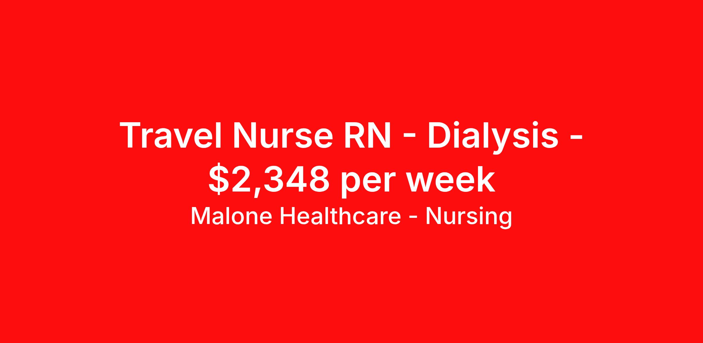 Malone Healthcare - Nursing is seeking a travel nurse RN Dialysis for a travel nursing job in Burlington, Vermont. Job Description & Requirements Specialty: Dialysis Discipline: RN Start Date: ASAP Duration: 13 weeks 36 hours per week Shift: 9 hours, days Employment Type: Travel About Malone Healthcare - Nursing With a commitment to providing a higher standard of service and experience in patient care, Malone Healthcare places expert nurses and allied health professionals in rewarding careers throughout the United States. As a leading healthcare staffing agency, Malone’s focus on compliance and integrity translates to a seamless experience for our team members and partner facilities. When you work with Malone Healthcare, you can rely on over 50 years of proven experience placing exceptional professionals in quality healthcare settings. Benefits Weekly pay Holiday Pay Guaranteed Hours Continuing Education 401k retirement plan Pet insurance Referral bonus Medical benefits Dental benefits Vision benefits License and certification reimbursement Life insurance
