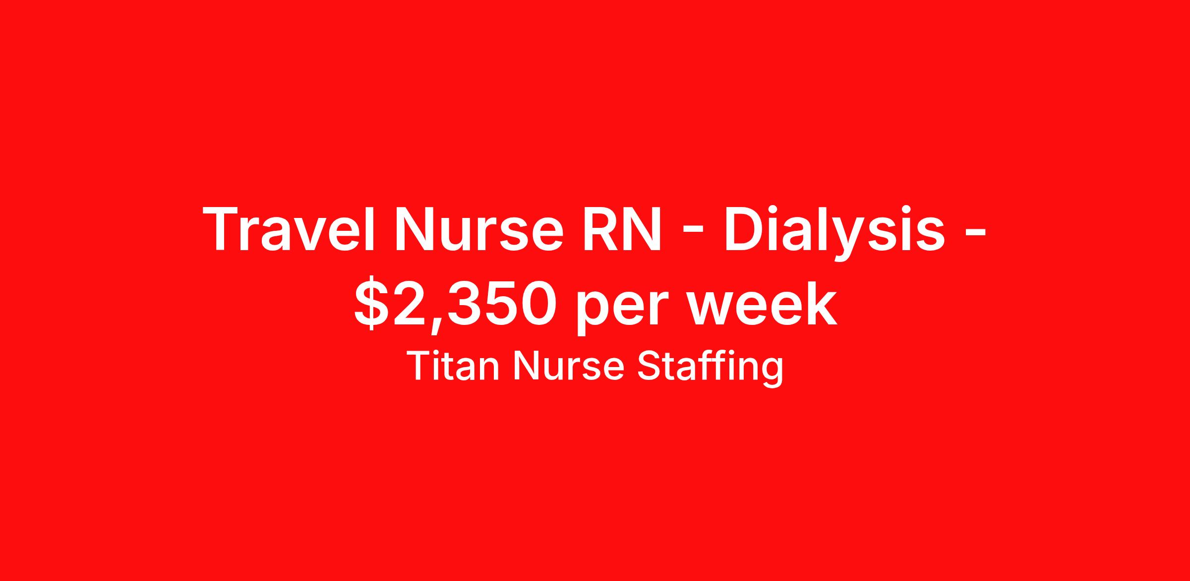 Titan Nurse Staffing is seeking a travel nurse RN Dialysis for a travel nursing job in Tuscaloosa, Alabama. Job Description & Requirements Specialty: Dialysis Discipline: RN Start Date: 04/27/2026 Duration: 13 weeks 48 hours per week Shift: 12 hours, nights Employment Type: Travel Health care professional needed for a Dialysis position in AL. Must have a minimum of 2 years experience as a Dialysis RN. We offer our clients the best in traveling medical professionals. The only way we can attract and maintain a good relationship with those professionals is to keep their best interests in mind. After all, our success relies on your success. That’s why we always put your best interests in mind — from superior placements to finding great living accommodations and negotiating a fair price to providing the tools you need for success. Titan Medical is one of the top medical staffing agencies because we provide superior support to our travelers every step of the way. About Titan Nurse Staffing We Take Care of You. While the availability of medical technicians and professionals becomes increasingly limited, there seems to be no shortage of staffing firms. That’s why Titan Medical works hard to distinguish itself through our responsiveness, our candidates and our attentiveness to your individual needs. When we say, “We take care of you.” We mean it – both to the medical professionals we represent and the healthcare organizations that rely on us for quality candidates. Founded by experienced medical professional recruiters and healthcare human resource professionals, Titan Medical was created as an alternative to other staffing resources. We found that by focusing on the needs of the individuals we served, we were able to attract higher quality candidates and clients in need of their services. It’s a risk that paid off, making Titan Medical one of the leading medical professional staffing firms in the country. Our candidates include the very best in the fields of radiation oncology, rehabilitation, respiratory care, radiology services, nursing and medical laboratory have to offer. Our clients represent the broad diversity of the healthcare industry today – from leading national and regional healthcare centers to traditional hospitals, specialty care clinics and other centers of care.