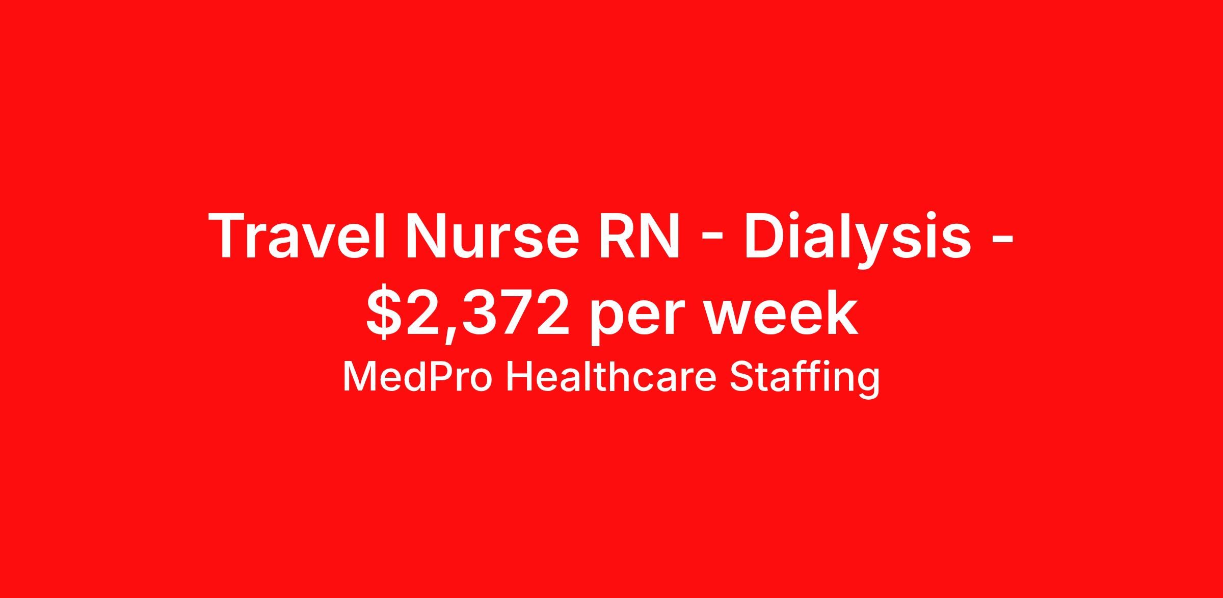 MedPro Healthcare Staffing is seeking a travel nurse RN Dialysis for a travel nursing job in Porcupine, South Dakota. Job Description & Requirements Specialty: Dialysis Discipline: RN Start Date: 03/30/2026 Duration: 13 weeks 40 hours per week Shift: 8 hours Employment Type: Travel MedPro Healthcare Staffing , a Joint Commission-certified staffing agency, is seeking a quality Dialysis Registered Nurses (RN) for a travel assignments with one of our top clients. Requirements Eighteen months of recent experience in an Acute Care Dialysis setting Active RN License BLS & ACLS Certifications Degree from accredited nursing program Benefits Weekly pay and direct deposit Full coverage of all credentialing fees Private housing or housing allowance Group Health insurance for you and your family Company-paid life and disability insurance Travel reimbursement 401(k) matching Unlimited Referral Bonuses up to $1,000 Duties Responsibilities The Dialysis nurse (RN) is responsible for administering a life-prolonging procedure. They support, medicate, and monitor patients throughout dialysis as well as educate them on kidney disease and help them to manage their disease. Provide care for patients undergoing dialysis procedures, Review patient data and make recommendations to the physician for care. Responsible for initiating a plan of care based on a patient’s specific needs, while also providing education to patients and their families About Agency MedPro Healthcare Staffing is a Joint Commission certified provider of contract staffing services. Since 1983, we have placed nursing and allied travelers in top healthcare facilities nationwide. Join us today for your very own MedPro Experience®. If qualified and interested, please call for immediate consideration. MedPro Staffing is an Equal Opportunity Employer. All applicants will be considered for employment without attention to race, color, religion, national origin, age, sex, disability, marital status or veteran status. Key Words: RN Travel, Travel Nurse, Dialysis Contract Nurse, Agency Nurse, Travel Contract, Travel Nursing, Dialysis *Weekly payment estimates are intended for informational purposes only and include a gross estimate of hourly wages and reimbursements for meal, incidental, and housing expenses. Your recruiter will confirm your eligibility and provide additional details. MedPro Job ID a0Fcx00000Fhyt9EAB. Pay package is based on 8 hour shifts and 40 hours per week (subject to confirmation) with tax-free stipend amount to be determined. Posted job title: Dialysis Registered Nurses Nursing: Dialysis (Chronic). About MedPro Healthcare Staffing At MedPro Healthcare Staffing , we believe no one cares more for caregivers than we do. Our mission is simple: you focus on your patients, and we’ll take care of the rest. As a Joint Commission-certified leader in temporary and contract healthcare staffing since 1983, MedPro has proudly connected nursing and allied travelers with top healthcare facilities across the nation. With thousands of job opportunities available nationwide, we make it easy to find assignments that align with your goals and lifestyle. Our on-staff clinical support team—alongside a compassionate group of experienced recruiters—provides hands-on guidance every step of the way. From Day 1 medical benefits and a 401(k) plan to personalized career support, we’re committed to ensuring every professional we serve feels valued, cared for, and empowered to succeed. Guided by a CEO who is a Registered Nurse, MedPro is built on a foundation of clinical insight and genuine compassion for the caregiving community. Through The MedPro Experience® , we deliver travel assignments that are rewarding, memorable, and designed to help you DREAM big, EXPLORE often, and ACHIEVE greatness. Benefits Day 1 medical, dental, and vision benefits for you and your family Weekly pay and direct deposit Unlimited Referral Bonuses starting at $500 On Staff Clinical Support Team Access to nationwide travel assignments MPX Mobile app -24/7 real-time access to jobs, credentials, assignment details, and more Full coverage of all credentialing fees Private housing or housing allowance Tax Free Per Diems, Housing Stipends and Travel Reimbursements Company-paid life and disability insurance Travel reimbursement 401(k) matching Benefits Weekly pay Referral bonus Employee assistance programs