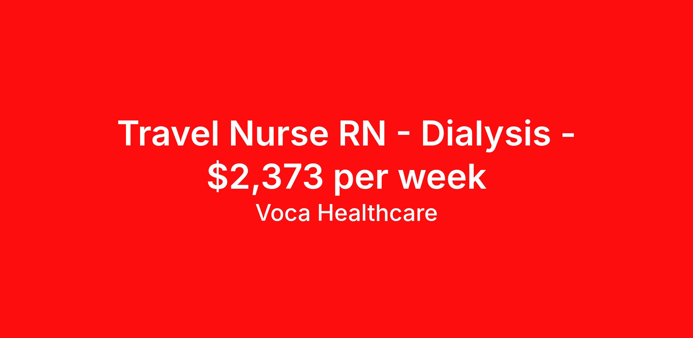 Voca Healthcare is seeking a travel nurse RN Dialysis for a travel nursing job in Pecos, Texas. Job Description & Requirements Specialty: Dialysis Discipline: RN Start Date: 03/30/2026 Duration: 13 weeks 36 hours per week Shift: 12 hours, days Employment Type: Travel Outpatient Dialysis Clinic - The expected services are 95% outpatient with the rare potential of providing Dialysis 1:1 in a patient room if admitted. 36-hour guarantee encompassing 3, 11-hour shifts Monday, Wednesday and Friday. There is a mandatory staff meeting once a month generally for 2 hours on a Tuesday. Shift is usually 5:00 am -5:30 pm or 7:00 am to 7:30 pm. This just depends on the census. There are no weekends or holidays unless the holiday falls on MWF. We are a 15-station unit of 2.5 shifts. Staffing ratio is 7-10 patients with 2-3 PCTs. There are generally 2-3 clinical Nurses for 15 patients. There are no education or certification requirements, just an active RN license to practice in the state of Texas. BLS and CPR required. About Voca Healthcare As a Voca Traveler, you will gain new clinical skills, visit amazing places and meet awesome healthcare professionals. As a travel health professional, your experience and dedication to patient care is in high demand throughout the United States. Whether you are a veteran traveler looking for your next opportunity, or you are looking to travel for the first time, Voca is here to support you. Voca’s experienced and dedicated travel team works in concert with you every step of the way. Our long-standing partnerships with some of the most respected and recognized healthcare organizations in the country allow us to identify career opportunities to help you increase your knowledge and experience while working with some of the best physicians and healthcare professionals in the world. At Voca, we strongly believe a better career results in a happier you. We are here to help you find a position that is professionally and personally rewarding. Benefits Holiday Pay 401k retirement plan Medical benefits Dental benefits Vision benefits Guaranteed Hours
