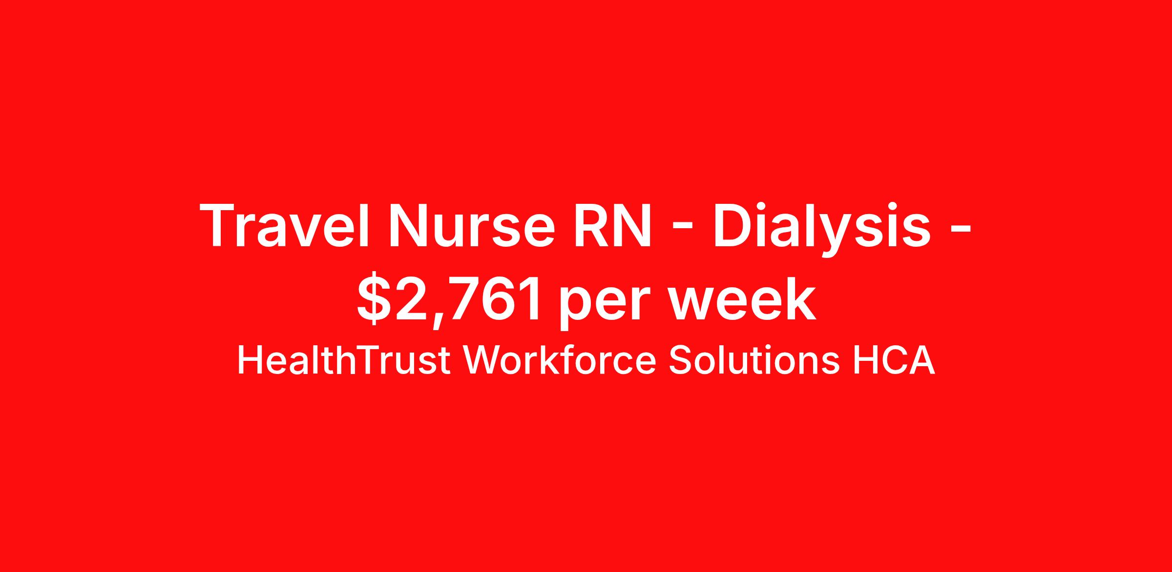 HealthTrust Workforce Solutions HCA is seeking a travel nurse RN Dialysis for a travel nursing job in Largo, Florida. Job Description & Requirements Specialty: Dialysis Discipline: RN Start Date: 04/13/2026 Duration: 13 weeks 40 hours per week Shift: 12 hours, days, evenings, flexible Employment Type: Travel PRN Dialysis RN Travel for a 13 weeks contract to our HCA Hospital in Pinellas FL. Must have a minimum of 2 year of recent acute dialysis RN experience. housing $1007.99 per week, Meal $553.00 per week, $30.00 per hour Unencumbered State Compact license and a BLS card. shifts are generally 3/12 to 4/12, 7am to 7pm. 1 to 2 days of calls. work requirements at lease 4 days per week. an additional $76.92 per week travel expense as travel . must float between 2 hospitals in the market. No medical benefits available on PRN travel except 401K PRN Dialysis RN Travel for a 13 weeks contract to our HCA Hospital in Pinellas FL. Must have a minimum of 2 year of recent acute dialysis RN experience. housing $1007.99 per week, Meal $553.00 per week, $30.00 per hour Unencumbered State Compact license and a BLS card. shifts are generally 3/12 to 4/12, 7am to 7pm. 1 to 2 days of calls. work requirements at lease 4 days per week. an additional $76.92 per week travel expense as travel . must float between 2 hospitals in the market. No medical benefits available on PRN travel except 401K About HealthTrust Workforce Solutions HCA At HealthTrust Workforce Solutions, healthcare is not just about the four walls of a facility but about the people who provide and receive care. Our focus is on empowering healthcare professionals to deliver exceptional patient experiences by providing them with the necessary skills, tools, and support. We partner with healthcare facilities nationwide to ensure that the right professionals are in the right roles. We prioritize our clinicians by giving them a voice and access to opportunities to fulfill their mission of improving lives by providing quality patient care. We are committed to our core values of Trust, Innovation, Adaptability, Courage, and Accountability. We are dedicated to positively impacting the healthcare industry by providing first-priority access to more than 200,000 jobs nationwide to our healthcare professionals. Join us and be part of the HealthTrust family, where you can make a difference every day. We embrace our changing environment, and we maintain a culture that has a rich tradition of transforming itself to meet the challenges of the future. MISSION STATEMENT While putting great people in the right roles is essential, our mission is far greater. We want our clinicians to be part of the HealthTrust family, where healthcare professionals have a voice and are empowered with the right tools and opportunities to fulfill their personal mission of improving lives. Plus, as a preferred partner to thousands of top-performing hospitals, we provide our healthcare professionals with first-priority access to more than 200,000 jobs nationwide. Benefits Dental benefits Vision benefits Referral bonus Continuing Education Life insurance