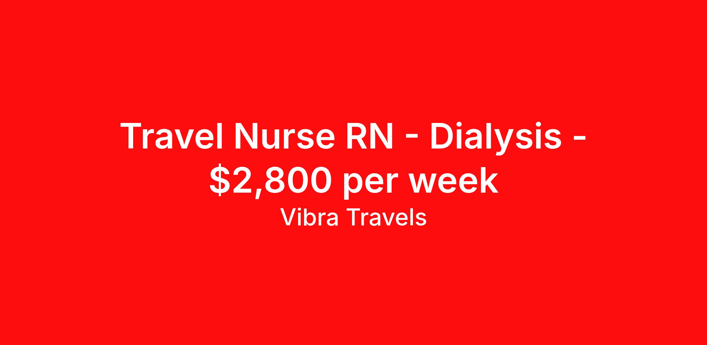 Vibra Travels is seeking a travel nurse RN Dialysis for a travel nursing job in Florence, Kentucky. Job Description & Requirements Specialty: Dialysis Discipline: RN Duration: 13 weeks 40 hours per week Shift: 8 hours, days Employment Type: Travel VIBRA TRAVELS is seeking a CORPORATE TRAVEL ACUTE CARE DIALYSIS RN to join our expanding network of healthcare professionals. We’re looking for dependable, detail-focused travelers with experience working in acute care or acute rehab hospital settings. If you're ready to assist in life-changing procedures while traveling the country, this is your opportunity! Facility Type: Dialysis Clinic Unlike working for agency after agency, with our travel program, you get to work for a company: • Work with 1 recruiter from start to finish and assignment to assignment • Local and Non-local positions available • Competitive hourly rate in addition to tax-free stipend (if applicable) • No pay cuts mid-contract • Referral bonus (up to $1000 per referral!) • License reimbursement if traveling to new state where new license is required Minimum Qualifications: • One (1) year of recent dialysis experience in an outpatient dialysis clinic required. • Current, valid, and active license to practice as a Registered Nurse in the state of employment required. • BLS certification from either AHA or American Red Cross required. • Current, valid, and active driver’s license required. • Ability to travel using publicly available air and ground transportation. Certificates, Licensures, Registrations • Current, valid, and active license to practice as a Registered Nurse in the state of employment required. Current BLS certification from AHA or American Red Cross required. • Other certifications may be required by the client. Ex: CDN (Certified Dialysis Nurse), CNN (Certified Nephrology Nurse), CHN (Certified Hemodialysis Nurse), CPDN (Certified Peritoneal Dialysis Nurse) Vibra Travels Job ID 20260319-31. Pay package is based on 8 hour shifts and 40 hours per week (subject to confirmation) with tax-free stipend amount to be determined. About Vibra Travels Regardless of the placement you’re seeking, you’ll experience the same great benefits when choosing Vibra Travels for your next contract. White-glove service, every step of the way: At Vibra Travels, we believe in providing top-notch service to our travel nurses. From the moment you first contact us, you’ll experience a level of support and care that sets us apart from the rest. Your recruiter, your partner: Unlike other travel nursing agencies, we believe in building one-on-one relationships with our clinicians. Your dedicated recruiter will be your advocate, guiding you through the entire process and ensuring your needs are met. Clinical support at your fingertips: We understand that being a traveler can sometimes be challenging. That’s why we have a dedicated clinical support team available to answer any questions or concerns you may have during your assignments. Nationwide placements, endless opportunities: With Vibra Travels, you’ll have access to placements across the nation. Whether you’re looking for an acute care, rehabilitation, critical care, or behavioral health hospital, we have opportunities waiting for you in every corner of the country. Join us today and experience traveling done different! Benefits Holiday Pay License and certification reimbursement Medical benefits Referral bonus