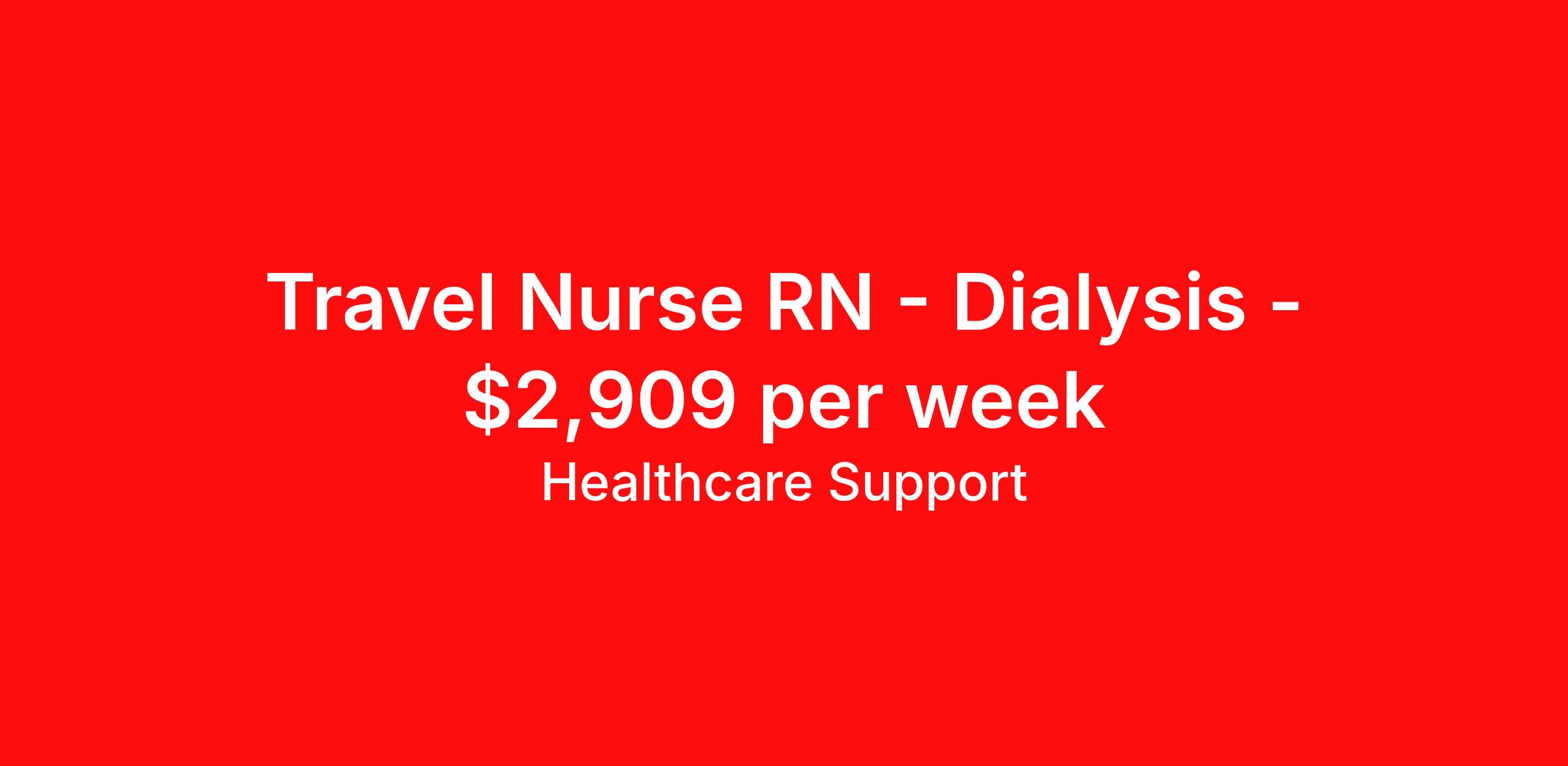 Healthcare Support is seeking a travel nurse RN Dialysis for a travel nursing job in Las Vegas, Nevada. Job Description & Requirements Specialty: Dialysis Discipline: RN Start Date: 03/30/2026 Duration: 50 weeks 36 hours per week Shift: 12 hours Employment Type: Travel Now Hiring: Travel Nurse Educator – Dialysis (5008X Trainer) Nationwide Travel | 36 hrs/week | Paid Training Included 50-Week Contract | No Direct Patient Care | RN Role Be part of a groundbreaking national project! We're seeking experienced Dialysis RNs to join a high-impact team rolling out the cutting-edge 5008X dialysis machine in clinics across the U.S. Your Role As a Travel Nurse Educator, you'll: Deliver hands-on training to clinic staff (RNs, LPNs, Techs) on the 5008X machine Travel in 3-week deployment cycles to different clinics nationwide Provide on-site support during live treatments (no direct patient care) Promote safe and effective machine use through collaboration and coaching What You’ll Get 50-week renewable contract – extensions likely! Full paid training (first 6 weeks) Dedicated recruiter to support you throughout your journey Schedules released 2 months in advance – plan with confidence What You’ll Need Active RN license (multi-state highly preferred) 1 year of dialysis RN experience (minimum 1 year in the past 3 years) Current BLS certification Willingness to travel full-time and lead hands-on training Compensation Weeks 1–6 (Training Period) $54/hour, travel stipends included if currently traveling. Varies by location EXAMPLE Pay Package Week 7 and Beyond (Travel Assignments Pay Varies By Location) Taxable Weekly Pay: $1,089 (W2) Non-Taxable Weekly Stipends: $1,869 Total Weekly Pay: $2,958 Healthcare Support Job ID 485767. Pay package is based on 12 hour shifts and 36 hours per week (subject to confirmation) with tax-free stipend amount to be determined. Posted job title: rn chronic dialysis About Healthcare Support Healthcare Support excels at providing a streamlined and red-carpet experience for our travelers. Whether you are a nurse, a therapist, or an allied health professional, our goal is to connect you with top-rated facilities throughout the country and get you on the road to your next adventure. We leverage 20 years of relationships with the industry’s most respectable companies across all 50 states, both through direct client partnerships and via national MSP programs. From health systems and hospitals to specialty clinics and post-acute facilities, you can work where you want to work and go where you want to go. Not only does HealthCare Support reimburse for relocation and travel costs on your first check, but we also offer license and certification reimbursements required for your assignments so that you can focus on building your career. During your assignment, you’ll have access to medical benefits, 24/7 support from our Clinical Advocacy Team, and a travel team with stateside operations. Your travel team will include a designated credentialing expert to help you navigate every step of the on-boarding process, a payroll specialist who you can communicate with directly, and a skilled recruiter who takes the time to understand your needs and works hard to find the right position for you. Don’t get lost in the shuffle of another overblown staffing agency. Choose HealthCare Support to be your trusted partner that you can rely on for all your travel assignments. We can’t wait to hear about the amazing adventures you’ll have! Pst! Ask us about our Direct Hire Opportunities! Benefits License and certification reimbursement Medical benefits Dental benefits Mileage reimbursement Employee assistance programs Referral bonus 401k retirement plan Holiday Pay Weekly pay