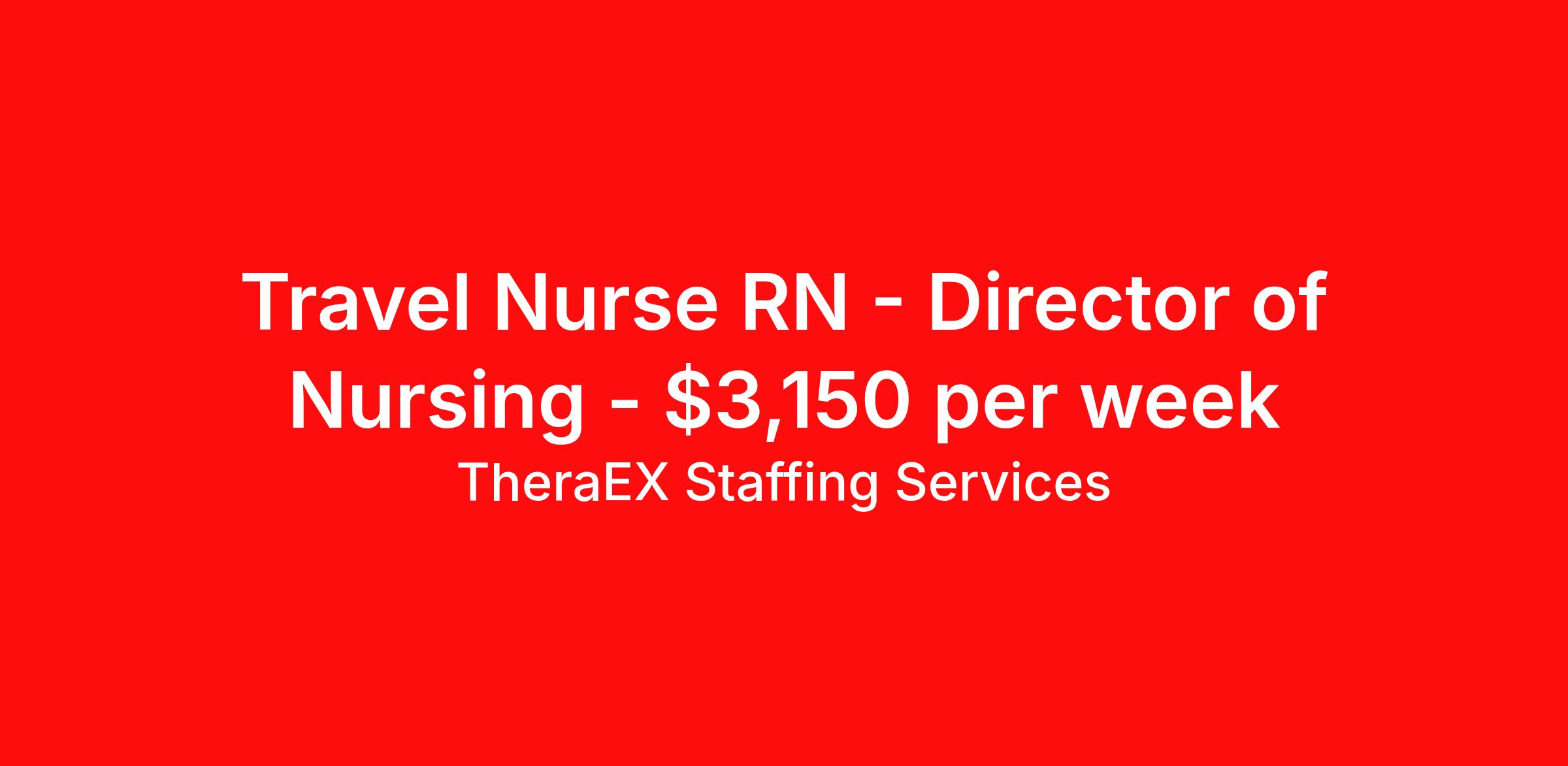 TheraEX Staffing Services is seeking a travel nurse RN Director of Nursing for a travel nursing job in Decatur, Illinois. Job Description & Requirements Specialty: Director of Nursing Discipline: RN Duration: 13 weeks 40 hours per week Shift: 8 hours, days, flexible Employment Type: Travel Minimum 2-year recent Director of Nursing (DON) experience in LTC/Nursing Home setting / CERTIFICATIONS – BLS / Schedule: Days, 8s, 40 hrs/week, 13 weeks / Start Date: ASAP / LTC / Nursing Home / Location: Petersburg, IL TheraEX Staffing Services Job ID 26-10773. Pay package is based on 8 hour shifts and 40 hours per week (subject to confirmation) with tax-free stipend amount to be determined. About TheraEX Staffing Services TheraEx Staffing Services is a leading name in healthcare staffing solutions. We enroll talented professionals to provide temporary staff to fill the needs of healthcare facilities across the nation. Benefits Dental benefits Vision benefits 401k retirement plan Health Care FSA Life insurance Sick pay Holiday Pay Medical benefits