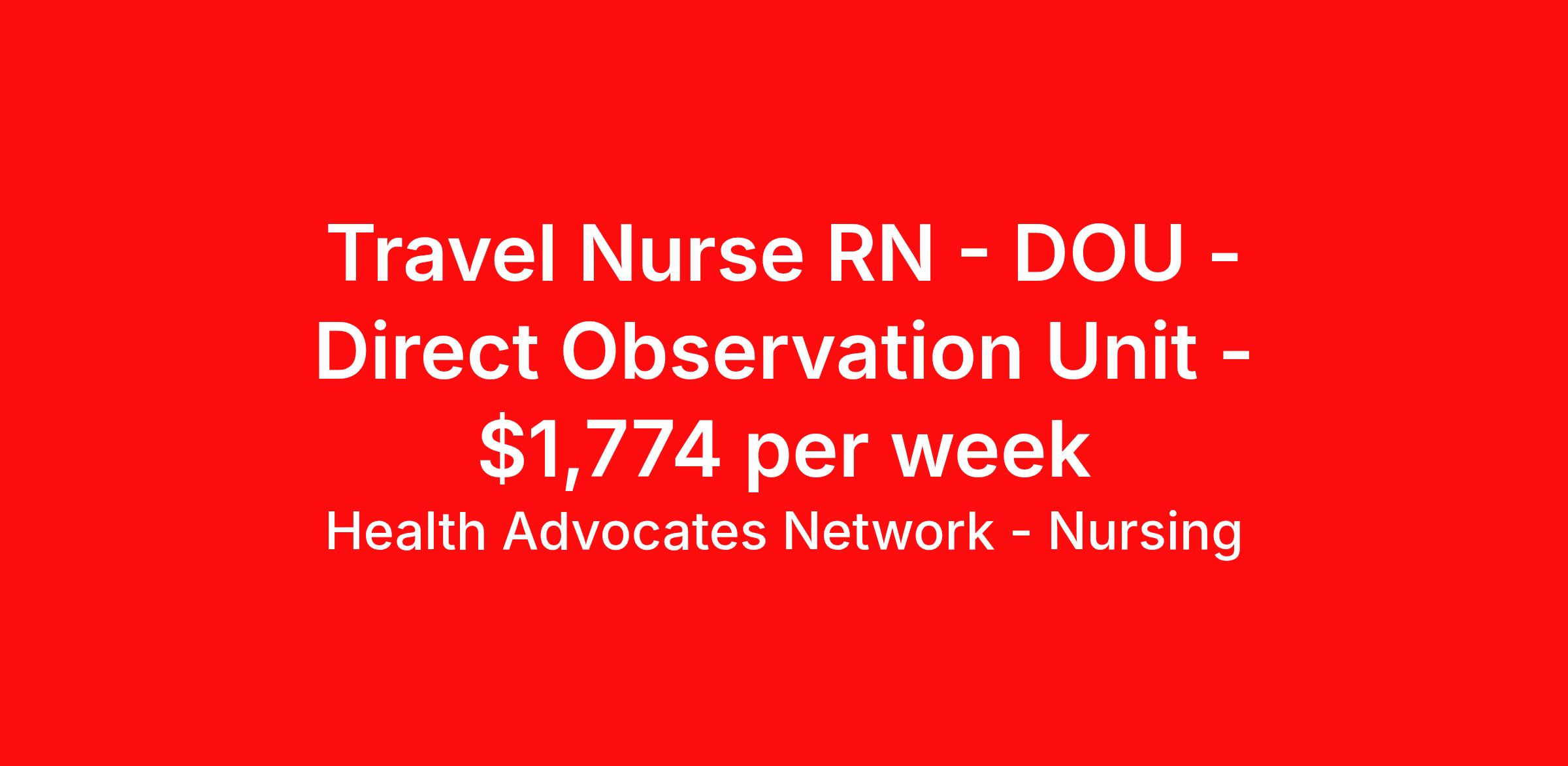 Health Advocates Network - Nursing is seeking a travel nurse RN DOU - Direct Observation Unit for a travel nursing job in Fort Smith, Arkansas. Job Description & Requirements Specialty: DOU - Direct Observation Unit Discipline: RN Start Date: 04/13/2026 Duration: 13 weeks 36 hours per week Shift: 12 hours, days Employment Type: Travel HANStaff Job ID 523713. Pay package is based on 12 hour shifts and 36 hours per week (subject to confirmation) with tax-free stipend amount to be determined. Posted job title: RN - Observation About Health Advocates Network - Nursing Health Advocates Network was founded on the basis of a shared aspiration, to improve the way healthcare staffing is done. We are a company established and led by nurses. Our flexible approach enables us to develop solutions customized to your specific needs. From short- and long-term travel contracts to local and per diem assignments and more, we are here to get you to your next adventure! By solving challenges, providing the best placements, and advocating for you, we stand to help you thrive and pave the path forward in your career. Click on the videos below to learn more about our values!
