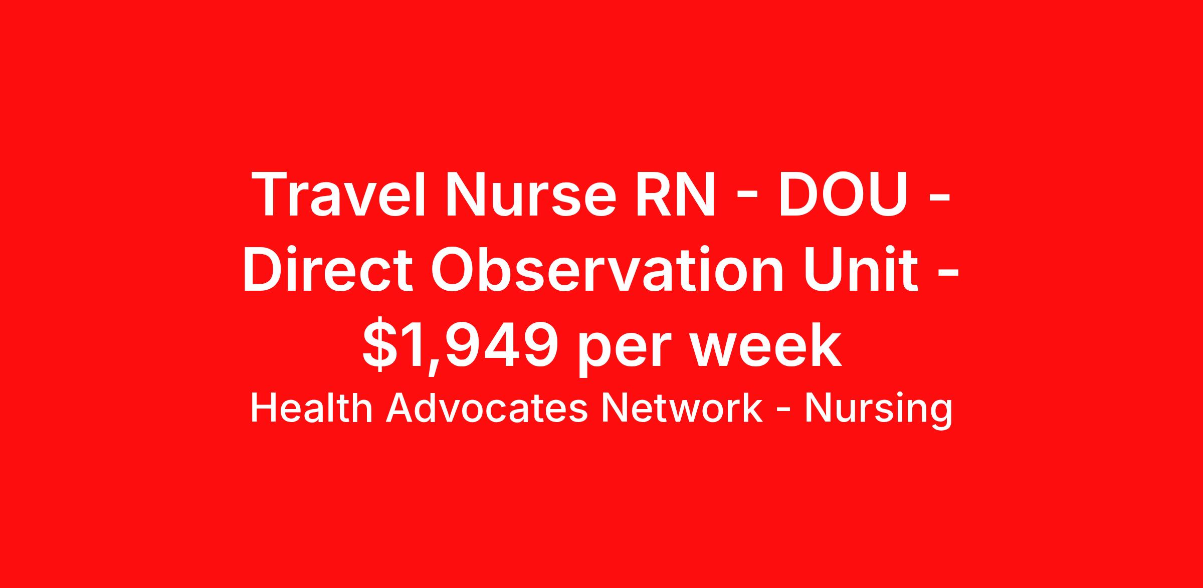 Health Advocates Network - Nursing is seeking a travel nurse RN DOU - Direct Observation Unit for a travel nursing job in Huntington, West Virginia. Job Description & Requirements Specialty: DOU - Direct Observation Unit Discipline: RN Start Date: 03/30/2026 Duration: 13 weeks 36 hours per week Shift: 12 hours, nights Employment Type: Travel HANStaff Job ID 524321. Pay package is based on 12 hour shifts and 36 hours per week (subject to confirmation) with tax-free stipend amount to be determined. Posted job title: RN - Observation About Health Advocates Network - Nursing Health Advocates Network was founded on the basis of a shared aspiration, to improve the way healthcare staffing is done. We are a company established and led by nurses. Our flexible approach enables us to develop solutions customized to your specific needs. From short- and long-term travel contracts to local and per diem assignments and more, we are here to get you to your next adventure! By solving challenges, providing the best placements, and advocating for you, we stand to help you thrive and pave the path forward in your career. Click on the videos below to learn more about our values!