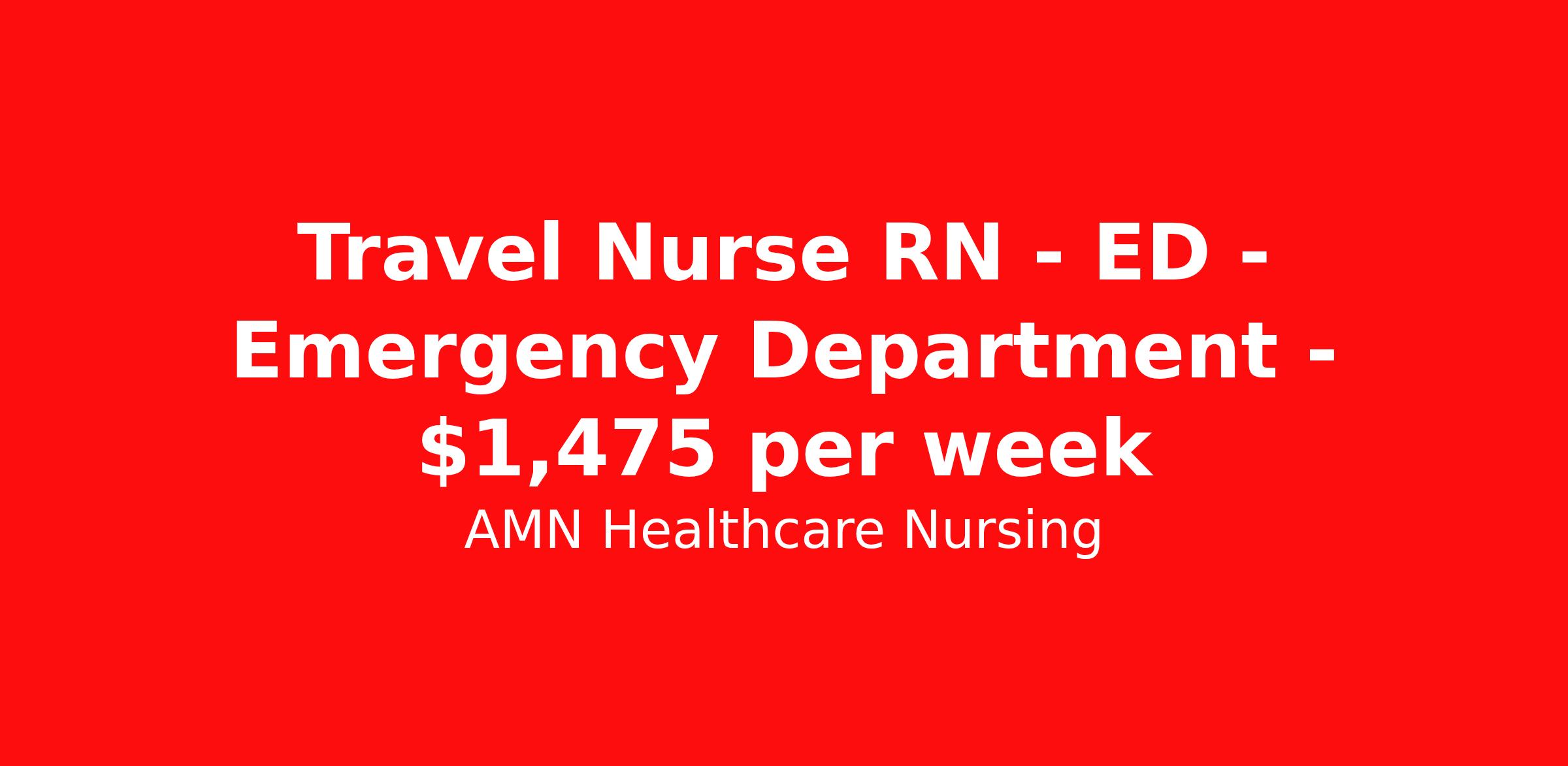 AMN Healthcare Nursing is seeking a travel nurse RN ED - Emergency Department for a travel nursing job in BENTONVILLE, Arkansas. Job Description & Requirements Specialty: ED - Emergency Department Discipline: RN Start Date: 04/06/2026 Duration: 13 weeks 36 hours per week Shift: 12 hours, nights Employment Type: Travel Job Description & Requirements Registered Nurse – Emergency Room - Travel - (ER RN) StartDate: 4/6/2026 Available Shifts: 12 N Pay Rate: $1430.00 - $1519.00 This outstanding unit is looking for the right ER RN to join their team of compassionate and driven health care professionals. Join this highly motivated team of caregivers and enjoy a challenging and welcoming environment based on optimal patient care. Required Qualifications Registered Nurse, ER Experience: 3 years Licenses: RN(Compact Accepted)(Copy needed) Certifications: ACLS(Copy Needed); BLS(Copy Needed); PALS(Copy Needed); CERT-TNCC(Copy Needed); CERT-NIH Stroke Scale SSN Required DOB Required References: 1 Reference in entire work history 50-mile radius rule Facility Location Job Benefits At AMN Healthcare we take care of our travelers! We offer: Competitive pay rates Free, quality, private housing Medical, Dental, Vision 401(k) and Flex Spending Life Insurance Accident and Short-term Disability Coverage Free Continuing Education Refer a friend and earn extra cash! About the Company At AMN Healthcare, we strive to be recognized as the most trusted, innovative, and influential force in helping healthcare organizations provide quality patient care that continually evolves to make healthcare more human, more effective, and more achievable. Emergency room nurse, emergency nurse, ER nurse, ER RN, emergency room, trauma, trauma nurse, acute care nurse, registered nurse, RN, R.N., nursing, nurse, emergency, healthcare, health care, hospital American Mobile Healthcare Job ID 3467323. Pay package is based on 12 hour shifts and 36 hours per week (subject to confirmation) with tax-free stipend amount to be determined. Posted job title: Registered Nurse – Emergency Room - Travel - (ER RN) About AMN Healthcare Nursing AMN Healthcare is a leader in Nurse staffing. Our relationships with numerous healthcare facilities - including hospitals, home health agencies, and long-term care facilities - enable us to offer the most current travel nurse, local staffing, rapid response and crisis nurse jobs nationwide. We''re committed to finding you the best nursing job to fit your career goals. AMN Healthcare is an EEO/AA/Disability/Protected Veteran Employer. We encourage minority and female applicants to apply. Benefits Company provided housing options Medical benefits Dental benefits Continuing Education