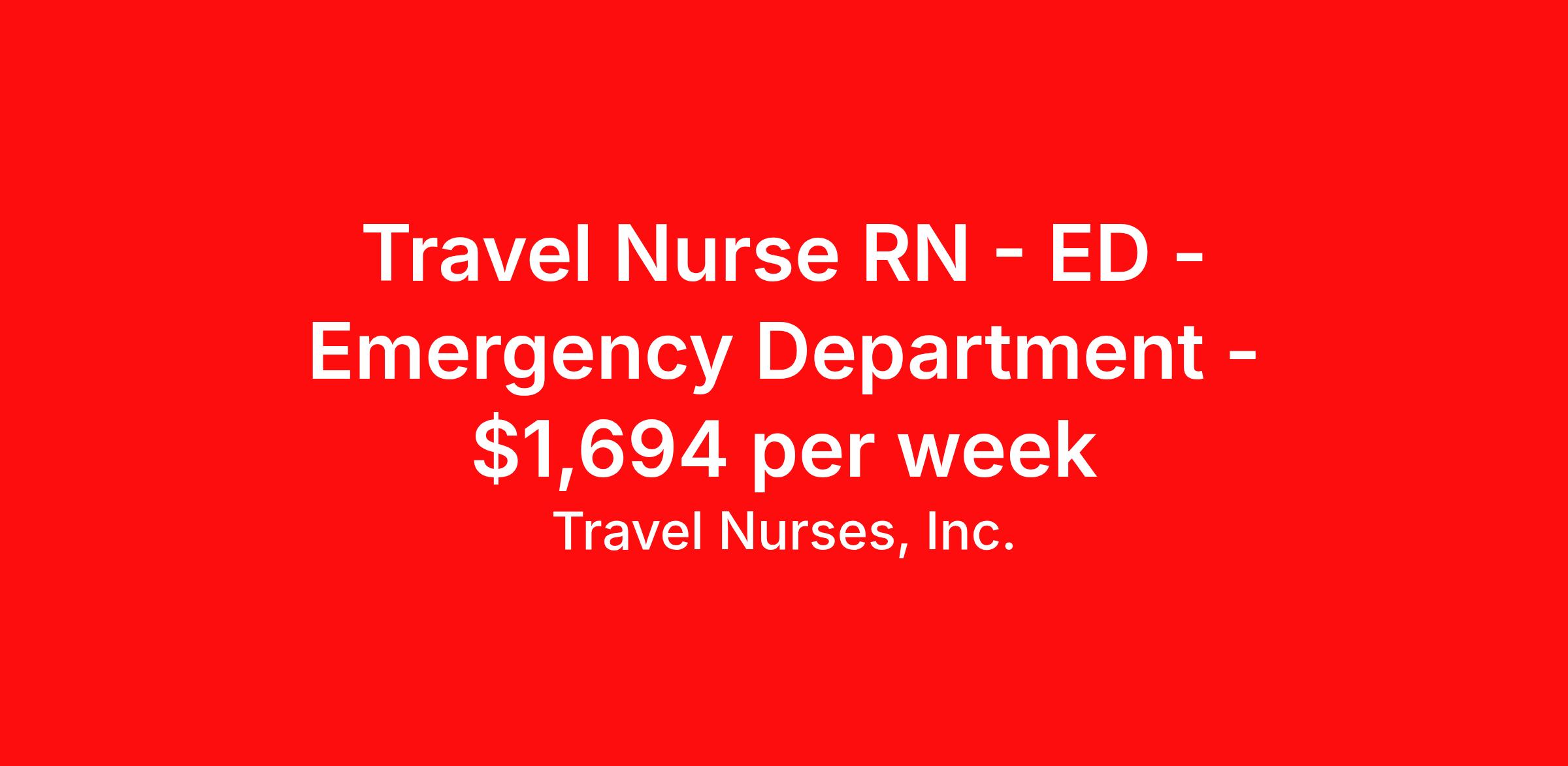 Travel Nurses, Inc. is seeking a travel nurse RN ED - Emergency Department for a travel nursing job in Hickory, North Carolina. Job Description & Requirements Specialty: ED - Emergency Department Discipline: RN Start Date: 03/23/2026 Duration: 13 weeks 36 hours per week Shift: 12 hours Employment Type: Travel Travel Nurses, Inc. Job ID 306807. Pay package is based on 12 hour shifts and 36 hours per week (subject to confirmation) with tax-free stipend amount to be determined. Posted job title: ER Registered Nurse About Travel Nurses, Inc. Travel Nurses, Inc. is a leading healthcare staffing agency that provides healthcare professionals with opportunities to work across the country. Founded by nurses in 1988, TNI has more than 30 years of experience in the industry. The agency initially focused on staffing operating room settings in the MidSouth. However, this quickly evolved to encompass all nursing specialties and allied health fields nationwide. At the heart of our mission is a profound respect for nurses, whom we consider the cornerstone of healthcare. This acknowledgment extends beyond the nursing profession alone. Travel Nurses, Inc. now proudly embraces a wide array of healthcare professionals, recognizing their crucial roles in our collective mission. Travel Nurses, Inc. is dedicated to providing comprehensive support and opportunities that will help facilitate complete career mobility in the healthcare field. Our commitment to transparency ensures that all professionals, not just nurses, can confidently accept any assignment without financial uncertainties. We prioritize our professionals’ well-being with comprehensive benefits packages, including day-one healthcare coverage, competitive salaries, bonuses and incentives. This underscores our unwavering commitment to offering the best possible rewards and support for all the professionals we serve. Benefits Weekly pay Continuing Education 401k retirement plan Wellness and fitness programs Mileage reimbursement Referral bonus Employee assistance programs Medical benefits Dental benefits Vision benefits Benefits start day 1 License and certification reimbursement Life insurance Retention bonus