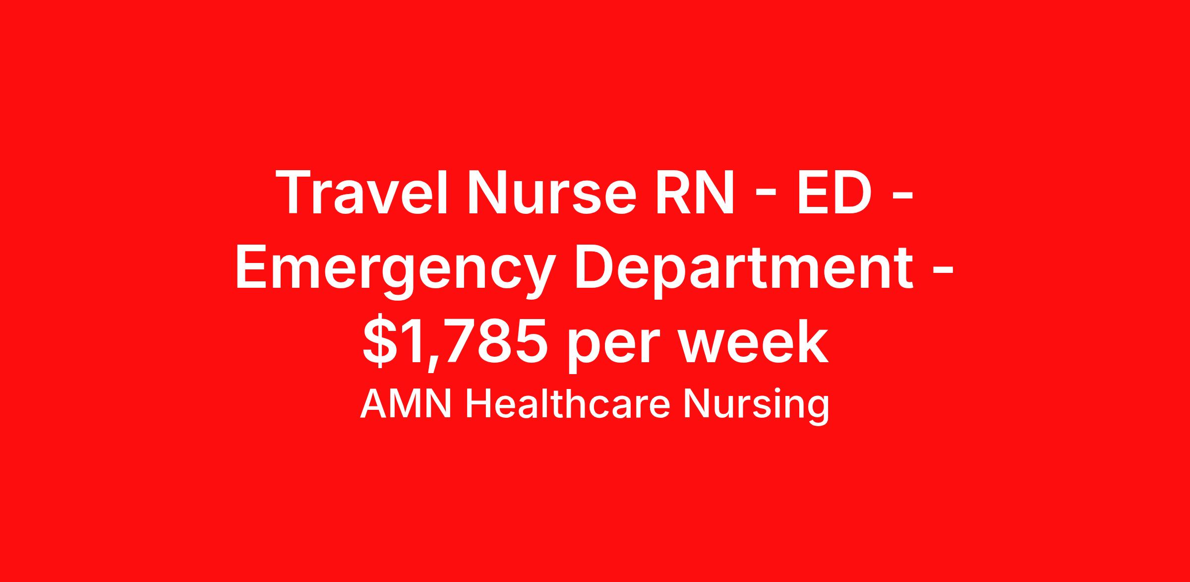 AMN Healthcare Nursing is seeking a travel nurse RN ED - Emergency Department for a travel nursing job in NAMPA, Idaho. Job Description & Requirements Specialty: ED - Emergency Department Discipline: RN Duration: 13 weeks 36 hours per week Shift: 12 hours, evenings Employment Type: Travel Job Description & Requirements Registered Nurse – Emergency Room - Travel - (ER RN) StartDate: ASAP Available Shifts: 12 E Pay Rate: $1731.00 - $1838.00 This outstanding unit is looking for the right RN to join their team of compassionate and driven health care professionals. Join this highly motivated team of caregivers and enjoy a challenging and welcoming environment based on optimal patient care. Required Qualifications Registered Nurse, ER Licenses: RN(Compact Accepted) SSN Required DOB Required References: 2 References in entire work history Job Benefits At AMN Healthcare we take care of our travelers! We offer: Competitive pay rates Free, quality, private housing Medical, Dental, Vision 401(k) and Flex Spending Life Insurance Accident and Short-term Disability Coverage Free Continuing Education Refer a friend and earn extra cash! About the Company At AMN Healthcare, we strive to be recognized as the most trusted, innovative, and influential force in helping healthcare organizations provide quality patient care that continually evolves to make healthcare more human, more effective, and more achievable. Emergency room nurse, emergency nurse, ER nurse, ER RN, emergency room, trauma, trauma nurse, acute care nurse, registered nurse, RN, R.N., nursing, nurse, emergency, healthcare, health care, hospital American Mobile Healthcare Job ID 3384246. Pay package is based on 12 hour shifts and 36 hours per week (subject to confirmation) with tax-free stipend amount to be determined. Posted job title: Registered Nurse – Emergency Room - Travel - (ER RN) About AMN Healthcare Nursing AMN Healthcare is a leader in Nurse staffing. Our relationships with numerous healthcare facilities - including hospitals, home health agencies, and long-term care facilities - enable us to offer the most current travel nurse, local staffing, rapid response and crisis nurse jobs nationwide. We''re committed to finding you the best nursing job to fit your career goals. AMN Healthcare is an EEO/AA/Disability/Protected Veteran Employer. We encourage minority and female applicants to apply. Benefits Company provided housing options Medical benefits Dental benefits Continuing Education