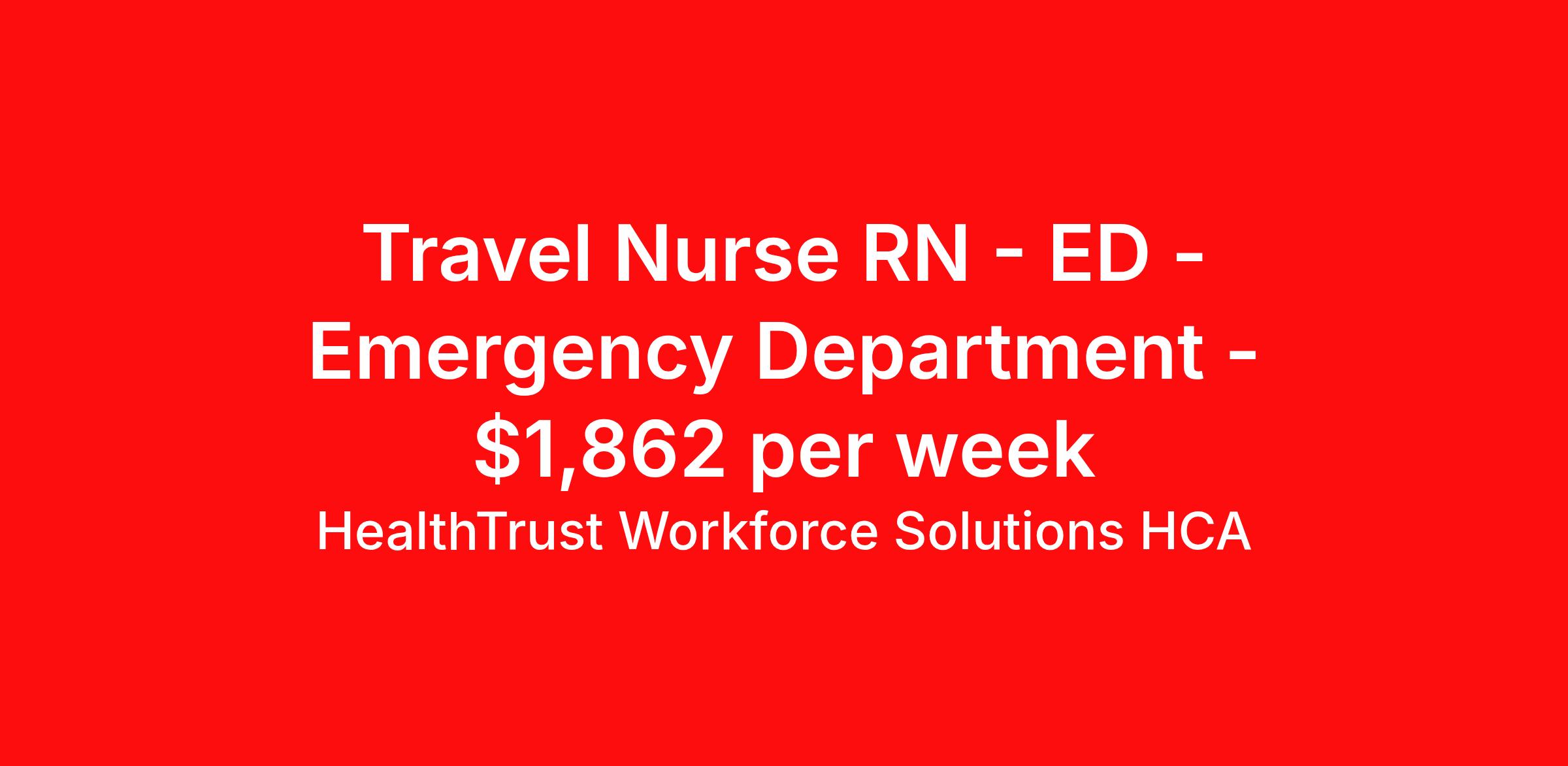 HealthTrust Workforce Solutions HCA is seeking a travel nurse RN ED - Emergency Department for a travel nursing job in Brownsville, Texas. Job Description & Requirements Specialty: ED - Emergency Department Discipline: RN Start Date: 04/27/2026 Duration: 13 weeks 36 hours per week Shift: 12 hours, nights Employment Type: Travel About HealthTrust Workforce Solutions HCA At HealthTrust Workforce Solutions, healthcare is not just about the four walls of a facility but about the people who provide and receive care. Our focus is on empowering healthcare professionals to deliver exceptional patient experiences by providing them with the necessary skills, tools, and support. We partner with healthcare facilities nationwide to ensure that the right professionals are in the right roles. We prioritize our clinicians by giving them a voice and access to opportunities to fulfill their mission of improving lives by providing quality patient care. We are committed to our core values of Trust, Innovation, Adaptability, Courage, and Accountability. We are dedicated to positively impacting the healthcare industry by providing first-priority access to more than 200,000 jobs nationwide to our healthcare professionals. Join us and be part of the HealthTrust family, where you can make a difference every day. We embrace our changing environment, and we maintain a culture that has a rich tradition of transforming itself to meet the challenges of the future. MISSION STATEMENT While putting great people in the right roles is essential, our mission is far greater. We want our clinicians to be part of the HealthTrust family, where healthcare professionals have a voice and are empowered with the right tools and opportunities to fulfill their personal mission of improving lives. Plus, as a preferred partner to thousands of top-performing hospitals, we provide our healthcare professionals with first-priority access to more than 200,000 jobs nationwide. Benefits Dental benefits Vision benefits Referral bonus Continuing Education Life insurance