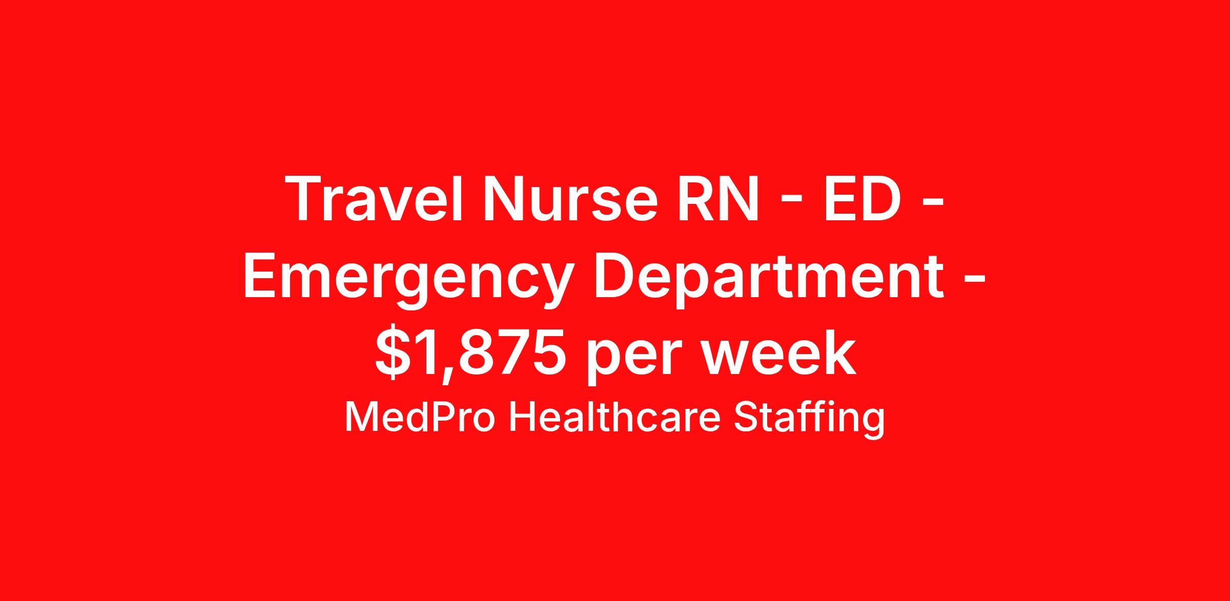MedPro Healthcare Staffing is seeking a travel nurse RN ED - Emergency Department for a travel nursing job in La Junta, Colorado. Job Description & Requirements Specialty: ED - Emergency Department Discipline: RN Start Date: 05/25/2026 Duration: 13 weeks 36 hours per week Shift: 12 hours, evenings Employment Type: Travel MedPro Healthcare Staffing , a Joint Commission-certified staffing agency, is seeking a quality Registered Nurse - Emergency Room for a travel assignment with one of our top healthcare clients. Requirements Active RN License Degree from accredited nursing program BLS, ACLS, PALS & TNCC may be required in some positions Eighteen months of recent experience in an Acute Care Emergency Room setting Other requirements to be determined by our client facility Benefits Weekly pay and direct deposit Full coverage of all credentialing fees Private housing or housing allowance Group Health insurance for you and your family Company-paid life and disability insurance Travel reimbursement 401(k) matching Unlimited Referral Bonuses up to $1,000 Duties Responsibilities Emergency Room registered nurses (RN) provide care for patients from various types of illness or trauma requiring emergency attention and must be able to recognize and effectively treat life-threatening conditions Responsible for assessing, intervening and stabilizing a variety of trauma and illnesses with decisive action. Due to the range of medical conditions that may require urgent treatment and care, they must be knowledgeable about general as well as specific health issues. Properly understand triage in order to prioritize injuries based on medical need. Able to make quick and accurate assessments about incoming patients, including both physical and mental health conditions. About Agency MedPro Healthcare Staffing is a Joint Commission certified provider of contract staffing services. Since 1983, we have placed nursing and allied travelers in top healthcare facilities nationwide. Join us today for your very own MedPro Experience®. If qualified and interested, please call for immediate consideration. MedPro Staffing is an Equal Opportunity Employer. All applicants will be considered for employment without attention to race, color, religion, national origin, age, sex, disability, marital status or veteran status. Key Words: Emergency Room Nurse, RN-ER, Emergency Room, Critical Care, Emergency Department, ACLS, EKG, Travel Nurse, Contract Nurse, Agency Nurse, Travel Contract, ER-RN, RN-ED, Emergency Room Nursing, ED Nurse, ER positions, RN-ER positions, ER Contracts, Travel Nurse *Weekly payment estimates are intended for informational purposes only and include a gross estimate of hourly wages and reimbursements for meal, incidental, and housing expenses. Your recruiter will confirm your eligibility and provide additional details. MedPro Job ID a0Fcx00000HMtP3EAL. Pay package is based on 12 hour shifts and 36 hours per week (subject to confirmation) with tax-free stipend amount to be determined. Posted job title: Emergency Room Registered Nurse Nursing: Emergency Room. About MedPro Healthcare Staffing At MedPro Healthcare Staffing , we believe no one cares more for caregivers than we do. Our mission is simple: you focus on your patients, and we’ll take care of the rest. As a Joint Commission-certified leader in temporary and contract healthcare staffing since 1983, MedPro has proudly connected nursing and allied travelers with top healthcare facilities across the nation. With thousands of job opportunities available nationwide, we make it easy to find assignments that align with your goals and lifestyle. Our on-staff clinical support team—alongside a compassionate group of experienced recruiters—provides hands-on guidance every step of the way. From Day 1 medical benefits and a 401(k) plan to personalized career support, we’re committed to ensuring every professional we serve feels valued, cared for, and empowered to succeed. Guided by a CEO who is a Registered Nurse, MedPro is built on a foundation of clinical insight and genuine compassion for the caregiving community. Through The MedPro Experience® , we deliver travel assignments that are rewarding, memorable, and designed to help you DREAM big, EXPLORE often, and ACHIEVE greatness. Benefits Day 1 medical, dental, and vision benefits for you and your family Weekly pay and direct deposit Unlimited Referral Bonuses starting at $500 On Staff Clinical Support Team Access to nationwide travel assignments MPX Mobile app -24/7 real-time access to jobs, credentials, assignment details, and more Full coverage of all credentialing fees Private housing or housing allowance Tax Free Per Diems, Housing Stipends and Travel Reimbursements Company-paid life and disability insurance Travel reimbursement 401(k) matching Benefits Weekly pay Referral bonus Employee assistance programs
