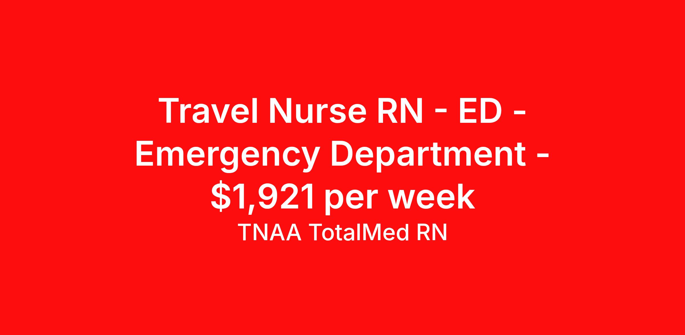 TNAA TotalMed RN is seeking a travel nurse RN ED - Emergency Department for a travel nursing job in Lexington, Kentucky. Job Description & Requirements Specialty: ED - Emergency Department Discipline: RN Start Date: 05/18/2026 Duration: 14 weeks 36 hours per week Shift: 12 hours, nights Employment Type: Travel We're looking for Emergency Room RNs for an immediate travel nurse opening in Lexington, KY. The right RN should have 1-2 years recent acute care experience. Read below for more requirements. As an ER Travel Nurse, you will work with a diverse team of caregivers to appropriately evaluate, triage and implement care using correct procedures and physician instructions. RNs should have experience and skill caring for patients in a fast-paced, urgent and emergency environment. Emergency Room RNs will perform minor medical operations, advise patients and family on illnesses or injuries, and plan long-term care needs. Other responsibilities as an ER Travel Nurse include documenting medical history, checking for any allergies patients might have, obtaining patient vital signs, and monitoring patients' emotional and physical well-being. As an ER Travel Nurse, you should be prepared to perform the following tasks: Provide basic bedside care. Clean and bandage wounds. Provide IV therapy. Maintain supplies and medical equipment. Report suspected abuse to appropriate agencies. ER Travel Nurses should be able to stand and walk for long periods of time, as well as bend, lean and stoop without difficulty. RNs should be able to easily lift 20 pounds. Moving or lifting of patients may require lifting of up to 50 pounds at times. Because of the fast-paced environment, Emergency Room RNs must possess good skills for coping with stress and be able to relate to people of all ages and backgrounds. Requirements*: ACLS, BLS, PALS, TNCC, NIH, 2 Years * Additional certifications may be required before beginning an assignment. TotalMed Travel Job ID 1396347. Pay package is based on 12 hour shifts and 36 hours per week (subject to confirmation) with tax-free stipend amount to be determined. Posted job title: Emergency Room - ER RN - Travel Nurse About TNAA TotalMed RN TotalMed is a Top Ten, travel nursing and healthcare staffing agency with the mission of igniting purpose in healthcare. The organization staffs nurses, therapists, pharmacists, and other clinicians of all specialties in all 50 states. They offer local and travel jobs and match caregivers with the right organization to assist both facilities and patients. As an organization, they focus on putting highly-skilled staff into facilities to ensure adequate staffing for a better patient experience. TotalMed specializes in recruiting and placing healthcare professionals in travel, PRN, and permanent positions across the country in Nursing and Allied Health. Throughout 2020, the organization filled roles at even the most short-staffed facilities during the most challenging time in healthcare. By matching the right travel healthcare professional with the right organization, TotalMed continues to offer a lifeline to facilities and their patients. Benefits Weekly pay Guaranteed Hours Continuing Education 401k retirement plan Sick pay Wellness and fitness programs Referral bonus Employee assistance programs Medical benefits Dental benefits Vision benefits Benefits start day 1