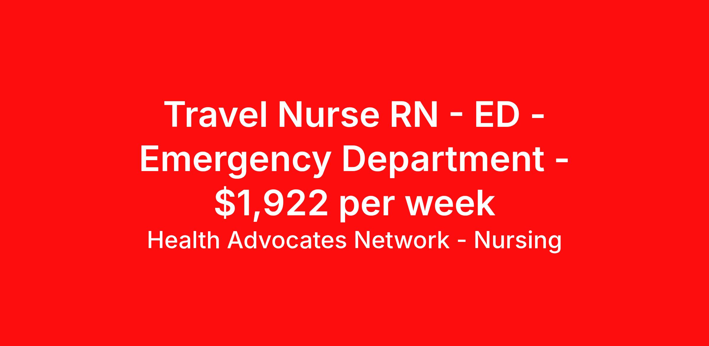 Health Advocates Network - Nursing is seeking a travel nurse RN ED - Emergency Department for a travel nursing job in Tucson, Arizona. Job Description & Requirements Specialty: ED - Emergency Department Discipline: RN Start Date: 03/30/2026 Duration: 13 weeks 36 hours per week Shift: 12 hours, nights Employment Type: Travel HANStaff Job ID 521762. Pay package is based on 12 hour shifts and 36 hours per week (subject to confirmation) with tax-free stipend amount to be determined. Posted job title: RN - ER About Health Advocates Network - Nursing Health Advocates Network was founded on the basis of a shared aspiration, to improve the way healthcare staffing is done. We are a company established and led by nurses. Our flexible approach enables us to develop solutions customized to your specific needs. From short- and long-term travel contracts to local and per diem assignments and more, we are here to get you to your next adventure! By solving challenges, providing the best placements, and advocating for you, we stand to help you thrive and pave the path forward in your career. Click on the videos below to learn more about our values!
