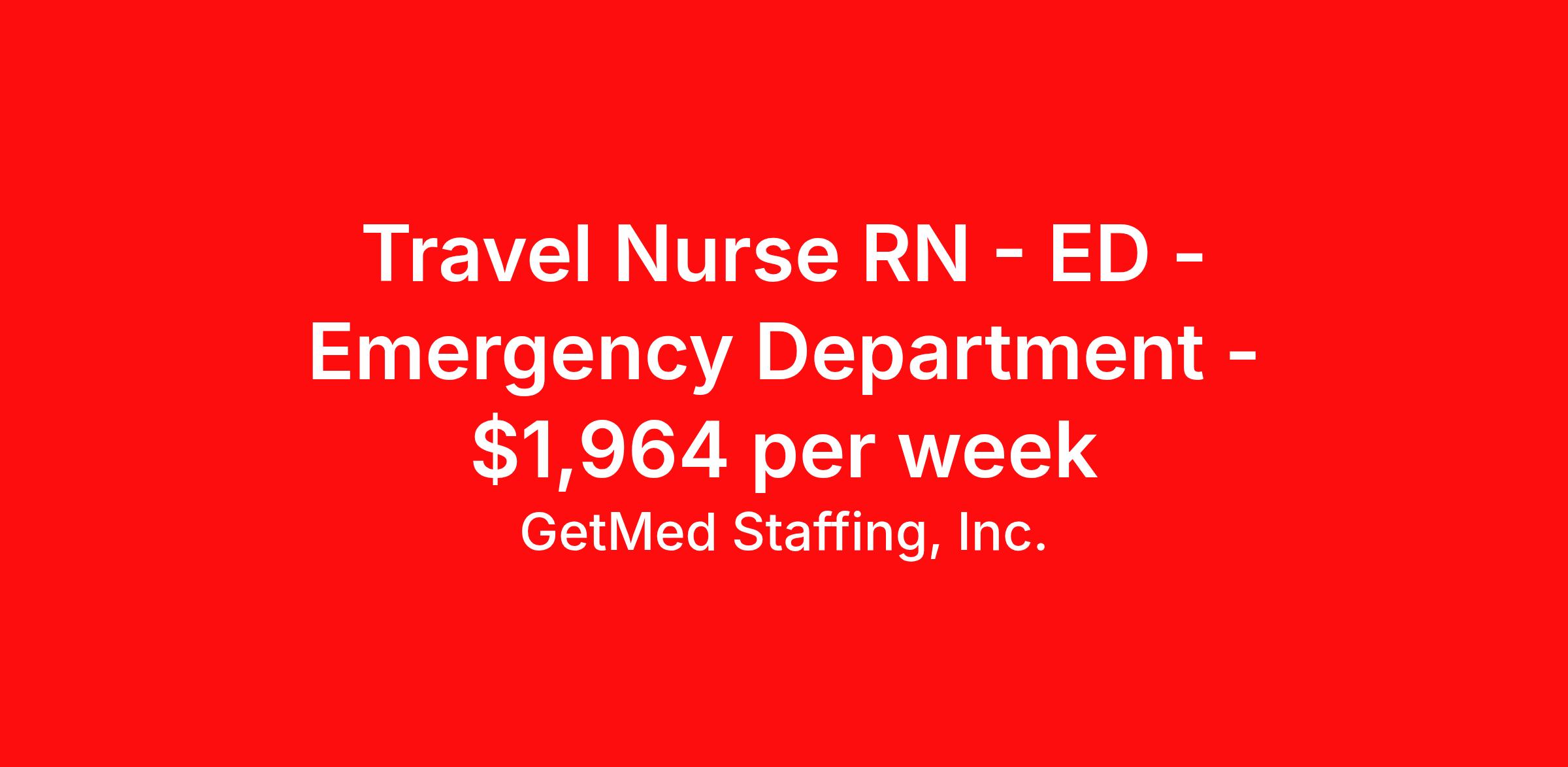 GetMed Staffing, Inc. is seeking a travel nurse RN ED - Emergency Department for a travel nursing job in Kremmling, Colorado. Job Description & Requirements Specialty: ED - Emergency Department Discipline: RN Start Date: 04/06/2026 Duration: 13 weeks 36 hours per week Shift: 12 hours, days Employment Type: Travel GetMed Staffing, Inc. Job ID 36193453. Pay package is based on 12 hour shifts and 36.0 hours per week (subject to confirmation) with tax-free stipend amount to be determined. Posted job title: RN:ER,07:00:00-19:00:00 About GetMed Staffing, Inc. We are a diversity owned company, specializing in healthcare recruiting services. We truly understand how important a healthcare travelers' relationship is with their recruiter, as well as our relationship is with our healthcare facilities. We recognize that the needs of our healthcare travelers can vary, and therefore we provide the personalized touch necessary to ensure a successful travel assignment each and every time. Our healthcare facilities and clients benefit from us putting our healthcare travelers first. GetMed Staffing is excited to be a leader within the industry by focusing on providing healthcare travelers with more choices and possibilities as they plan for their next healthcare travel assignment. Benefits Life insurance Medical benefits Dental benefits Vision benefits 401k retirement plan
