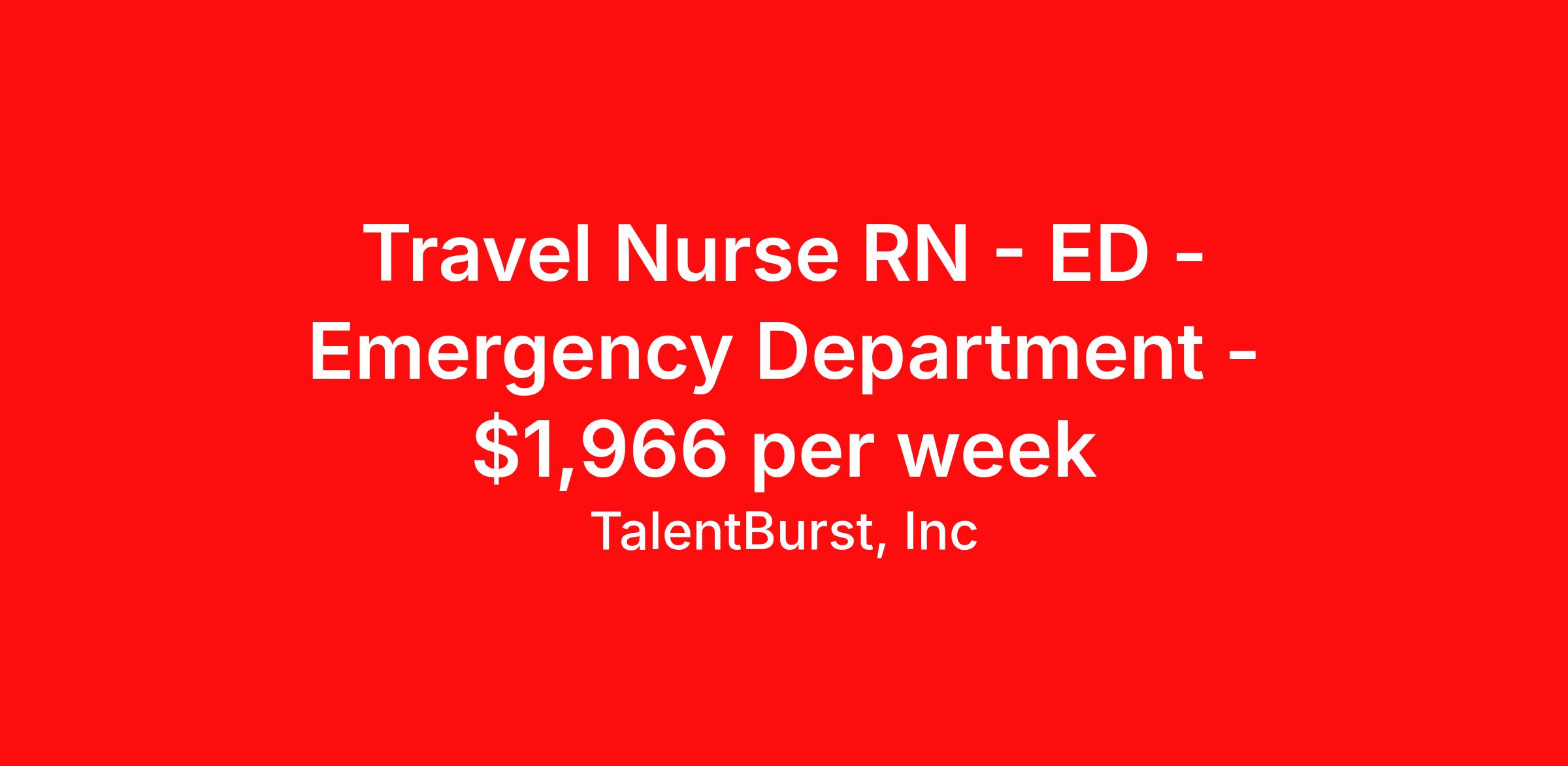 TalentBurst, Inc is seeking a travel nurse RN ED - Emergency Department for a travel nursing job in San Marcos, Texas. Job Description & Requirements Specialty: ED - Emergency Department Discipline: RN Start Date: 04/27/2026 Duration: 12 weeks 36 hours per week Shift: 12 hours, nights Employment Type: Travel Travel: RN - Emergency Room San Marcos, TX 13 weeks Shift - Nights 6p-6a FLOAT between 4 ED's and Inpatient (IMC/ICU by appropriate experience and level of care). Floating is volume dependent. Job Requirements: Education/Skills Bachelor of Science Degree in Nursing, preferred Experience 1 year of experience in the related nursing specialty preferred Licenses, Registrations, or Certifications Current BLS certification required (AHA only) Current ACLS certification required (AHA only) Current PALS certification required (AHA only) Current TNCC certification required RN License in state of TX or compact Experience One year of experience in a related nursing specialty preferred. Work Schedule: 6PM - 6AM 12 HR Shift TB_RN ZRHC Talent Burst Job ID 26-07500. Pay package is based on 12 hour shifts and 36 hours per week (subject to confirmation) with tax-free stipend amount to be determined. Posted job title: Travel: RN-ER About TalentBurst, Inc TalentBurst Health & Life Sciences is an established provider of healthcare workforce solutions, servicing healthcare facilities across the United States for over 15 years. As a Joint Commission Certified Agency, our commitment to quality, integrity, and exceptional service has made us a trusted name in the healthcare staffing landscape. Our mission is to bridge the gap between healthcare professionals seeking fulfilling opportunities and healthcare organizations striving to maintain their high standards of care. We are committed to providing top-notch healthcare professionals with access to facilities where they can focus on delivering exceptional patient care and thrive. Whether you're a nurse, allied health professional, or administrative personnel, we have the expertise to match your skills and aspirations with the perfect placement.