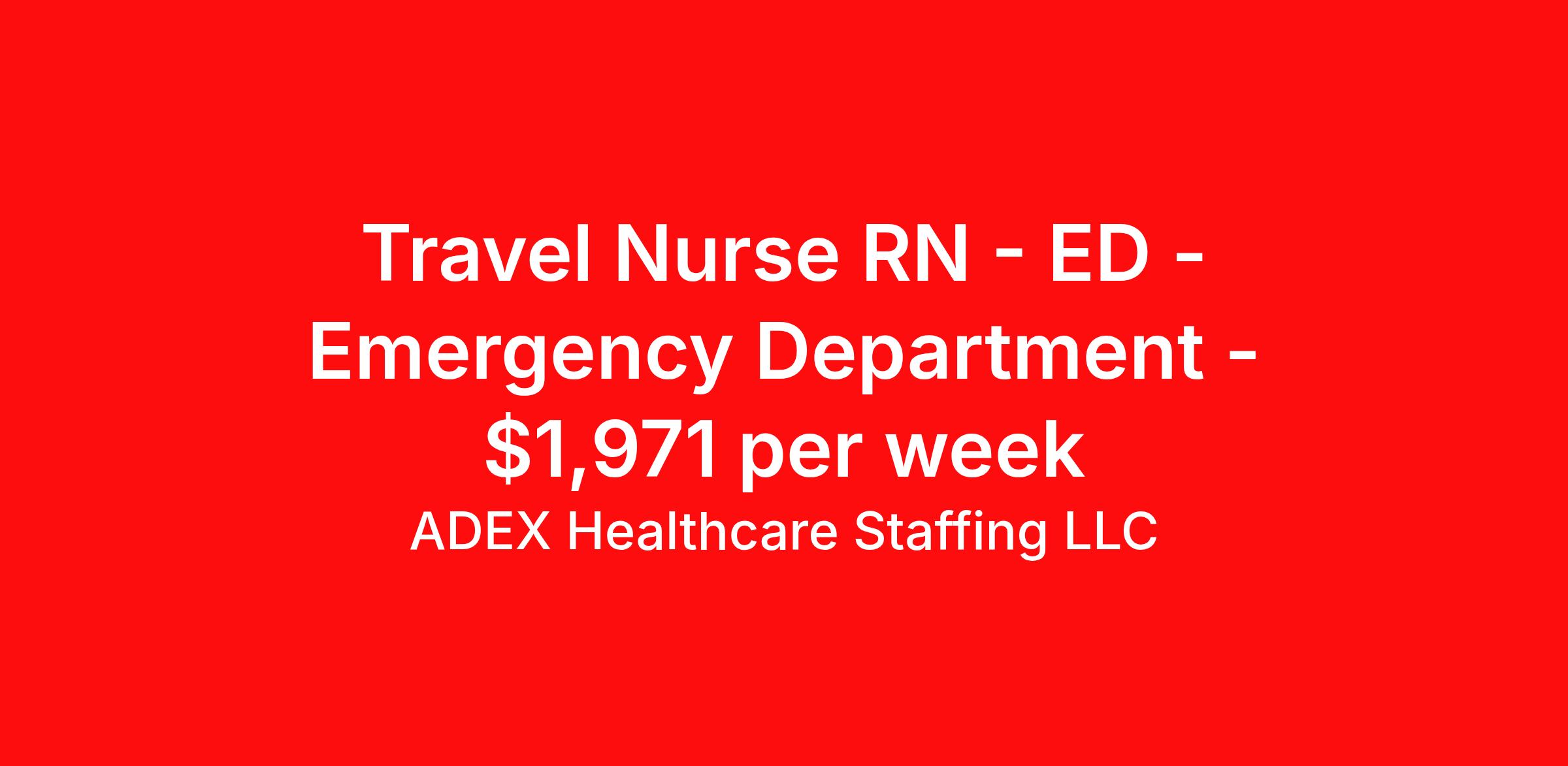 ADEX Healthcare Staffing LLC is seeking a travel nurse RN ED - Emergency Department for a travel nursing job in San Marcos, Texas. Job Description & Requirements Specialty: ED - Emergency Department Discipline: RN Start Date: 04/13/2026 Duration: 13 weeks 36 hours per week Shift: 12 hours, nights Employment Type: Travel RN Position Job Notes: Travel or Local Registered Nurse needed for ASAP start. A minimum of 2 years of recent hospital bedside experience is required. Candidates must be able to start within 5 weeks. Opportunity for extension upon successful completion of the initial assignment. $750 referral bonus available. Opportunity: RN - ED ER Job Details: • Work 12-hour night shifts from 6:00 PM to 6:00 AM • Full-time position • Float between 4 Emergency Departments and Inpatient units (IMC/ICU based on experience and level of care) • Floating assignments are volume dependent • Provide routine and complex nursing care utilizing the nursing process • Address psychological, emotional, cultural, and social needs of patients and families • Administer medications and treatments using appropriate protocols • Monitor for side effects and treatment effectiveness • Document patient history, symptoms, medications, and care provided • Assess learning needs and provide patient/family education • Bachelor of Science Degree in Nursing preferred • One year of experience in related nursing specialty preferred • Current BLS certification required (AHA only) • Current ACLS certification required (AHA only) • Current PALS certification required (AHA only) • Current TNCC certification required • RN License in state of TX or compact required • Must attend New Nurses Orientation within first 30 days • Complete Emergency Department-specific competency validation • Complete all annual competency verification requirements Facility: This healthcare organization operates multiple emergency departments and inpatient units, providing comprehensive medical care across various specialties. The facility maintains high standards for nursing practice and offers structured orientation programs for new hires, including specialized competency validation for emergency department staff. The organization emphasizes quality patient care and professional development through ongoing education and competency requirements. Location: San Marcos, TX San Marcos offers a vibrant college town atmosphere situated between Austin and San Antonio, providing easy access to major metropolitan areas while maintaining a friendly, community-focused environment. The area features beautiful natural attractions including the San Marcos River and numerous parks, making it an ideal location for healthcare professionals seeking both career opportunities and recreational activities. Adex Job ID 995147. Pay package is based on 12 hour shifts and 36 hours per week (subject to confirmation) with tax-free stipend amount to be determined. About ADEX Healthcare Staffing LLC ADEX has been placing healthcare professionals across the US since 2004. Originally founded in Atlanta, GA, the company's headquarters are now located in Tampa, FL. JCAHO certified since 2009. Benefits Referral bonus