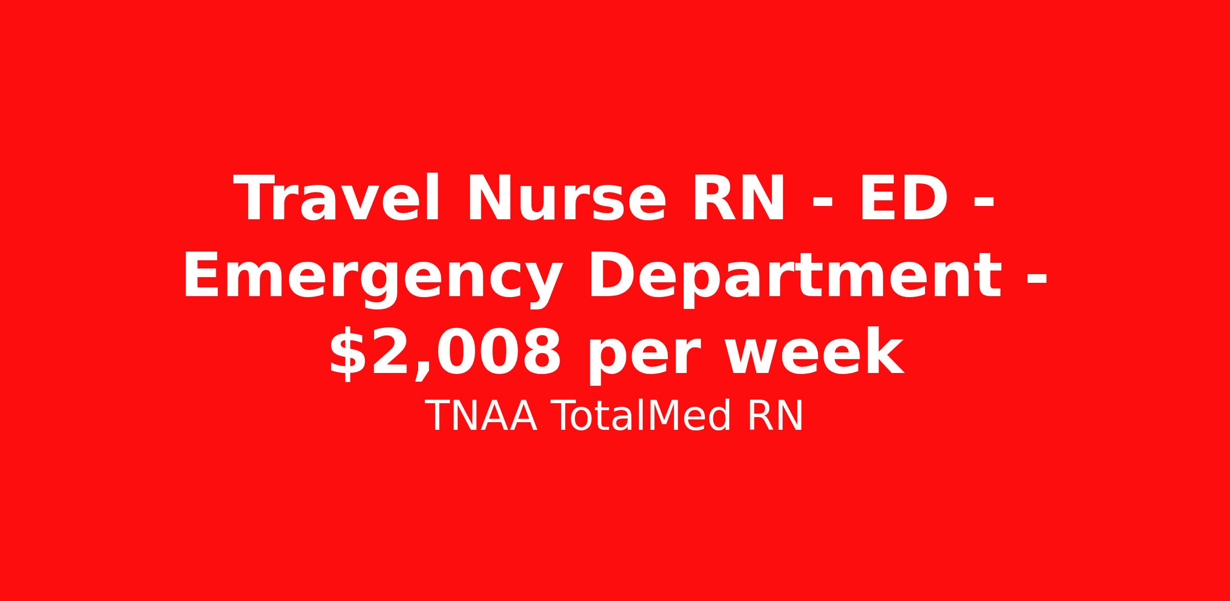 TNAA TotalMed RN is seeking a travel nurse RN ED - Emergency Department for a travel nursing job in Sigourney, Iowa. Job Description & Requirements Specialty: ED - Emergency Department Discipline: RN Start Date: 04/13/2026 Duration: 12 weeks 34 hours per week Shift: 12 hours, nights Employment Type: Travel We're looking for Emergency Room RNs for an immediate travel nurse opening in Sigourney, IA. The right RN should have 1-2 years recent acute care experience. Read below for more requirements. As an ER Travel Nurse, you will work with a diverse team of caregivers to appropriately evaluate, triage and implement care using correct procedures and physician instructions. RNs should have experience and skill caring for patients in a fast-paced, urgent and emergency environment. Emergency Room RNs will perform minor medical operations, advise patients and family on illnesses or injuries, and plan long-term care needs. Other responsibilities as an ER Travel Nurse include documenting medical history, checking for any allergies patients might have, obtaining patient vital signs, and monitoring patients' emotional and physical well-being. As an ER Travel Nurse, you should be prepared to perform the following tasks: Provide basic bedside care. Clean and bandage wounds. Provide IV therapy. Maintain supplies and medical equipment. Report suspected abuse to appropriate agencies. ER Travel Nurses should be able to stand and walk for long periods of time, as well as bend, lean and stoop without difficulty. RNs should be able to easily lift 20 pounds. Moving or lifting of patients may require lifting of up to 50 pounds at times. Because of the fast-paced environment, Emergency Room RNs must possess good skills for coping with stress and be able to relate to people of all ages and backgrounds. Requirements*: BLS, PALS, ACLS, TNCC, 2 Years * Additional certifications may be required before beginning an assignment. TotalMed Travel Job ID 1395902. Pay package is based on 12 hour shifts and 34 hours per week (subject to confirmation) with tax-free stipend amount to be determined. Posted job title: Emergency Room - ER RN - Travel Nurse About TNAA TotalMed RN TotalMed is a Top Ten, travel nursing and healthcare staffing agency with the mission of igniting purpose in healthcare. The organization staffs nurses, therapists, pharmacists, and other clinicians of all specialties in all 50 states. They offer local and travel jobs and match caregivers with the right organization to assist both facilities and patients. As an organization, they focus on putting highly-skilled staff into facilities to ensure adequate staffing for a better patient experience. TotalMed specializes in recruiting and placing healthcare professionals in travel, PRN, and permanent positions across the country in Nursing and Allied Health. Throughout 2020, the organization filled roles at even the most short-staffed facilities during the most challenging time in healthcare. By matching the right travel healthcare professional with the right organization, TotalMed continues to offer a lifeline to facilities and their patients. Benefits Weekly pay Guaranteed Hours Continuing Education 401k retirement plan Sick pay Wellness and fitness programs Referral bonus Employee assistance programs Medical benefits Dental benefits Vision benefits Benefits start day 1