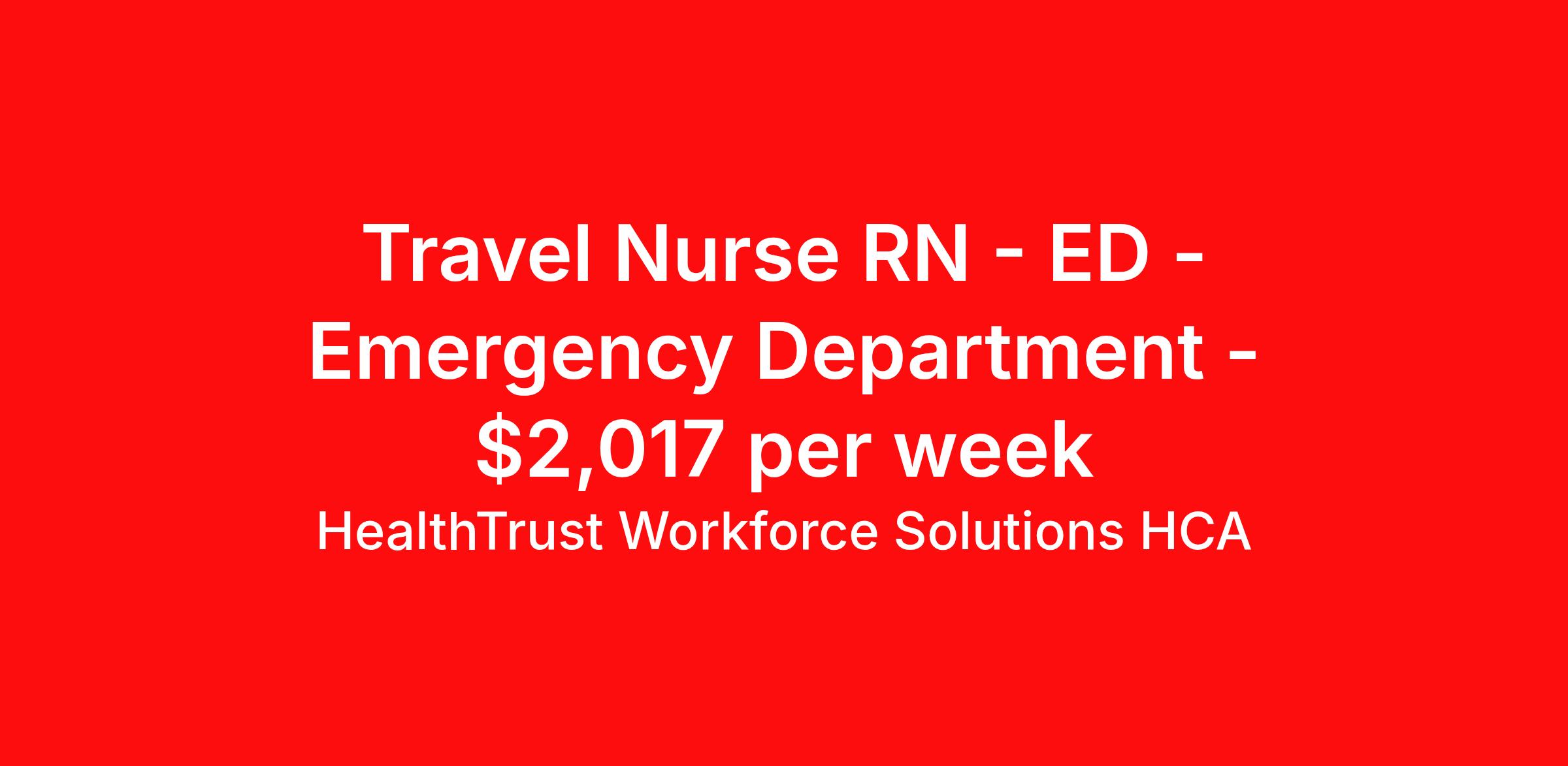 HealthTrust Workforce Solutions HCA is seeking a travel nurse RN ED - Emergency Department for a travel nursing job in Gainesville, Florida. Job Description & Requirements Specialty: ED - Emergency Department Discipline: RN Start Date: 04/20/2026 Duration: 13 weeks 36 hours per week Shift: 12 hours, evenings, nights Employment Type: Travel About HealthTrust Workforce Solutions HCA At HealthTrust Workforce Solutions, healthcare is not just about the four walls of a facility but about the people who provide and receive care. Our focus is on empowering healthcare professionals to deliver exceptional patient experiences by providing them with the necessary skills, tools, and support. We partner with healthcare facilities nationwide to ensure that the right professionals are in the right roles. We prioritize our clinicians by giving them a voice and access to opportunities to fulfill their mission of improving lives by providing quality patient care. We are committed to our core values of Trust, Innovation, Adaptability, Courage, and Accountability. We are dedicated to positively impacting the healthcare industry by providing first-priority access to more than 200,000 jobs nationwide to our healthcare professionals. Join us and be part of the HealthTrust family, where you can make a difference every day. We embrace our changing environment, and we maintain a culture that has a rich tradition of transforming itself to meet the challenges of the future. MISSION STATEMENT While putting great people in the right roles is essential, our mission is far greater. We want our clinicians to be part of the HealthTrust family, where healthcare professionals have a voice and are empowered with the right tools and opportunities to fulfill their personal mission of improving lives. Plus, as a preferred partner to thousands of top-performing hospitals, we provide our healthcare professionals with first-priority access to more than 200,000 jobs nationwide. Benefits Dental benefits Vision benefits Referral bonus Continuing Education Life insurance