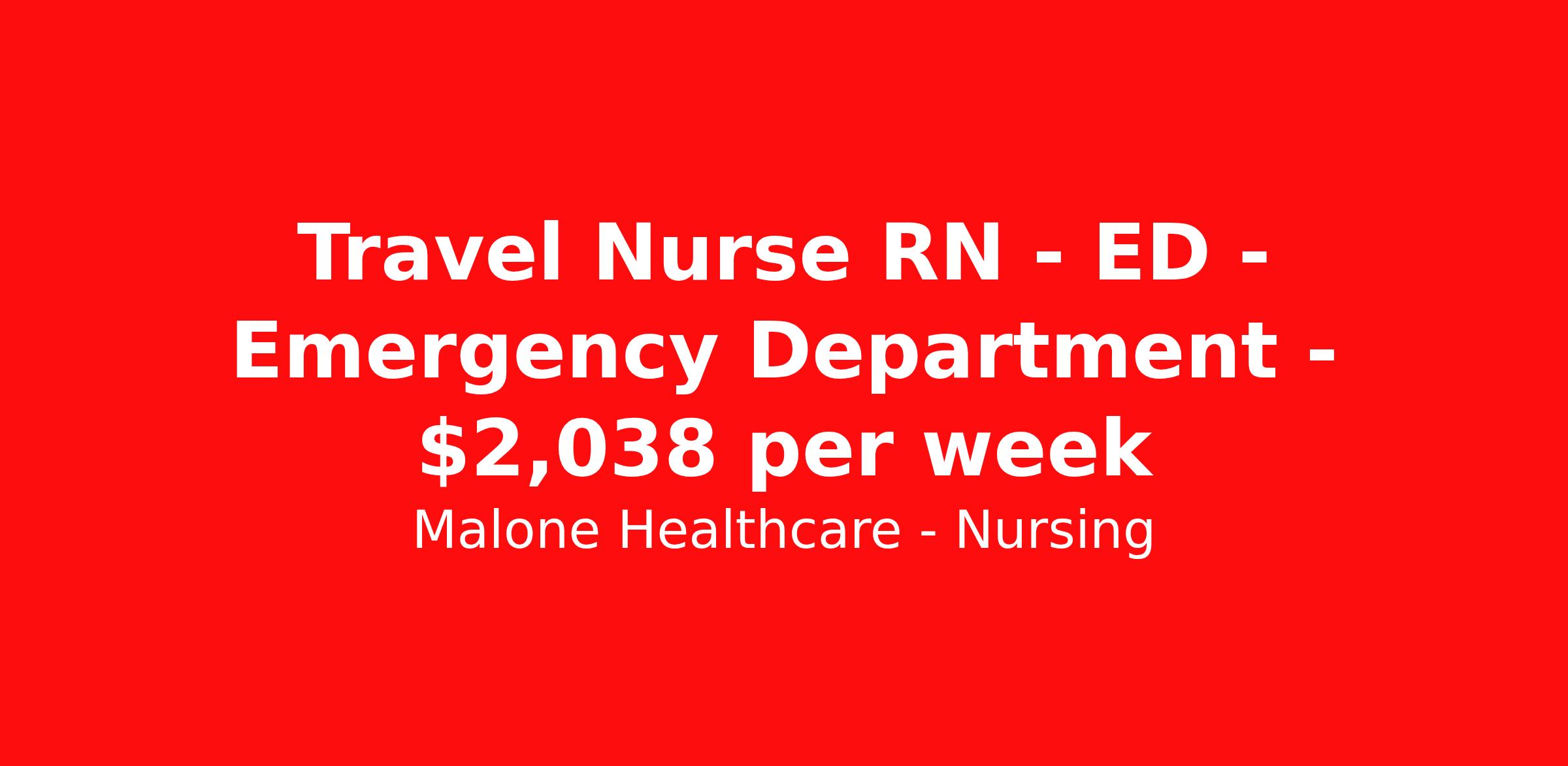 Malone Healthcare - Nursing is seeking a travel nurse RN ED - Emergency Department for a travel nursing job in Greenville, Ohio. Job Description & Requirements Specialty: ED - Emergency Department Discipline: RN Start Date: 04/10/2026 Duration: 13 weeks 36 hours per week Shift: 12 hours, nights Employment Type: Travel Shift: Evenings/Nights Patient Ratio: 3:1 Orientation Hours: Flexible Charting System: T-System Scrub Color: Royal Blue Additional Notes: Rural community hospital; not a designated trauma center. About Malone Healthcare - Nursing With a commitment to providing a higher standard of service and experience in patient care, Malone Healthcare places expert nurses and allied health professionals in rewarding careers throughout the United States. As a leading healthcare staffing agency, Malone’s focus on compliance and integrity translates to a seamless experience for our team members and partner facilities. When you work with Malone Healthcare, you can rely on over 50 years of proven experience placing exceptional professionals in quality healthcare settings. Benefits Weekly pay Holiday Pay Guaranteed Hours Continuing Education 401k retirement plan Pet insurance Referral bonus Medical benefits Dental benefits Vision benefits License and certification reimbursement Life insurance