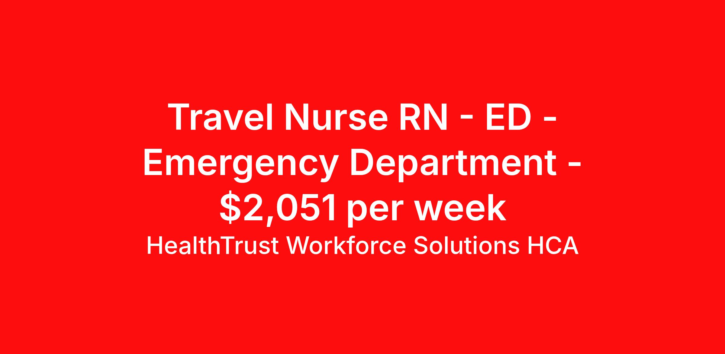 HealthTrust Workforce Solutions HCA is seeking a travel nurse RN ED - Emergency Department for a travel nursing job in Gainesville, Florida. Job Description & Requirements Specialty: ED - Emergency Department Discipline: RN Duration: 13 weeks 36 hours per week Shift: 12 hours, days Employment Type: Travel Call/Text anytime! - Chelsea with Healthtrust- ( 954) 412-7519 Now Hiring! Experienced ED Nurse for Travel Nursing Opportunity in St. Pete, FL! Looking for the next career move? We have a great opportunity for a travel contract! Also accepting Locals => Message me for local contract rate! ~ Add this one to your Resume ~ Benefits of working with HealthTrust Competitive Pay Rates Priority Offers Responsive Recruiter Weekly Direct Deposits Guaranteed Hours Dental benefits Vision benefits Earn up to $750 for referrals Continuing Education Life insurance Recruiter -Chelsea - Call/Text anytime! - *Previous PCU RN with bedside experience, ready to assist you with all of your next contract needs! About HealthTrust Workforce Solutions HCA At HealthTrust Workforce Solutions, healthcare is not just about the four walls of a facility but about the people who provide and receive care. Our focus is on empowering healthcare professionals to deliver exceptional patient experiences by providing them with the necessary skills, tools, and support. We partner with healthcare facilities nationwide to ensure that the right professionals are in the right roles. We prioritize our clinicians by giving them a voice and access to opportunities to fulfill their mission of improving lives by providing quality patient care. We are committed to our core values of Trust, Innovation, Adaptability, Courage, and Accountability. We are dedicated to positively impacting the healthcare industry by providing first-priority access to more than 200,000 jobs nationwide to our healthcare professionals. Join us and be part of the HealthTrust family, where you can make a difference every day. We embrace our changing environment, and we maintain a culture that has a rich tradition of transforming itself to meet the challenges of the future. MISSION STATEMENT While putting great people in the right roles is essential, our mission is far greater. We want our clinicians to be part of the HealthTrust family, where healthcare professionals have a voice and are empowered with the right tools and opportunities to fulfill their personal mission of improving lives. Plus, as a preferred partner to thousands of top-performing hospitals, we provide our healthcare professionals with first-priority access to more than 200,000 jobs nationwide. Benefits Dental benefits Vision benefits Referral bonus Continuing Education Life insurance