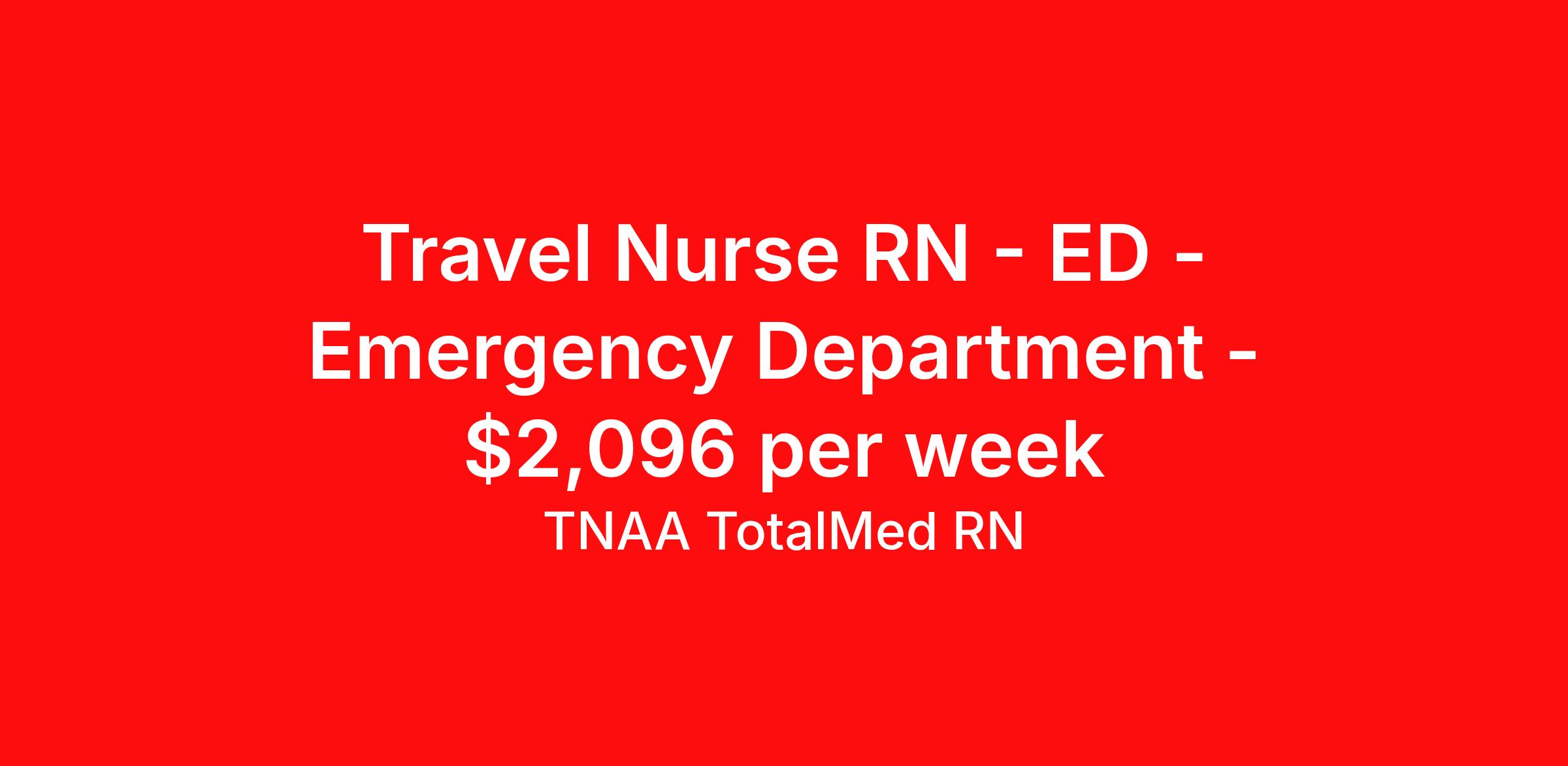 TNAA TotalMed RN is seeking a travel nurse RN ED - Emergency Department for a travel nursing job in Globe, Arizona. Job Description & Requirements Specialty: ED - Emergency Department Discipline: RN Start Date: 04/13/2026 Duration: 13 weeks 36 hours per week Shift: 12 hours, nights Employment Type: Travel We're looking for Emergency Room RNs for an immediate travel nurse opening in Globe, AZ. The right RN should have 1-2 years recent acute care experience. Read below for more requirements. As an ER Travel Nurse, you will work with a diverse team of caregivers to appropriately evaluate, triage and implement care using correct procedures and physician instructions. RNs should have experience and skill caring for patients in a fast-paced, urgent and emergency environment. Emergency Room RNs will perform minor medical operations, advise patients and family on illnesses or injuries, and plan long-term care needs. Other responsibilities as an ER Travel Nurse include documenting medical history, checking for any allergies patients might have, obtaining patient vital signs, and monitoring patients' emotional and physical well-being. As an ER Travel Nurse, you should be prepared to perform the following tasks: Provide basic bedside care. Clean and bandage wounds. Provide IV therapy. Maintain supplies and medical equipment. Report suspected abuse to appropriate agencies. ER Travel Nurses should be able to stand and walk for long periods of time, as well as bend, lean and stoop without difficulty. RNs should be able to easily lift 20 pounds. Moving or lifting of patients may require lifting of up to 50 pounds at times. Because of the fast-paced environment, Emergency Room RNs must possess good skills for coping with stress and be able to relate to people of all ages and backgrounds. Requirements*: BLS, ACLS, PALS, TNCC, 3 Years * Additional certifications may be required before beginning an assignment. TotalMed Travel Job ID 1395615. Pay package is based on 12 hour shifts and 36 hours per week (subject to confirmation) with tax-free stipend amount to be determined. Posted job title: Emergency Room - ER RN - Travel Nurse About TNAA TotalMed RN TotalMed is a Top Ten, travel nursing and healthcare staffing agency with the mission of igniting purpose in healthcare. The organization staffs nurses, therapists, pharmacists, and other clinicians of all specialties in all 50 states. They offer local and travel jobs and match caregivers with the right organization to assist both facilities and patients. As an organization, they focus on putting highly-skilled staff into facilities to ensure adequate staffing for a better patient experience. TotalMed specializes in recruiting and placing healthcare professionals in travel, PRN, and permanent positions across the country in Nursing and Allied Health. Throughout 2020, the organization filled roles at even the most short-staffed facilities during the most challenging time in healthcare. By matching the right travel healthcare professional with the right organization, TotalMed continues to offer a lifeline to facilities and their patients. Benefits Weekly pay Guaranteed Hours Continuing Education 401k retirement plan Sick pay Wellness and fitness programs Referral bonus Employee assistance programs Medical benefits Dental benefits Vision benefits Benefits start day 1