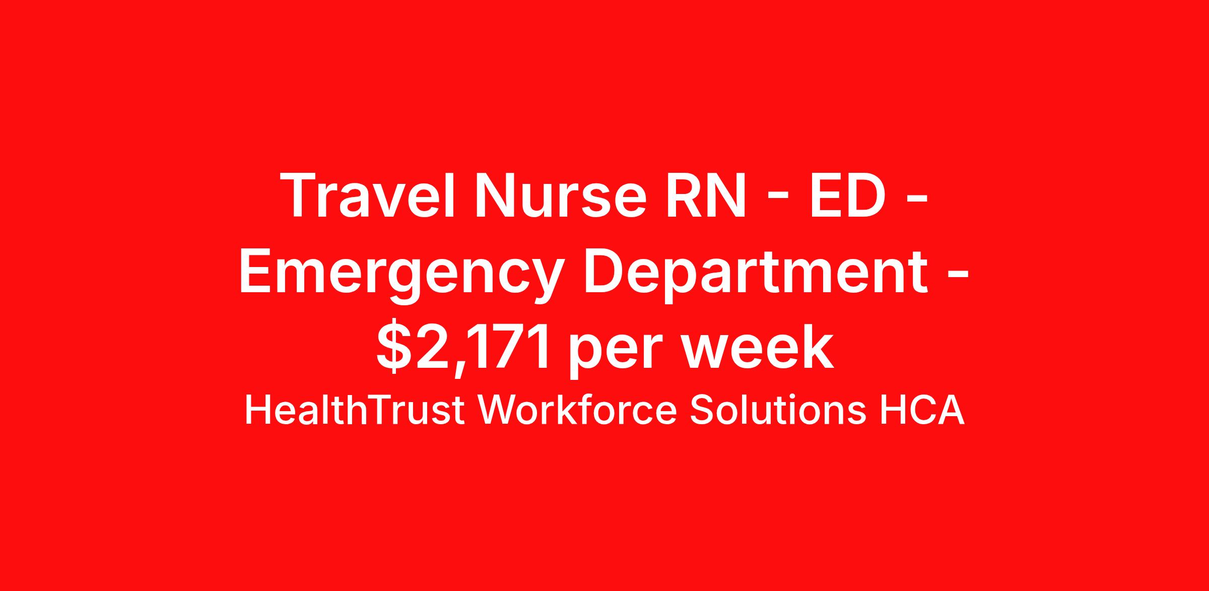 HealthTrust Workforce Solutions HCA is seeking a travel nurse RN ED - Emergency Department for a travel nursing job in Asheville, North Carolina. Job Description & Requirements Specialty: ED - Emergency Department Discipline: RN Start Date: 03/30/2026 Duration: 13 weeks 36 hours per week Shift: 12 hours, days Employment Type: Travel Hospital: Mission Location: Emergency Dept. Address: 509 Biltmore Avenue Unit Name: ER Building: Mission Hospital Cost Center: 780 General Information Unit Specifics: · Number of Beds : 101 · Patient Ratios : 4:1 typically- medical, up to 7:1 on ED behavioral holds · Unit staffing description- Techs available- work in cardiac monitoring unit and the internal processing area, triage, Unit clerks days and nights · Type of equipment : baxter pumps, GE monitors · Documentation system: Cerner · Scheduling requirements: Every other weekend, can’t commit to block scheduling, scheduling must meet the needs of the dept. · Floating policy: No floating outside of the ED but must be open to floating to all sections in the ED. · Patient Experience requirements: AIDET, Respectful behavior, Pt Experience to each patient, Boards updated with info and pt updated throughout visit Hospital Specifics- · Certifications: ACLS before starting date on hire BLS before starting date on hire PALS before starting date on hire TNCC before starting date on hire CPI before starting date on hire NIHSS before starting date on hire ENPC within 90 days of hire Hiring profile Requested Skill Set: 2 years’ experience in Level 2 trauma center, comprehensive stroke center, high volume > 100,000 visit ED. Previous HCA experience preferred. Must have : 2 years’ experience as a nurse with at least 1-year experience in ER setting, teamwork mentality, ability to coach and give feedback in real time. Flexibility to work in all areas of the ED. David Leavitt | Team Lead, Travel Recruiter HealthTrust Workforce Solutions | 1400 Dr Martin L King Jr Blvd Suite 1400 | Nashville, TN 37203 o: | e: healthtrustjobs.com | healthtrustpg.com/workforce Connect with me: www.linkedin.com/in/david-leavitt About HealthTrust Workforce Solutions HCA At HealthTrust Workforce Solutions, healthcare is not just about the four walls of a facility but about the people who provide and receive care. Our focus is on empowering healthcare professionals to deliver exceptional patient experiences by providing them with the necessary skills, tools, and support. We partner with healthcare facilities nationwide to ensure that the right professionals are in the right roles. We prioritize our clinicians by giving them a voice and access to opportunities to fulfill their mission of improving lives by providing quality patient care. We are committed to our core values of Trust, Innovation, Adaptability, Courage, and Accountability. We are dedicated to positively impacting the healthcare industry by providing first-priority access to more than 200,000 jobs nationwide to our healthcare professionals. Join us and be part of the HealthTrust family, where you can make a difference every day. We embrace our changing environment, and we maintain a culture that has a rich tradition of transforming itself to meet the challenges of the future. MISSION STATEMENT While putting great people in the right roles is essential, our mission is far greater. We want our clinicians to be part of the HealthTrust family, where healthcare professionals have a voice and are empowered with the right tools and opportunities to fulfill their personal mission of improving lives. Plus, as a preferred partner to thousands of top-performing hospitals, we provide our healthcare professionals with first-priority access to more than 200,000 jobs nationwide. Benefits Dental benefits Vision benefits Referral bonus Continuing Education Life insurance